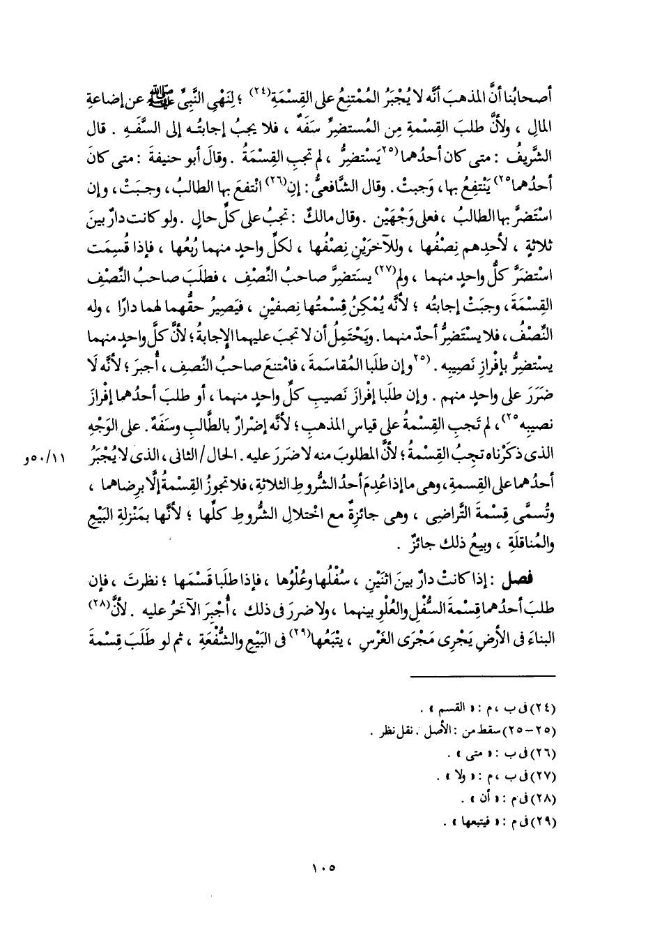 أصحابُنا أنَّ المذهبَ أنَّه لا يُجْبَرُ المُمْتنِعُ على القِسْمَةِ (٢٤)؛ لِنَهْىِ النَّبِيِّ -صَلَّى اللهُ عَلَيْهِ وَسَلَّمَ- عن إضاعةِ المالِ، ولأنَّ طلبَ القِسْمةِ مِن المُستضِرِّ سَفَهٌ، فلا يجبُ إجابتُه إلى السَّفَهِ. قال الشَّريفُ: متى كان أحدُهما [يَسْتضِرُّ، لم تجبِ القِسْمَةُ. وقالَ أبو حنيفةَ: متى كانَ أحدُهما] (٢٥) يَنْتفِعُ بها، وَجبتْ. وقال الشَّافعىُّ: إنِ (٢٦) انْتفعَ بها الطالبُ، وجبَتْ، وإن اسْتَضرَّ بها الطالبُ، فعلى وَجْهَيْن. وقال مالكٌ: تجبُ على كلِّ حالٍ. ولو كانت دارٌ بينَ ثلاثةٍ، لأحدِهم نِصْفُها، وللآخرَيْنِ نِصْفُها، لكلِّ واحدٍ منهما رُبعُها، فإذا قُسِمَت اسْتضَرَّ كلُّ واحدٍ منهما، ولم (٢٧) يسَتضِرَّ صاحبُ النِّصْفِ، فطلَبَ صاحبُ النِّصْفِ القِسْمَةَ، وجبَتْ إجابتُه؛ لأنَّه يُمْكِنُ قِسْمتُها نِصفيْنِ، فيَصِيرُ حقُّهما لهما دارًا، وله النِّصْفُ، فلا يسْتَضِرُّ أحدٌ منهما. ويَحْتَمِلُ أن لا تجبَ عليهما الإجابةُ؛ لأنَّ كلَّ واحدٍ منهما يسْتضِرُّ بإفْرازِ نَصِيبِه. [وإن طلَبا المُقاسَمةَ، فامْتنعَ صاحبُ النِّصفِ، أُجبرَ؛ لأنَّه لَا ضَرَرَ على واحدٍ منهم. وإن طلَبا إفْرازَ نَصيبِ كلِّ واحدٍ منهما، أو طلبَ أحدُهما إفْرازَ نصيبِه] (٢٥)، لم تَجبِ القِسْمةُ على قياسِ المذهبِ؛ لأنَّه إضْرارٌ بالطَّالبِ وسَفَهٌ. على الوَجْهِ الذى ذكَرْناه تجِبُ القِسْمةُ؛ لأنَّ المطلوبَ منه لا ضَررَ عليه. الحال الثاني، الذى لا يُجْبَرُ أحدُهما على القِسمةِ، وهى ما إذا عُدِمَ أحدُ الشُّروطِ الثلاثةِ، فلا تجوزُ القِسْمةُ إلَّا برِضاهما، وتُسمَّى قِسْمةَ التَّراضِى، وهى جائِزةٌ مع اخْتلالِ الشُّروطِ كلِّها؛ لأنَّها بمَنْزلةِ البَيْعِ والمُناقلَةِ، وبيعُ ذلك جائزٌ.