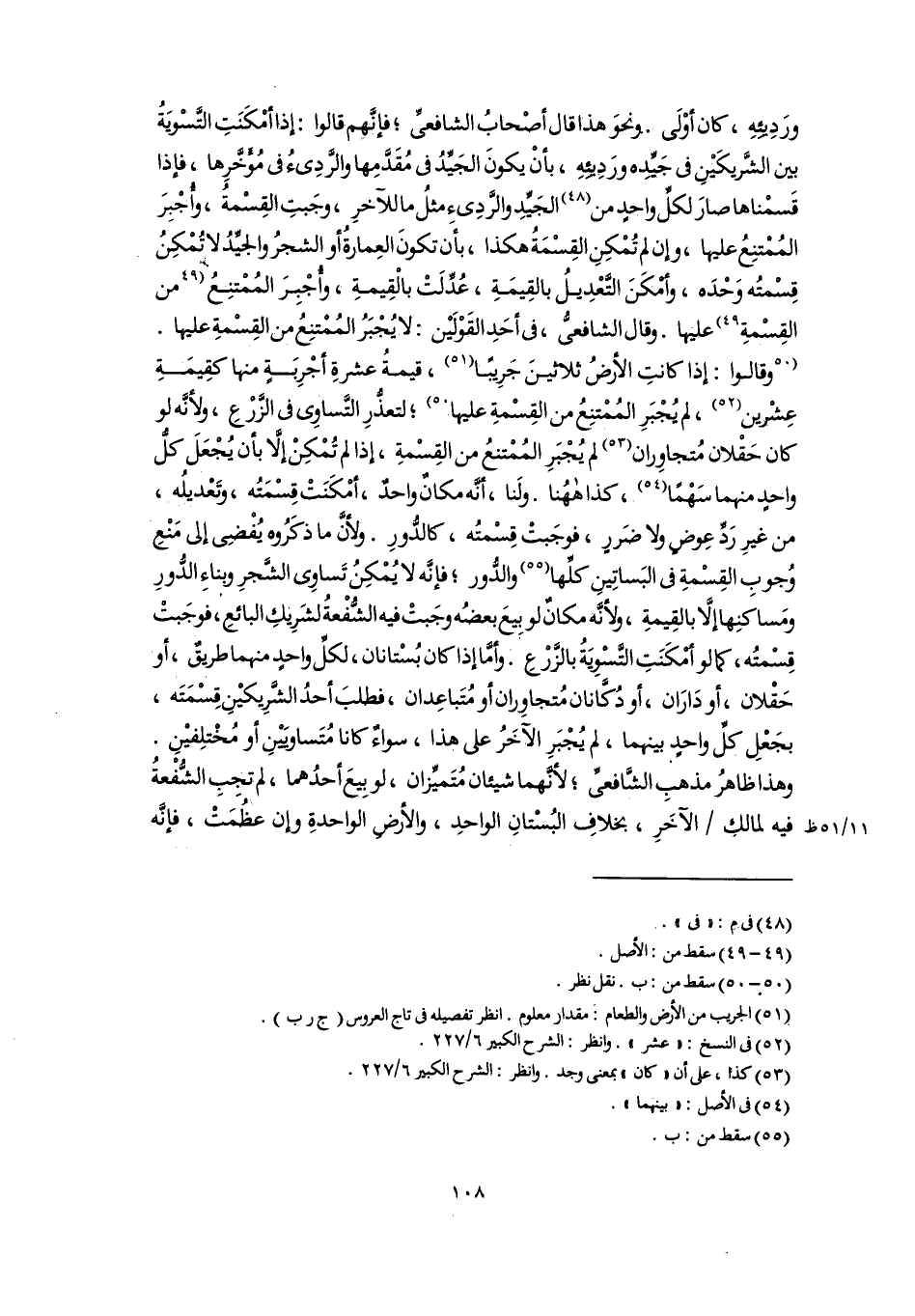 ورَدِيئِهِ، كان أوْلَى. ونحوَ هذا قال أصْحابُ الشافعيِّ؛ فإنَّهم قالوا: إذا أمْكَنَتِ التَّسْويَةُ بين الشَّريكَيْنِ في جَيِّدِه ورَدِيئِهِ، بأنْ يكونَ الجَيِّدُ في مُقَدَّمِها والرَّدِىءُ في مُؤَخَّرِها، فإذا قَسمْناها صارَ لكلِّ واحدٍ من (٤٨) الجَيِّدِ والرَّدِىءِ مثلُ ما للآخرِ، وجَبتِ القِسْمةُ، وأُجْبِرَ المُمْتنِعُ عليها، وإن لم تُمْكِنِ القِسْمَةُ هكذا، بأن تكونَ العِمارةُ أو الشجرُ والجيِّدُ لا تُمْكِنُ قِسْمتُه وَحْدَه، وأمْكَنَ التَّعْدِيلُ بالقِيمَةِ، عُدِّلَتْ بالْقِيمةِ، وأُجْبِرَ المُمْتنِعُ [من القِسْمةِ] (٤٩) عليها. وقال الشافعيُّ، في أحَدِ القَوْلَيْن: لا يُجْبَرُ المُمْتنِعُ من القِسْمةِ عليها. [وقالوا: إذا كانتِ الأرضُ ثلاثينَ جَرِيبًا (٥٠)، قيمةُ عشرةِ أجْرِبَةٍ منها كقِيمَةِ عِشْرين (٥١)، لم يُجْبَرِ المُمْتنِعُ من القِسْمةِ عليها] (٥٢)؛ لتعذُّرِ التَّساوِى في الزَّرْعِ، ولأنَّه لو كان حَقْلان مُتجاوِران (٥٣) لم يُجْبَرِ المُمْتنعُ من القِسْمةِ، إذا لم تُمْكِنْ إلَّا بأن يُجْعَلَ كلُّ واحدٍ منهما سَهْمًا (٥٤)، كذا هاهُنا. ولَنا، أنَّه مكانٌ واحدٌ، أمْكَنَتْ قِسْمَتُه، وتَعْديلُه، من غيرِ رَدِّ عِوضٍ ولا ضَررٍ، فوجَبتْ قِسْمتُه، كالدُّورِ. ولأنَّ ما ذكَرُوه يُفْضِي إلى مَنْعِ وُجوبِ القِسْمةِ في البَساتِينِ كلِّها (٥٥) والدُّور؛ فإنَّه لا يُمْكِنُ تَساوِى الشَّجرِ وبناءِ الدُّورِ ومَساكنِها إلَّا بالقِيمةِ، ولأنَّه مكانٌ لو بيعَ بعضُه وجَبتْ فيه الشُّفْعةُ لشَرِيكِ البائعِ، فوجَبتْ قِسْمتُه، كما لو أمْكَنَتِ التَّسْوِيَةُ بالزَّرْعِ. وأمَّا إذا كان بُسْتانان، لكلِّ واحدٍ منهما طريقٌ، أو حَقْلان، أو دَارَان، أو دُكَّانان مُتجاوِران أو مُتَباعِدان، فطلبَ أحدُ الشَّرِيكيْنِ قِسْمَتَه، بجَعْلِ كلِّ واحدٍ بينهما، لم يُجْبَرِ الآخَرُ على هذا، سواءٌ كانا مُتَساويَيْنِ أو مُخْتلِفيْنِ. وهذا ظاهرُ مذهبِ الشَّافعىِّ؛ لأنَّهما شيئان مُتَميِّزان، لو بِيعَ أحدُهما، لم تجِبِ الشُّفْعةُ فيه لمالك الآخَرِ، بخلافِ البُسْتانِ الواحدِ، والأرضِ الواحدةِ وإن عظُمَتْ، فإنَّه