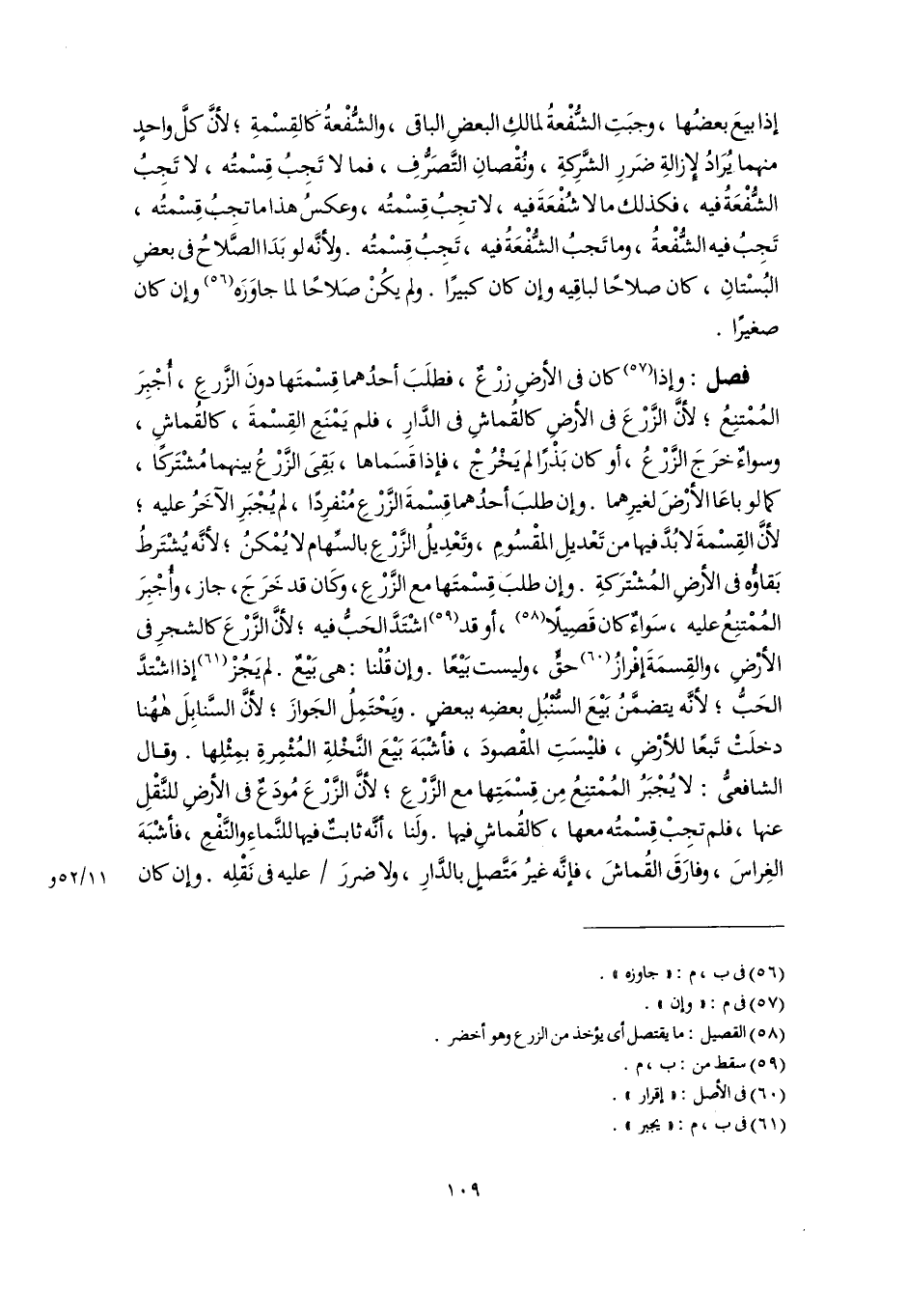 فصل: وإذا (٥٧) كان فى الأرضِ زرْعٌ، فطلَبَ أحدُهما قِسْمتَها دونَ الزَّرعِ، أُجْبِرَ المُمْتنِعُ؛ لأنَّ الزَّرْعَ فى الأرضِ كالقُماشِ فى الدَّارِ، فلم يَمْنَعِ القِسْمةَ، كالقُماشِ، وسواءٌ خرَجَ الزَّرْعُ، أو كان بَذْرًا لم يَخْرُجْ، فإذا قَسَماها، بَقِىَ الزَّرْعُ بينهما مُشْتَركًا، كما لو باعَا الأرْضَ لغيرِهما. وإن طلبَ أحدُهما قِسْمةَ الزَّرْعِ مُنْفرِدًا، لم يُجْبَرِ الآخَرُ عليه؛ لأنَّ القِسْمةَ لا بُدَّ فيها من تَعْديلِ المقْسُومِ، وتَعْدِيلُ الزَّرْعِ بالسِّهام لا يُمْكنُ؛ لأنَّه يُشْتَرطُ بَقاؤُه فى الأرضِ المُشْترَكةِ. وإن طلبَ قِسْمتَها مع الزَّرْعِ، وكَان قد خَرَجَ، جاز، وأُجْبِرَ المُمْتنِعُ عليه، سَواءٌ كان قَصِيلًا (٥٨)، أو قد (٥٩) اشْتَدَّ الحَبُّ فيه؛ لأنَّ الزَّرْعَ كالشجرِ فى الأرْضِ، والقِسمَةَ إفْرازُ (٦٠) حقٍّ، وليست بَيْعًا. وإن قُلْنا: هى بَيْعٌ. لم يَجُزْ (٦١) إذا اشْتدَّ الحَبُّ؛ لأنَّه يتضمَّنُ بَيْعَ السُّنْبُلِ بعضِه ببعضٍ. ويَحْتَمِلُ الجَوازَ؛ لأنَّ السَّنابِلَ هاهُنا دخلَتْ تَبعًا للأرْضِ، فليْسَتِ المقْصودَ، فأشْبَهَ بَيْعَ النَّخْلةِ المُثْمِرةِ بمِثْلِها. وقال الشافعىُّ: لا يُجْبَرُ المُمْتنِعُ مِن قِسْمَتِها مع الزَّرْعِ؛ لأنَّ الزَّرْعَ مُودَعٌ فى الأرضِ للنَّقْلِ عنها، فلم تجِبْ قِسْمتُه معها، كالقُماشِ فيها. ولَنا، أنَّه ثابتٌ فيها للنَّماءِ والنَّفْعِ، فأشْبَهَ الغِراسَ، وفارَقَ القُماشَ، فإنَّه غيرُ مَتَّصلٍ بالدَّارِ، ولا ضررَ عليه فى نَقْلِه. وإن كان