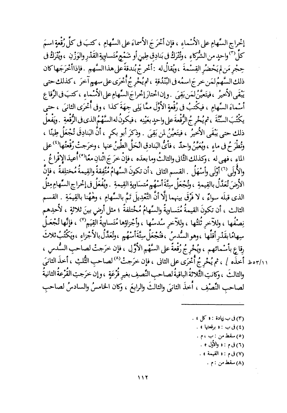 إخْراجِ السِّهامِ على الأسْماءِ، فإن أخْرَجَ الأسماءَ على السِّهامِ، كتبَ فى كلِّ رُقْعةٍ اسمَ كلِّ (٣) واحدٍ من الشُّركاءِ، وتُتْرَكُ فى بَنادِقِ طِينٍ أو شَمْعٍ مُتَساوِيةِ القَدْرِ والوَزْنِ، ويُتْرَكُ فى حِجْرِ مَن لم يَحْضُرِ القِسْمةَ، ويُقالُ له: أخْرجْ بُندقةً على هذا السَّهمِ. فإذا أخْرَجَها كان ذلك السَّهمُ لمَن خرجَ اسمُه فى البُنْدُقةِ، ثم يُخْرِجُ أُخْرَى على سهمٍ آخرَ، كذلك حتى يَبْقَى الأخيرُ، فيتَعيَّنُ لمَن بَقِىَ. وإن اخْتارَ إخْراجَ السِّهامِ على الأسْماءِ، كتبَ فى الرِّقاعِ أسْماءَ السِّهامِ، فيكْتبُ فى رُقْعةٍ الأوَّلَ ممَّا يَلِى جهَةَ كذا، وفى أُخْرَى الثانىَ، حتى يكْتُبَ السِّتَّةَ، ثم يُخْرِجُ الرُّقْعةَ على واحدٍ بعَيْنِه، فيكَونُ له السَّهْمُ الذى فى الرُّقْعةِ. ويَفْعلُ ذلك حتى يَبْقَى الأخيرُ، فيتَعيَّنُ لمن بَقِىَ. وذكرَ أبو بكرٍ، أنَّ البَنادِقَ تُجْعَلُ طِينًا، وتُطرحُ فى ماءٍ، ويُعَيَّنُ واحدٌ، فأىُّ البَنادقِ انْحَلَّ الطِّينُ عنها، وخرَجتْ رُقْعتُها (٤) على الماء، فهى له، وكذلك الثَّانى والثالثُ وما بعدَه، فإنْ خرَجَ اثْنانِ معًا (٥) أُعيدَ الإِقْراعُ. والأُولَى (٦) أوْلَى وأسْهَلُ. القسم الثانى, أن تكونَ السِّهامُ مُتَّفِقةً والقِيمةُ مُختلِفةً، فإنَّ الأرضَ تُعَدَّلُ بالقِيمةِ، وتُجْعَلُ سِتَّةَ أسْهُمٍ مُتسَاويةِ القِيمةِ. ويُفْعَلُ فى إخْراجِ السِّهامِ مِثلُ الذى قبلَه سواءٌ، لا فَرْقَ بينهما إلَّا أنَّ التَّعْدِيلَ تَمَّ بالسِّهامِ، وهاهُنا بالقِيمَةِ. القسم الثالث، أن تكونَ القيمةُ مُتَساويةً والسِّهامُ مُخْتلفةً؛ مثل أرضٍ بينَ ثلاثةٍ، لأحدِهم نِصْفُها، وللآخرِ ثُلثُها، وللآخرِ سُدسُها، وأجْزاؤها مُتَساويةُ القِيَمِ (٧)، فإنَّها تُجْعَلُ سِهامًا بقَدْرِ أقلِّها، وهو السُّدسُ، فتُجْعَلُ سِتَّةَ أسْهُمٍ، وتُعَدَّلُ بالأجْزاءِ، ويَكْتُبُ ثلاثَ رِقاعٍ بأسْمائهم، ويُخْرِجُ رُقْعةً على السَّهْمِ الأوَّلِ، فإن خرَجتْ لصاحبِ السُّدسِ، أخذَه، ثم يُخْرِجُ أُخْرَى على الثانى, فإن خرَجتْ (٨) لصاحبِ الثُّلثِ، أخذَ الثانىَ والثالثَ، وكانتِ الثَّلاثةُ الباقيةُ لصاحبِ النِّصفِ بغيرِ قُرْعَةٍ، وإن خرَجتِ القُرْعةُ الثانيةُ لصاحبِ النِّصْفِ، أَخذَ الثانىَ والثالثَ والرابعَ، وكان الخامسُ والسادسُ لصاحبِ