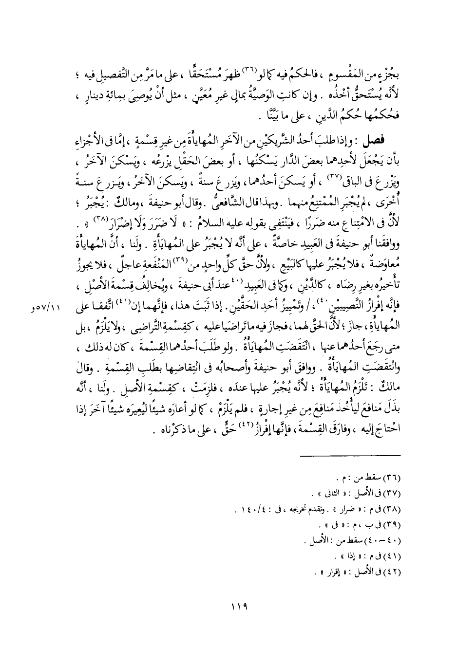 فصل: وإذا طلبَ أحدُ الشَّريكيْنِ من الآخَرِ المُهايأَةَ مِن غيرِ قِسْمةٍ، إمَّا فى الأجْزاءِ بأن يَجْعَلَ لأحدِهما بعضَ الدَّار يَسْكنُها، أو بعضَ الحَقْلِ يزْرعُه، ويَسْكنَ الآخَرُ، ويَزْرعَ فى الباقى (٣٧)، أو يَسكنَ أحدُهما، ويَزرعَ سنةً، ويَسكنَ الآخَرُ، ويَزرعَ سنةً أُخْرَى، لم يُجْبَرِ المُمْتنِعُ منهما. وبهذا قال الشَّافعىُّ. وقال أبو حنيفةَ، ومالكٌ: يُجْبَرُ؛ لأنَّ فى الامْتِناعِ منه ضَررًا، فيَنْتَفِى بقولِه عليه السلامُ: "لَا ضَرَرَ وَلَا إضْرَارَ (٣٨) ". ووافقَنا أبو حنيفةَ فى العَبِيدِ خاصَّةً، على أنَّه لا يُجْبَرُ على المُهايَأَةِ. ولَنا، أنَّ المُهايأَةَ مُعاوَضةٌ، فلا يُجْبَرُ عليها كالبَيْعِ، ولأنَّ حقَّ كلِّ واحدٍ من (٣٩) المَنْفَعةِ عاجلٌ، فلا يجوزُ تأْخيرُه بغيرِ رِضَاه، كالدَّيْنِ، وكما فى العَبِيدِ [عندَ أبى حنيفةَ، ويُخالِفُ قِسْمةَ الأصْلِ، فإنَّه إفْرازُ النَّصِيبيْنِ] (٤٠)، وتَمْيِيزُ أحَدِ الحَقَّيْنِ. إذا ثَبَتَ هذا، فإنَّهما إن (٤١) اتَّفقا على المُهايأَةِ، جازَ؛ لأنَّ الحقَّ لهما، فجازَ فيه ما تَراضَيا عليه، كقِسْمةِ التَّراضِى، ولا يَلْزَمُ، بل متى رجَعَ أحدُهما عنها، انْتَقَضَتِ المُهايَأَةُ. ولو طَلَبَ أحدُهما القِسْمةَ، كان له ذلك، وانْتقَضَتِ المُهايَأَةُ. ووافقَ أبو حنيفةَ وأصحابُه فى انْتِقاضِها بطَلبِ القِسْمةِ. وقال مالكٌ: تَلْزَمُ المُهايَأَةُ. لأنَّه يُجْبَرُ عليها عندَه، فلزِمَتْ، كقِسْمةِ الأصلِ. ولَنا، أنَّه بذَلَ مَنافعَ ليأْخُذ مَنافِعَ مِن غيرِ إجارةٍ، فلم يَلْزَمْ، كما لو أعارَه شيئًا ليُعِيرَه شيئًا آخَرَ إذا احْتاجَ إليه، وفارَقَ القِسْمةَ، فإنَّها إفْرازُ (٤٢) حَقٍّ، على ما ذكرْناه.