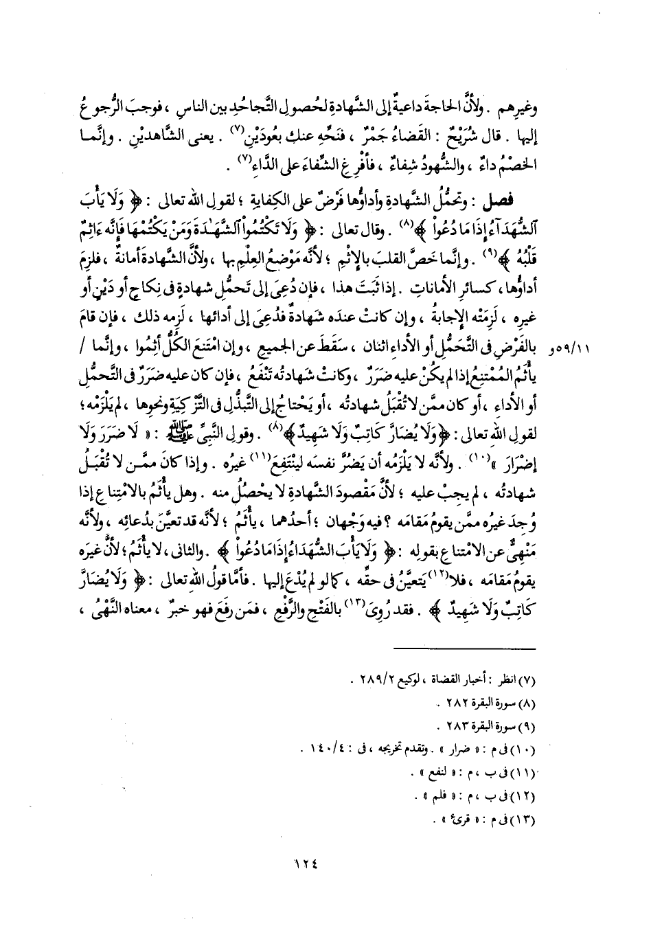 فصل: وتحمُّلُ الشَّهادةِ وأداؤُها فَرْضٌ على الكِفايةِ؛ لقولِ اللَّه تعالى: {وَلَا يَأْبَ الشُّهَدَاءُ إِذَا مَا دُعُوا} (٨). وقال تعالى: {وَلَا تَكْتُمُوا الشَّهَادَةَ وَمَنْ يَكْتُمْهَا فَإِنَّهُ آثِمٌ قَلْبُهُ} (٩). وإنَّما خَصَّ القلبَ بالإِثْمِ؛ لأنَّه مَوْضعُ العِلْمِ بها، ولأنَّ الشَّهادةَ أمانةٌ، فلزِمَ أداؤُها، كسائرِ الأماناتِ. إذا ثَبَتَ هذا، فإن دُعِىَ إلى تَحمُّلِ شهادةٍ فى نِكاحٍ أو دَيْنٍ أو غيرِه، لَزِمَتْه الإجابةُ، وإن كانتْ عندَه شَهادةٌ فدُعِىَ إلى أدائها، لَزِمه ذلك، فإن قامَ بالفَرْضِ فى التَّحَمُّلِ أو الأداءِ اثنان، سَقَطَ عن الجميعِ، وإن امْتَنعَ الكُلُّ أثِمُوا، وإنَّما يأْثَمُ المُمْتنِعُ إذا لم يكُنْ عليه ضَرَرٌ، وكانتْ شَهادتُه تَنْفَعُ، فإن كان عليه ضَرَرٌ فى التَّحمُّلِ أو الأداءِ، أو كان ممَّن لا تُقْبَلُ شهادتُه، أو يَحْتاجُ إلى التَّبذُّلِ فى التَّزْكِيَةِ ونحوِها، لم يَلْزَمْه؛ لقولِ اللهِ تعالى: {وَلَا يُضَارَّ كَاتِبٌ وَلَا شَهِيدٌ} (٨). وقولِ النَّبِىِّ -صَلَّى اللهُ عَلَيْهِ وَسَلَّمَ-: "لَا ضَرَرَ وَلَا إضْرَارَ" (١٠). ولأنَّه لا يَلْزَمُه أن يَضُرَّ نفسَه لينْتَفِعَ (١١) غيرُه. وإذا كانَ ممَّن لا تُقْبَلُ شهادتُه، لم يجِبْ عليه؛ لأنَّ مَقْصودَ الشَّهادةِ لا يحْصُلُ منه. وهل يأْثَمُ بالامْتِناعِ إذا وُجِدَ غيرُه ممَّن يقومُ مَقامَه؟ فيه وَجْهان؛ أحدُهما، يأْثَمُ؛ لأنَّه قد تعيَّنَ بدُعائِه، ولأنَّه مَنْهِىٌّ عن الامْتناعِ بقولِه: {وَلَا يَأْبَ الشُّهَدَاءُ إِذَا مَا دُعُوا}. والثانى، لا يأْثَمُ؛ لأنَّ غيرَه يقومُ مَقامَه، فلا (١٢) يَتعيَّنُ فى حقِّه، كما لو لم يُدْعَ إليها. فأمَّا قولُ اللهِ تعالى: {وَلَا يُضَارَّ كَاتِبٌ وَلَا شَهِيدٌ}. فقد رُوِىَ (١٣) بالفَتْحِ والرَّفْعِ، فمَن رفَعَ فهو خبرٌ، معناه النَّهْىُ،