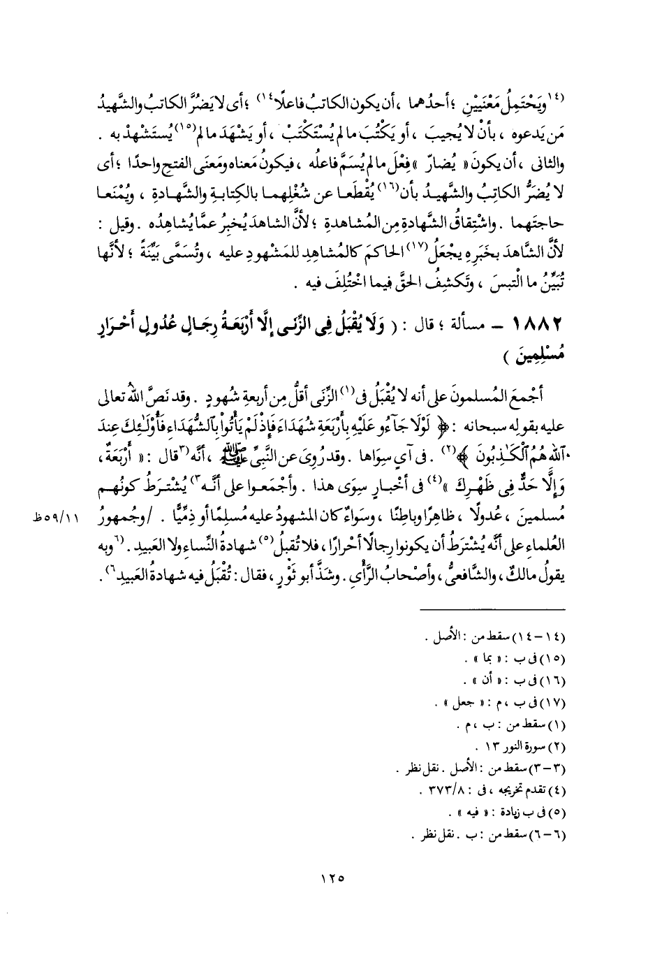 أجْمعَ المُسلمونَ على أنه لا يُقْبَلُ فى (١) الزِّنَى أقلُّ مِن أربعةِ شُهودٍ. وقد نَصَّ اللهُ تعالى عليه بقولِه سبحانه: {لَوْلَا جَاءُوا عَلَيْهِ بِأَرْبَعَةِ شُهَدَاءَ فَإِذْ لَمْ يَأْتُوا بِالشُّهَدَاءِ فَأُولَئِكَ عِنْدَ اللَّهِ هُمُ الْكَاذِبُونَ} (٢). فى آىٍ سِوَاها. وقد رُوِىَ عن النَّبِىِّ -صَلَّى اللهُ عَلَيْهِ وَسَلَّمَ-، أنَّه [قال: "أَربَعَةٌ، وَإلَّا حَدٌّ فِى ظَهْرِكَ" (٣) فى أخْبارٍ سِوَى هذا. وأجْمَعوا على أنَّه] (٤) يُشْترَطُ كونُهم مُسلمينَ، عُدولًا، ظاهِرًا وباطِنًا، وسَواءٌ كان المشهودُ عليه مُسلِمًا أو ذِمِّيًّا. وجُمهورُ العُلماءِ على أنَّه يُشْترَطُ أن يكونوا رِجالًا أحْرارًا، فلا تُقبلُ (٥) شهادةُ النِّساءِ ولا العَبيدِ. [وبه يقولُ مالكٌ، والشَّافعىُّ، وأصْحابُ الرَّأْىِ. وشَذَّ أبو ثَوْرٍ، فقال: تُقْبَلُ فيه شهادةُ العَبيدِ] (٦).