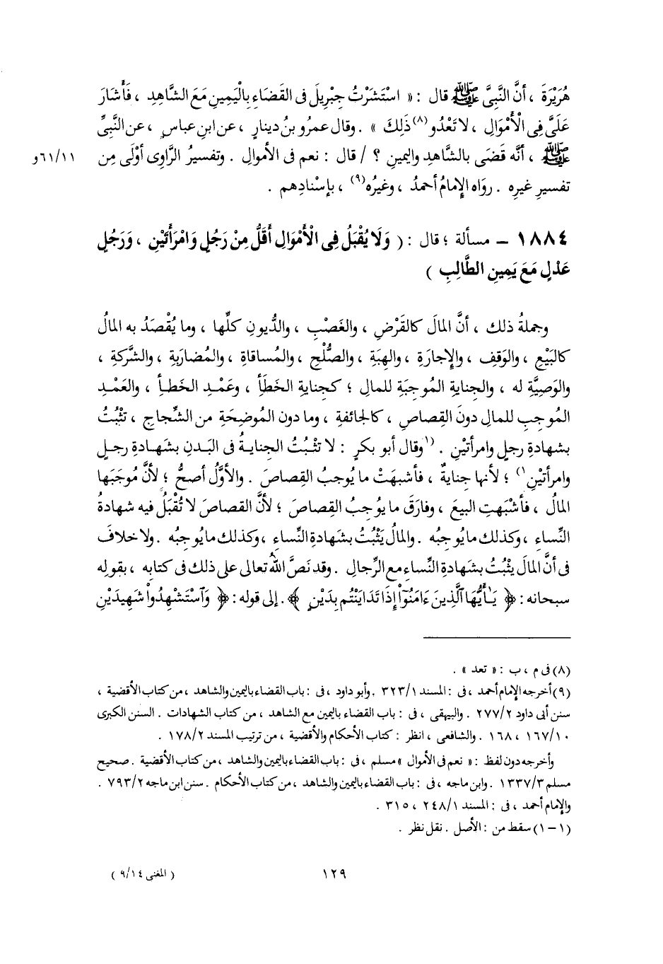 هُرَيْرَةَ، أنَّ النَّبِىَّ -صَلَّى اللهُ عَلَيْهِ وَسَلَّمَ- قال: "اسْتَشَرْتُ جِبْرِيلَ فى القَضَاءِ بِالْيَمِينِ مَعَ الشَّاهِدِ، فَأشَارَ عَلَىَّ فِى الأمْوَالِ، لا تَعْدُو (٨) ذَلِكَ". وقال عمرُو بنُ دينارٍ، عن ابنِ عباسٍ، عن النَّبِىِّ -صَلَّى اللهُ عَلَيْهِ وَسَلَّمَ-، أنَّه قَضَى بالشَّاهدِ واليمينِ؟ قال: نعم فى الأموالِ. وتفسيرُ الرَّاوِى أوْلَى مِن تفسيرِ غيرِه. روَاه الإمامُ أحمدُ، وغيرُه (٩)، بإسْنادِهم.
