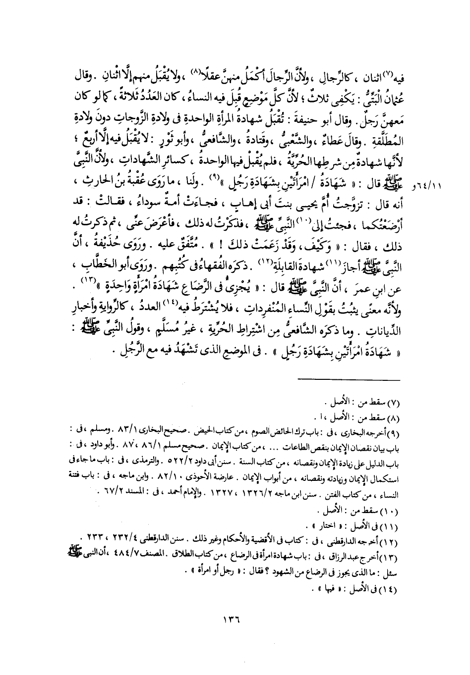 (١٣) أخرج عبد الرزاق، فى: باب شهادة امرأة فى الرضاع، من كتاب الطلاق. المصنف ٧/ ٤٨٤، أن النبى -صَلَّى اللهُ عَلَيْهِ وَسَلَّمَ- سئل: ما الذى يجوز فى الرضاع من الشهود؟ فقال: "رجل أو امرأة".