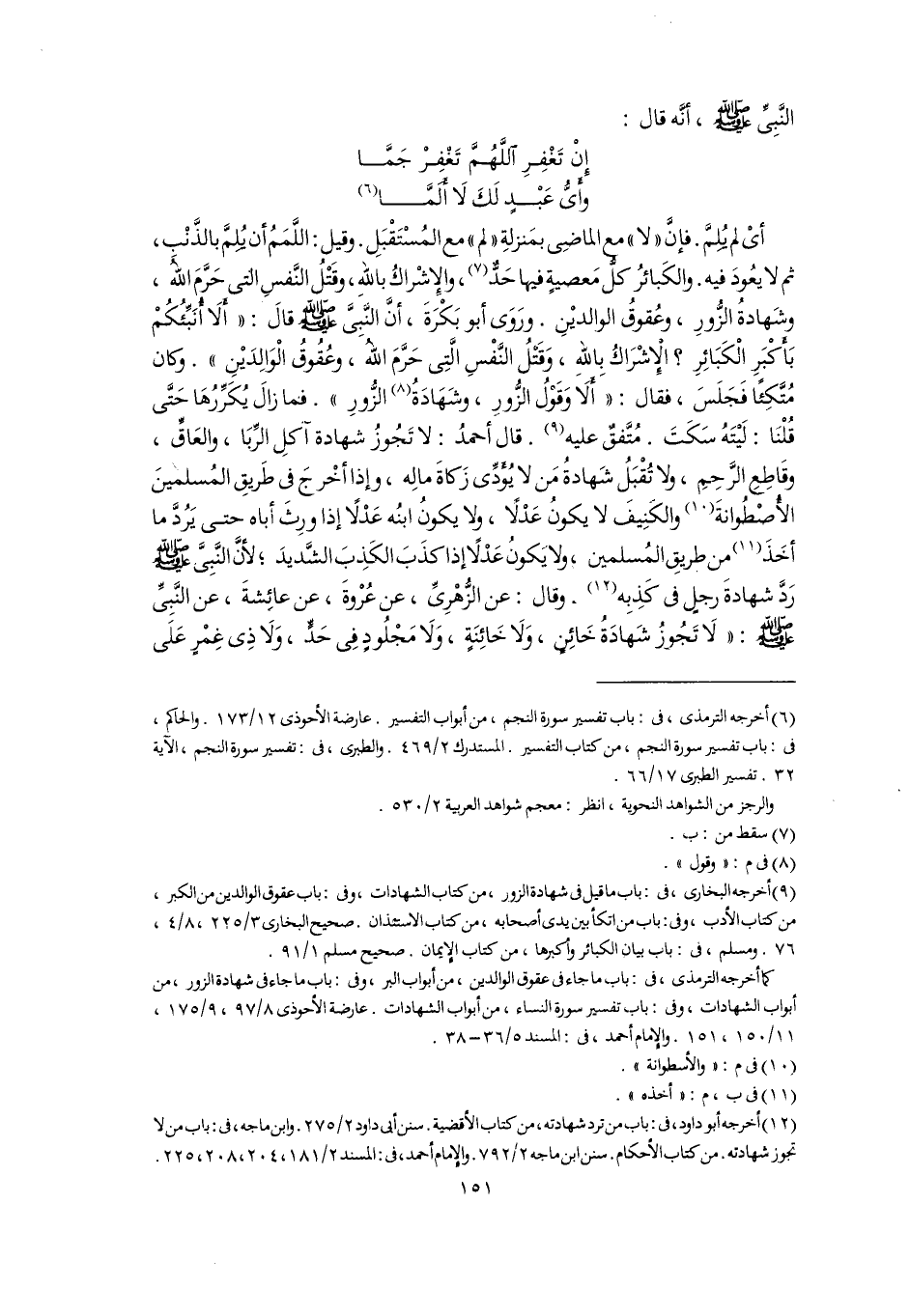 (٩) أخرجه البخارى، فى: باب ما قيل فى شهادة الزور، من كتاب الشهادات، وفى: باب عقوق الوالدين من الكبر، من كتاب الأدب، وفى: باب من اتكأ بين يدى أصحابه، من كتاب الاستئذان. صحيح البخارى ٣/ ٢٢٥، ٨/ ٤، ٧٦. ومسلم، فى: باب بيان الكبائر وأكبرها، من كتاب الإيمان. صحيح مسلم ١/ ٩١.