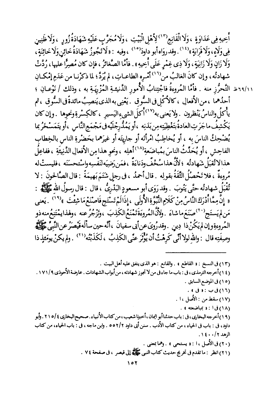 أَخِيهِ فِى عَدَاوَةٍ، وَلَا الْقَانِعِ (١٣) لِأهْلِ الْبَيْتِ، وَلَا مُجَرَّبٍ عَلَيْهِ شَهَادَةُ زُورٍ، وَلَا ظَنِينٍ فِى وَلَاءٍ، وَلَا قَرَابَةٍ" (١٤). وقد روَاه أبو داودَ (١٥)، وفيه: "لَا تَجُوزُ شَهَادَةُ خَائِنٍ وَلَا خَائِنَةٍ، وَلَا زَانٍ وَلَا زَانِيَةٍ، وَلَا ذِى غِمْرٍ عَلَى أَخِيهِ". فأمَّا الصَّغائرُ، فإن كان مُصِرًّا عليها، رُدَّتْ شهادتُه، وإن كانَ الغالبُ من (١٦) أمْرِه الطاعاتِ، لم يُرَدَّ؛ لما ذكرْنا من عَدَمِ إمْكانِ التَّحرُّزِ منه. فأمَّا المُروءةُ فاجْتِنابُ الأُمورِ الدَّنيئةِ المُزْرِيَةِ به، وذلك نَوْعانِ؛ أحدُهما، من الأفعالِ، كالأكْلِ فى السُّوقِ. يَعْنِى به الذى يَنصِبُ مائدةً فى السُّوقِ، ثم يأْكلُ والناسُ يَنْظرون. ولا يَعنى به (١٧) أَكلَ الشىءِ اليَسيرِ، كالكِسْرةِ ونحوِها. وإن كان يَكْشِفُ ما جَرَتِ العادةُ بتَغْطِيَتِه مِن بَدَنِه، أو يَمُدُّ رِجْلَيْه فى مَجْمَعِ النَّاسِ، أو يتَمَسْخرُ بما يُضْحِكُ الناسَ بِه، أو يُخاطِبُ امْرأتَه أو جارِيتَه أو غيرَهما بحَضْرةِ الناسِ بالخِطابِ الفاحِشِ، أو يُحَدِّثُ الناسَ بمُباضَعةِ (١٨) أهلِه، ونحوِ هذا مِن الأفعالِ الدَّنِيئَةِ، ففاعِلُ هذا لا تُقبَلُ شَهادتُه؛ لأنَّ هذا سُخْفٌ ودَناءَةٌ، فمَن رَضِيَه لنَفْسِه واستحسَنَه، فليستْ له مُروءةٌ، فلا تَحْصُلُ الثِّقَةُ بقولِه. قال أحمدُ، فى رجلٍ شَتَمَ بَهيمَةً: قال الصَّالحونَ: لا تُقْبَلُ شهادتُه حتَّى يَتُوبَ. وقد رَوَى أبو مسعودٍ البَدْرِىُّ، قال: قال رسولُ اللهِ -صَلَّى اللهُ عَلَيْهِ وَسَلَّمَ-: "إِنَّ مِمَّا أدْرَكَ النَّاسُ مِنْ كَلَامِ النُّبُوَّةِ الأُولَى، إذَا لَمْ تَسْتَحِ فَاصْنَعْ مَا شِئْتَ" (١٩). يَعنى مَن لم يَستَحِ (٢٠) صَنَعَ ما شاءَ. ولأنَّ المُروءَةَ تَمْنَعُ الكَذِبَ، وتَزْجُرُ عنه، ولهذا يمْتَنِعُ منه ذو المُروءةِ وإن لم يَكُنْ ذا دِينٍ. وقد رُوىَ عن أبى سفيانَ، أنَّه حين سألَه قَيْصَرُ عن النَّبِىِّ -صَلَّى اللهُ عَلَيْهِ وَسَلَّمَ- وصِفَتِه قال: واللهِ لولا أنِّى كَرِهْتُ أن يُؤْثَرَ عنِّى الكَذِبُ، لَكَذَبْتُه (٢١). ولم يكنْ يومَئذٍ ذا
