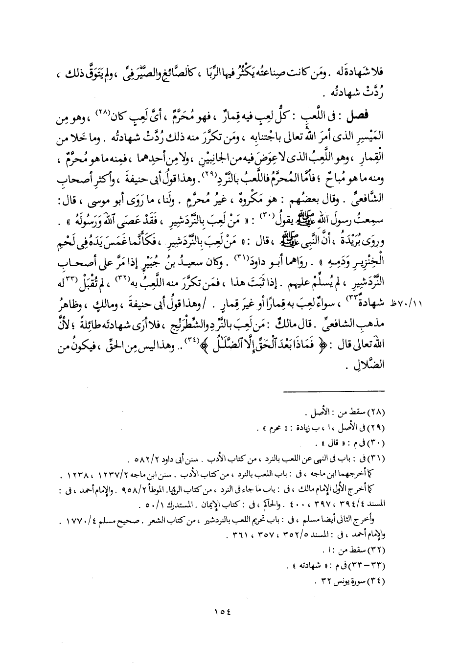 فصل: فى اللَّعبِ: كلُّ لعِبٍ فيه قِمارٌ، فهو مُحَرَّمٌ، أىَّ لَعِبٍ كان (٢٨)، وهو مِن المَيْسِرِ الذى أمرَ اللَّهُ تعالى باجْتنابِه، ومَن تكرَّرَ منه ذلك رُدَّتْ شهادتُه. وما خَلا من الْقِمارِ، وهو اللَّعِبُ الذى لا عِوَضَ فيه من الجانِبيْنِ، ولا مِن أحدِهما، فمِنه ما هو مُحرَّمٌ، ومنه ما هو مُباحٌ؛ فأمَّا المُحرَّمُ فاللَّعبُ بالنَّرْدِ (٢٩). وهذا قولُ أبى حنيفةَ، وأكثرِ أصحابِ الشَّافعىِّ. وقال بعضُهم: هو مَكْروهٌ، غيرُ مُحرَّمٍ. ولَنا، ما رَوَى أبو موسى، قال: سمِعتُ رسولَ اللَّهِ -صلى اللَّه عليه وسلم- يقول (٣٠): "مَنْ لَعِبَ بِالنَّرْدَشِيرِ، فَقَدْ عَصَى اللَّهَ وَرَسُولَهُ". وروَى بُرَيْدَةُ، أَنَّ النَّبِى -صلى اللَّه عليه وسلم-، قال: "مَنْ لَعِبَ بِالنَّرْدَشِيرِ، فَكَأَنَّما غَمَسَ يَدَهُ فِى لَحْمِ الْخِنْزِيرِ وَدَمِهِ". روَاهما أبو داودَ (٣١). وكان سعيدُ بنُ جُبَيْرٍ إذا مَرَّ على أصحابِ النَّرْدَشِيرِ، لم يُسلِّمْ عليهم. إذا ثَبَتَ هذا، فمَن تكرَّرَ منه اللَّعِبُ به (٣٢)، لم تُقْبَلْ [له شهادةٌ] (٣٣)، سواءٌ لعِبَ به قِمارًا أو غيرَ قِمارٍ. وهذا قولُ أبى حنيفةَ، ومالكٍ، وظاهرُ مذهبِ الشافعىِّ. قال مالكٌ: مَن لَعِبَ بالنَّرْدِ والشِّطرَنْجِ، فلا أرَى شهادتَه طائِلةً؛ لأنَّ اللَّهَ تعالى قال: {فَمَاذَا بَعْدَ الْحَقِّ إِلَّا الضَّلَالُ} (٣٤). وهذا ليس مِن الحقِّ، فيكونُ من الضَّلالِ.