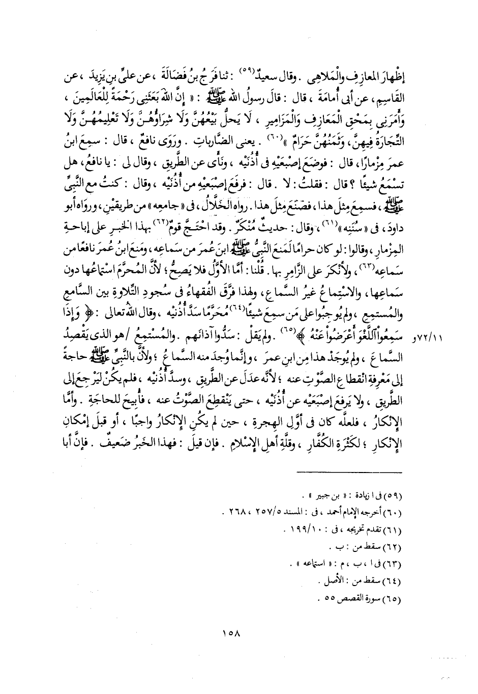 إظْهارَ المعازِفِ والْمَلاهِى. وقال سعيدٌ (٥٩): ثنا فَرَجُ بنُ فَضَالَةَ، عن علىِّ بنِ يَزِيدَ، عن القَاسِمِ، عن أبى أُمامَةَ، قال: قالَ رسولُ اللَّه -صلى اللَّه عليه وسلم-: "إِنَّ اللَّهَ بَعَثَنِى رَحْمَةً لِلْعَالَمِينَ، وَأَمَرَنِى بِمَحْقِ الْمَعَازِفِ وَالْمَزَامِيرِ، لَا يَحلُّ بَيْعُهُنَّ وَلَا شِرَاؤُهُنَّ وَلَا تَعْلِيمُهُنَّ وَلَا التِّجَارَةُ فِيهِنَّ، وَثَمَنُهُنَّ حَرَامٌ (٦٠). يعنى الضَّارباتِ. ورَوَى نافعٌ، قال: سمِعَ ابنُ عمرَ مِزْمارًا، قال: فوضَعَ إصْبعَيْهِ فى أُذُنَيْه، ونَأَى عن الطَّريقِ، وقال لى: يا نافعُ، هل تسْمَعُ شيئًا؟ قال: فقلتُ: لا. قال: فرفَعَ إصْبَعيْهِ من أُذُنَيْه، وقال: كنتُ مع النَّبِىِّ -صلى اللَّه عليه وسلم-، فسمِعَ مِثلَ هذا، فصنَعَ مِثلَ هذا. رواه الخَلَّالُ، فى "جامعِه" من طريقيْنِ، وروَاه أبو داودَ، فى "سُنَنِه" (٦١)، وقال: حديثٌ مُنْكَرٌ. وقد احْتَجَّ قومٌ (٦٢) بهذا الخبرِ على إباحةِ المِزْمارِ، وقالوا: لو كان حرامًا لَمَنعَ النَّبِىُّ -صلى اللَّه عليه وسلم- ابنَ عُمرَ من سَماعِه، وَمَنعَ ابنُ عُمرَ نافعًا من سَماعِه (٦٣)، ولأنْكرَ على الزَّامِرِ بها. قلْنا: أمَّا الأوَّلُ فلا يَصِحُّ؛ لأنَّ المُحرَّمَ اسْتماعُها دون سَماعِها، والاسْتِماع غيرُ السَّماعِ، ولهذا فرَّقَ الفُقهاءُ فى سُجودِ التِّلاوةِ بين السَّامعِ والمُستمِعِ، ولم يُوجِبُوا على مَن سمِعَ شيئًا (٦٤) مُحَرَّمًا سَدَّ أُذُنيْه, وقال اللَّهُ تعالى: {وَإِذَا سَمِعُوا اللَّغْوَ أَعْرَضُوا عَنْهُ} (٦٥). ولم يَقلْ: سَدُّوا آذانَهم. والمُسْتمِعُ هو الذى يَقْصِدُ السَّماعَ، ولم يُوجَدْ هذا مِن ابنِ عمرَ، وإنَّما وُجدَ منه السَّماعُ، ولأنَّ بالنَّبِىِّ -صلى اللَّه عليه وسلم- حاجةً إلى مَعْرِفةِ انْقطاعِ الصَّوْتِ عنه؛ لأَنَّه عدَلَ عن الطَّريقِ، وسدَّ أُذُنيْه، فلم يكُنْ ليَرْجِعَ إلى الطَّريقِ، ولا يَرفعَ إصْبَعَيْه عن أُذُنَيْه، حتى يَنْقطِعَ الصَّوْتُ عنه، فأُبِيحَ للحاجَةِ. وأمَّا الإِنْكارُ، فلعلَّه كان فى أوَّلِ الهِجرةِ، حين لم يكُنِ الإِنْكارُ واجبًا، أو قبلَ إمْكانِ الإِنْكارِ؛ لكَثْرَةِ الكُفَّارِ، وقلَّةِ أهلِ الإِسْلامِ. فإن قيلَ: فهذا الخَبرُ ضَعيفٌ. فإِنَّ أبا