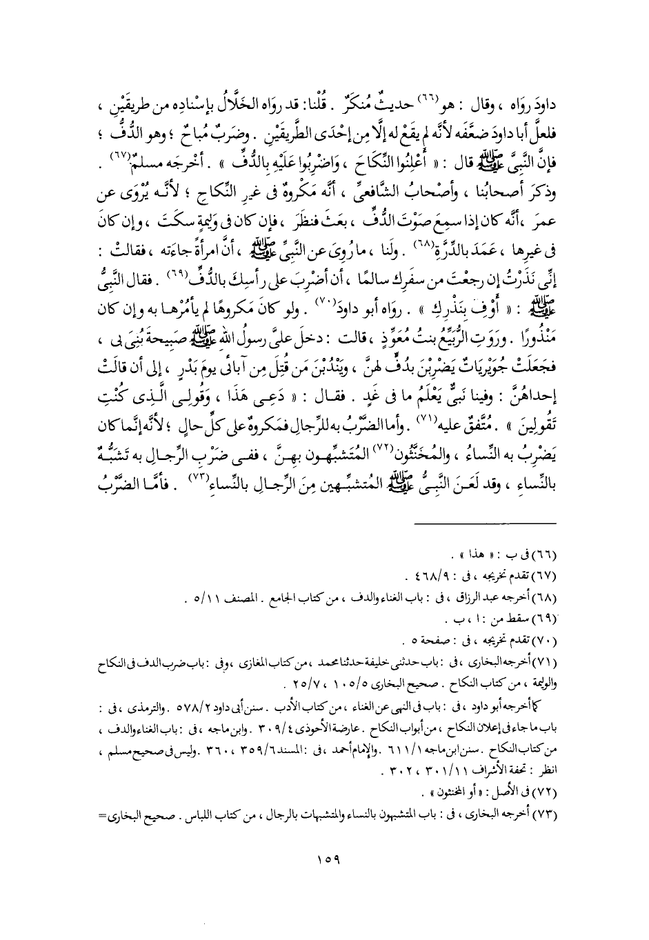 داودَ روَاه، وقال: هو (٦٦) حديثٌ مُنكَرٌ. قُلْنا: قد روَاه الخَلَّالُ بإسْنادِه من طريقَيْنِ، فلعلَّ أبا داودَ ضعَّفَه لأَنَّه لم يقَعْ له إِلَّا مِن إحْدَى الطَّريقَيْنِ. وضَربٌ مُباحٌ؛ وهو الدُّفُّ؛ فإِنَّ النَّبِىَّ -صلى اللَّه عليه وسلم- قال: "أَعْلِنُوا النِّكَاحَ، وَاضْرِبُوا عَلَيْهِ بِالدُّفِّ". أخْرجَه مسلمٌ (٦٧). وذكرَ أصحابُنا، وأصْحابُ الشَّافعىِّ، أنَّه مَكْروهٌ فى غيرِ النِّكاحِ؛ لأَنَّه يُرْوَى عن عمرَ، أنَّه كان إذا سمِعَ صَوْتَ الدُّفِّ، بعَثَ فنظَرَ، فإن كان فى وَليمةٍ سكَتَ، وإن كانَ فى غيرِها، عَمَدَ بالدِّرَّةِ (٦٨). ولَنا، ما رُوِىَ عن النَّبِىِّ -صلى اللَّه عليه وسلم-، أَنَّ امرأةً جاءَته، فقالتْ: إنِّى نَذَرْتُ إن رجعْتَ من سفَرِك سالمًا، أن أضْرِبَ على رأسِكَ بالدُّفِّ (٦٩). فقال النَّبِىُّ -صلى اللَّه عليه وسلم-: "أَوْفِ بِنَذْرِكِ". روَاه أبو داودَ (٧٠). ولو كانَ مَكروهًا لم يأمُرْها به وإن كان مَنْذورًا. ورَوَتِ الرُّبَيِّعُ بنتُ مُعَوِّذٍ، قالت: دخلَ علىَّ رسولُ اللَّهِ -صلى اللَّه عليه وسلم- صبِيحةَ بُنِىَ بى، فجَعَلَتْ جُوَيْريَاتٌ يَضْربنَ بدُفِّ لهنَّ، ويَنْدُبْنَ مَن قُتِلَ مِن آبائى يومَ بَدْرٍ، إلى أن قالَتْ إحداهُنَّ: وفينا نَبىٌّ يَعْلَمُ ما فى غَدٍ. فقال: "دَعِى هَذَا، وَقُولِى الَّذِى كُنْتِ تَقُولِينَ". مُتَّفقٌ عليه (٧١). وأما الضَّرْبُ به للرِّجالِ فمَكروهٌ على كلِّ حالٍ؛ لأَنَّه إنَّما كان يَضْرِبُ به النِّساءُ، والمُخَنَّثُون (٧٢) المُتَشبِّهون بهِنَّ، ففى ضَرْب الرِّجالِ به تَشَبُّهٌ بالنِّساءِ، وقد لَعَنَ النَّبِىُّ -صلى اللَّه عليه وسلم- المُتشبِّهين مِنَ الرِّجالِ بالنِّساءِ (٧٣). فأمَّا الضَّرْبُ