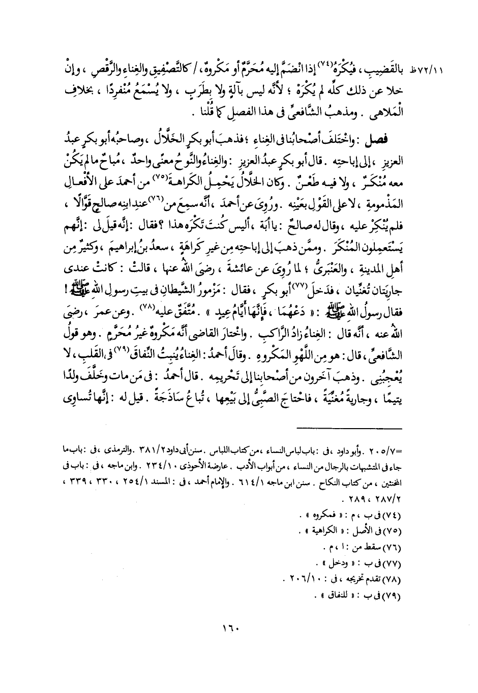 فصل: واخْتَلفَ أصْحابُنا فى الغِناءِ؛ فذهبَ أبو بكرٍ الخَلَّالُ، وصاحبُه أبو بكرٍ عبدُ العزيزِ، إلى إباحتِه. قال أبو بكرٍ عبدُ العزيزِ: والغِناءُ والنَّوحُ معنًى واحدٌ، مُباحٌ ما لم يَكُنْ معه مُنْكَرٌ، ولا فيه طَعْنٌ. وكان الخلَّالُ يَحْمِلُ الكَراهةَ (٧٥) من أحمدَ على الأفعالِ المَذْمومةِ، لا على القَوْلِ بعَيْنِه. ورُوِىَ عن أحمدَ، أنَّه سمِعَ من (٧٦) عندِ ابنِه صالحٍ قَوَّالًا، فلم يُنْكِرُ عليه، وقال له صالحٌ: يا أبَة، أليس كُنتَ تكْرَه هذا؟ فقال: إنَّه قيلَ لى: إنَّهم يَسْتَعمِلون المُنْكَرَ. وممَّن ذهبَ إلى إباحتِه مِن غيرِ كَراهَةٍ، سعدُ بنُ إبراهيمَ، وكثيرٌ مِن أهلِ المدينةِ، والعَنْبَرىُّ؛ لما رُوِىَ عن عائشةَ، رَضِىَ اللَّهُ عنها، قالتْ: كانتْ عندى جارِيَتان تُغنِّيان، فدَخلَ (٧٧) أبو بكرٍ، فقال: مَزْمورُ الشَّيطانِ فى بيتِ رسولِ اللَّهِ -صلى اللَّه عليه وسلم-! فقال رسولُ اللَّهِ -صلى اللَّه عليه وسلم-: "دَعْهُمَا، فَإِنَّهَا أَيَّامُ عِيدٍ". مُتَّفَقٌ عليه (٧٨). وعن عمرَ، رَضِىَ اللَّهُ عنه، أنَّه قال: الغِناءُ زادُ الرَّاكبِ. واخْتارَ القاضى أنَّه مَكْروهٌ غيرُ مُحَرَّمٍ. وهو قولُ الشَّافعىِّ، قال: هو مِن اللَّهْوِ المَكْروهِ. وقالَ أحمدُ: الغِناءُ يُنبِتُ النِّفاقَ (٧٩) فى القَلبِ، لا يُعْجِبُنِى. وذهبَ آخَرون من أصْحابِنا إلى تَحْريمِه. قال أحمدُ: فى مَن مات وخَلَّفَ ولدًا يتيمًا، وجاريةً مُغنِّيَةً، فاحْتاجَ الصَّبِىُّ إلى بَيْعِها، تباعُ سَاذَجَةً. قيل له: إنَّها تُساوِى