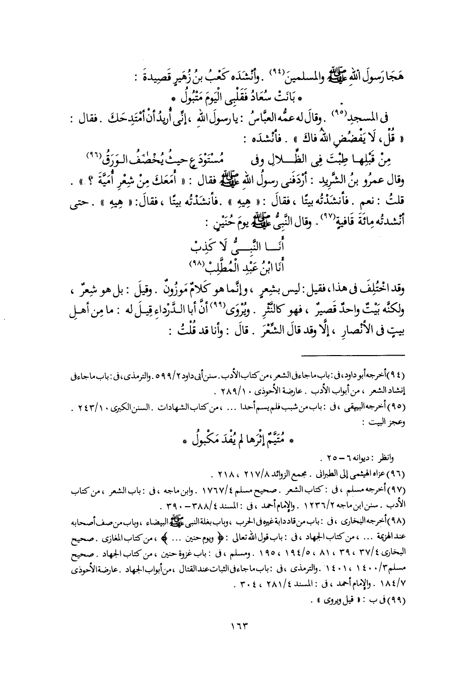 (٩٤) أخرجه أبو داود، فى: باب ما جاء فى الشعر، من كتاب الأدب. سنن أبى داود ٢/ ٥٩٩. والترمذى، فى: باب ما جاء فى إنشاد الشعر، من أبواب الأدب. عارضة الأحوذى ١٠/ ٢٨٩.