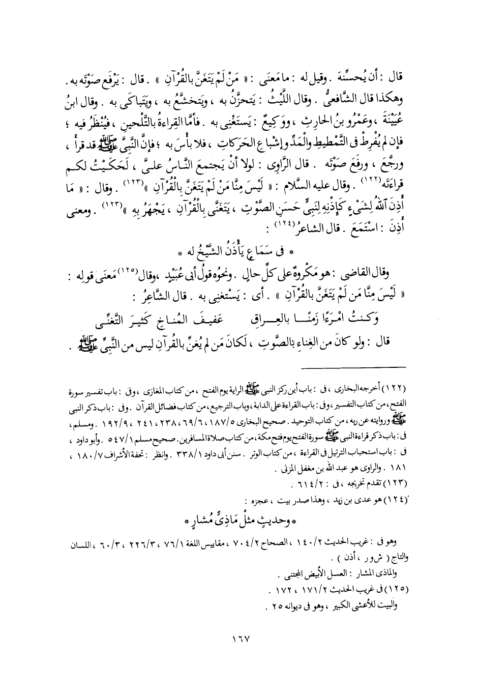 وقال القاضى: هو مَكْروهٌ على كلِّ حالٍ. ونحوُه قولُ أبى عُبَيْدٍ، وقال (١٢٥) مَعنَى قولِه: "لَيْسَ مِنَّا مَن لَمْ يَتَغَنَّ بالقُرْآنِ". أى: يَسْتغنِى به. قال الشَّاعِرُ: