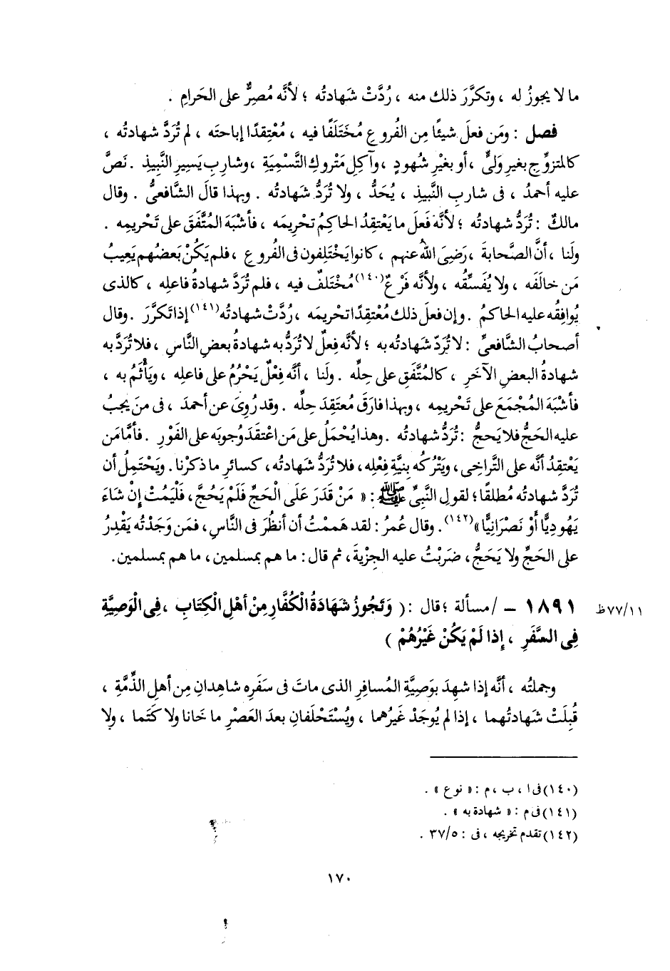 فصل: ومَن فعلَ شيئًا مِن الفُروعِ مُختَلَفًا فيه، مُعْتِقدًا إباحتَه، لم تُرَدَّ شهادتُه، كالمتزوِّجِ بغيرِ وَلىٍّ، أو بغيرِ شُهودٍ، وآكِلِ مَتْروكِ التَّسْمِيَةِ، وشارِبِ يَسِيرِ النَّبِيذِ. نَصَّ عليه أحمدُ، فى شاربِ النَّبيذِ، يُحَدُّ، ولا تُرَدُّ، شَهادتُه. وبهذا قالَ الشَّافعىُّ. وقال مالكٌ: تُرَدُّ شهادتُه؛ لأَنَّه فَعلَ ما يَعْتقِدُ الحاكِمُ تحْرِيمَه، فأشْبَهَ المُتَّفَقَ على تَحْريمِه. ولَنا، أَنَّ الصَّحابةَ، رَضِىَ اللَّهُ عنهم، كانوا يَخْتَلِفون فى الفُروعِ، فلم يَكُنْ بَعضُهم يَعِيبُ مَن خالَفَه، ولا يُفَسِّقُه، ولأنَّه فَرْعٌ (١٤٠) مُخْتَلفٌ فيه، فلم تُرَدَّ شهادةُ فاعلِه، كالذى يوافِقُه عليه الحاكمُ. وإن فعلَ ذلك مُعْتقِدًا تحْريمَه، رُدَّتْ شهادتُه (١٤١) إذا تَكرَّرَ. وقال أصحابُ الشَّافعىِّ: لا تُرَدّ شَهادتُه به؛ لأَنَّه فِعلٌ لا تُرَدُّ به شهادةُ بعضِ النَّاسِ، فلا تُرَدَّ به شهادةُ البعضِ الآخَرِ، كالمُتَّفَقِ على حِلِّه. ولَنا، أنَّه فِعْلٌ يَحْرُمُ على فاعلِه، ويَأْثَمُ به، فأشْبَهَ المُجْمَعَ على تَحْريمِه، وبهذا فارَقَ مُعتَقِدَ حِلِّه. وقد رُوِىَ عن أحمدَ، فى منَ يجبُ عليه الحَجُّ فلا يَحجُّ: تُرَدُّ شهادتُه. وهذا يُحْمَلُ على مَن اعْتقَدَ وُجوبَه على الفَوْرِ. فأمَّا مَن يَعْتقِدُ أنَّه على التَّراخِى، ويَتْرُكُه بِنيَّةِ فِعْلِه، فلا تُرَدُّ شَهادتُه، كسائرِ ما ذكرْنا. ويَحْتَمِلُ أن تُرَدَّ شهادتُه مُطلقًا؛ لقولِ النَّبِىِّ -صلى اللَّه عليه وسلم-: "مَنْ قَدَرَ عَلَى الْحَجِّ فَلَمْ يَحُجَّ، فَلْيَمُتْ إِنْ شَاءَ يَهُودِيًّا أَوْ نَصْرَانِيًّا" (١٤٢). وقال عُمرُ: لقد هَممْتُ أن أنظُرَ فى النَّاسِ، فمَن وَجَدْتُه يَقْدِرُ على الحَجِّ ولا يَحَجُّ، ضَربْتُ عليه الجِزْيةَ، ثم قال: ما هم بمسلمين، ما هم بمسلمين.