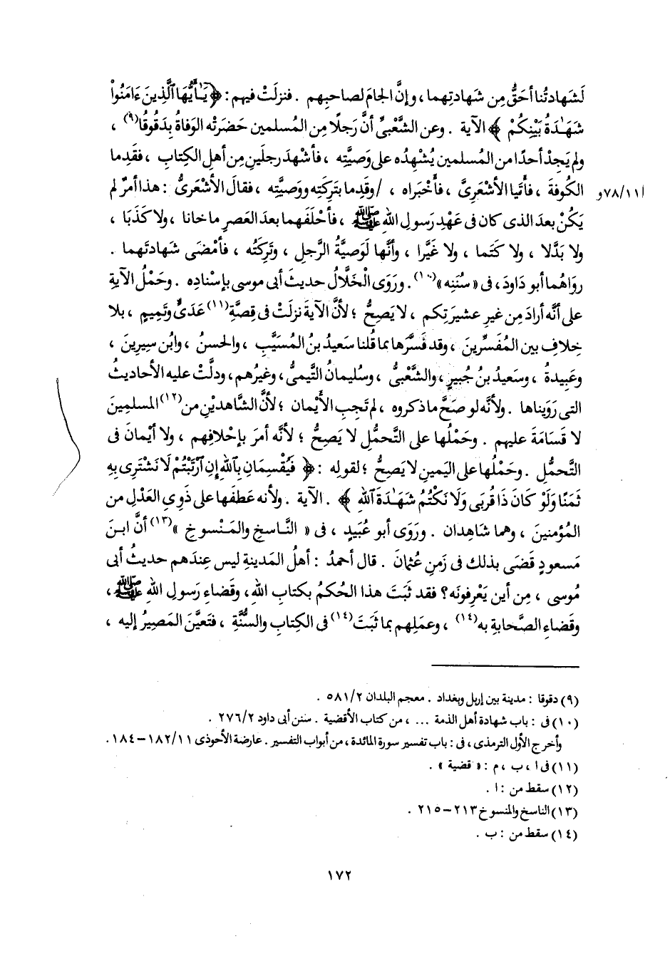 لَشَهادتُنا أحَقُّ مِن شَهادتِهما، وإنّ الجامَ لصاحبِهم. فنزلَتْ فيهم: {يَاأَيُّهَا الَّذِينَ آمَنُوا شَهَادَةُ بَيْنِكُمْ} الآية. وعن الشَّعْبىِّ أن رَجلًا مِن المُسلمين حَضَرتْه الوَفاةُ بِدَقُوقُا (٩)، ولم يَجِدْ أحدًا من المُسلمين يُشْهِدُه على وَصيَّتِه، فأشْهدَ رجلَينِ مِن أهلِ الكِتابِ، فقَدِما الكُوفةَ، فأَتَيا الأشْعَرِىَّ، فأَخْبَراه، وقَدِما بتَرِكَتِه ووَصيَّتِه، فقالَ الأشْعَرىُّ: هذا أمرٌ لم يَكُنْ بعدَ الذى كان فى عَهْدِ رَسولِ اللَّهِ -صلى اللَّه عليه وسلم-، فأحْلَفَهما بعدَ العَصرِ ما خانا، ولا كَذَبَا، ولا بَدَّلا، ولا كَتَما، ولا غَيَّرا، وأنَّها لَوَصَّةُ الرّجلِ، وتَرِكَتُه، فأمْضَى شَهادتَهما. روَاهُما أبو دَاودَ، فى "سُنَنِه" (١٠). ورَوَى الْخَلَّالُ حديثَ أبى موسى بإسْنادِه. وحَمْلُ الآيةِ على أنَّه أرادَ مِن غيرِ عشيرَتِكمِ، لا يَصِحُّ؛ لأنَّ الآيةَ نزلَتْ فى قِصَّةِ (١١) عَدَىٍّ وتَمِيمٍ، بلا خِلافِ بين المُفَسِّرينَ، وقد فسَّرَهَا بما قُلنا سَعيدُ بنُ المُسَيَّبِ، والحسنُ، وابُن سِيرِينَ، وعَبِيدةُ، وسَعيدُ بنُ جُبيرٍ، والشَّعْبىُّ، وسُليمانُ التَّيمىُّ، وغيرُهم، ودلَّتْ عليه الأحاديثُ التى رَوَيناها. ولأنَّه لو صَحَّ ما ذكروه، لم تَجِبِ الأَيْمان؛ لأنَّ الشَّاهديْنِ من (١٢) المسلمِينَ لا قَسَامَةَ عليهم. وحَمْلُها على التَّحمُّلِ لا يَصِحُّ؛ لأَنَّه أمرَ بإحْلافِهم، ولا أيْمانَ فى التَّحمُّلِ. وحَمْلُها على اليَمينِ لا يَصِحُّ؛ لقولِه: {فَيُقْسِمَانِ بِاللَّهِ إِنِ ارْتَبْتُمْ لَا نَشْتَرِى بِهِ ثَمَنًا وَلَوْ كَانَ ذَا قُرْبَى وَلَا نَكْتُمُ شَهَادَةَ اللَّهِ}. الآية. ولأنه عَطفَها على ذَوِىِ العَدْلِ من المُؤمنينَ، وهما شَاهِدان. ورَوَى أبو عُبَيد، فى "النَّاسخِ والمَنْسوخِ" (١٣) أَنَّ ابنَ مَسعودٍ قَضَى بذلك فى زَمنِ عُثمانَ. قال أحمدُ: أهلُ المَدينةِ ليس عِندَهم حديثُ أبى مُوسى، مِن أين يَعْرِفونَه؟ فقد ثَبَتَ هذا الحُكمُ بكتابِ اللَّهِ، وقَضاءِ رَسولِ اللَّهِ -صلى اللَّه عليه وسلم-، وقَضاءِ الصَّحابةِ به (١٤)، وعمَلِهم بما ثَبَتَ (١٤) فى الكِتابِ والسُّنَّةِ، فتَعيَّنَ المَصِيرُ إليه،