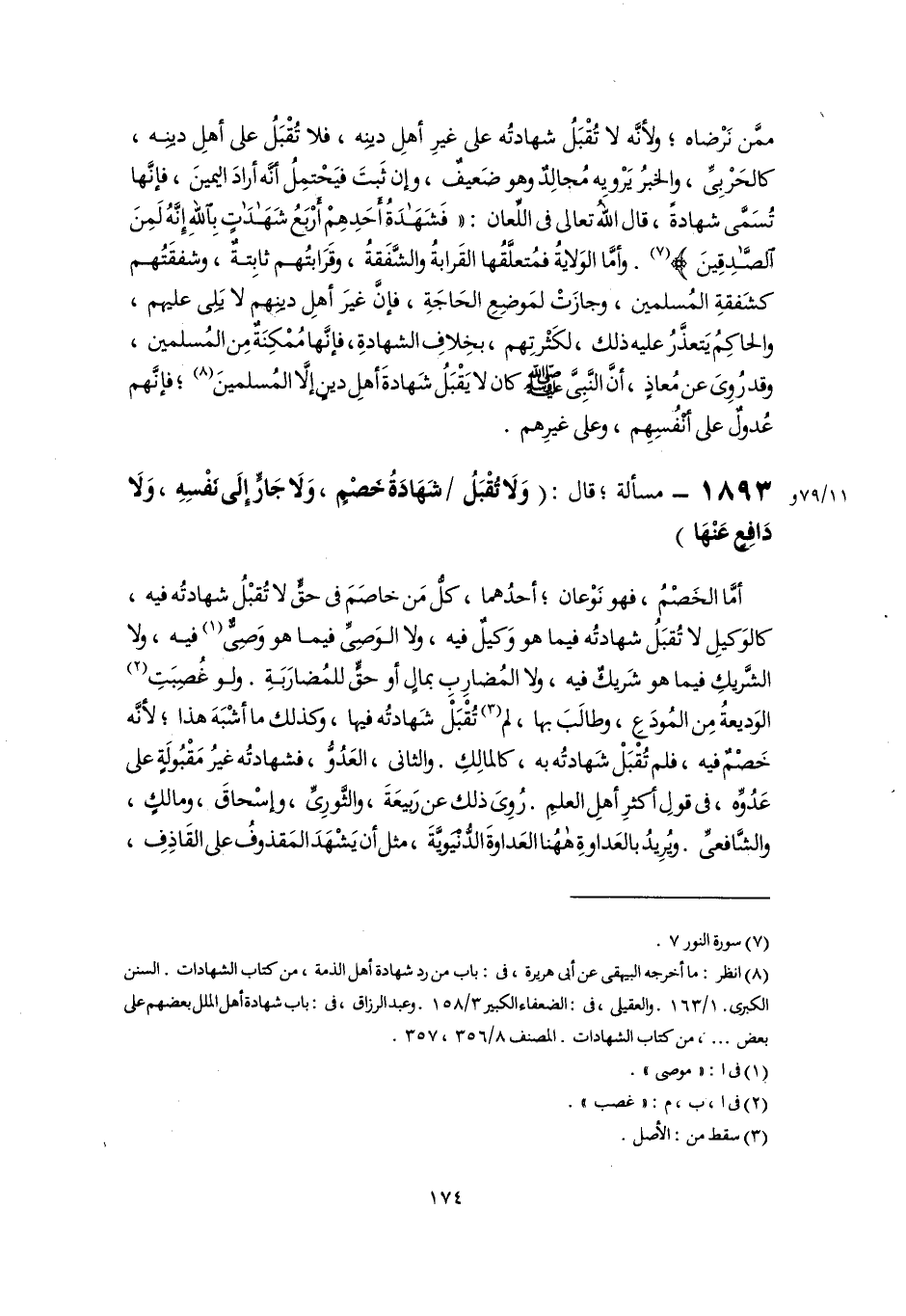 (٨) انظر: ما أخرجه البيهقى عن أبى هريرة، فى: باب من رد شهادة أهل الذمة، من كتاب الشهادات. السنن الكبرى ١/ ١٦٣. والعقيلى، فى: الضعفاء الكبير ٣/ ١٥٨. وعبد الرزاق، فى: باب شهادة أهل الملل بعضهم على بعض. . .، من كتاب الشهادات. المصنف ٨/ ٣٥٦، ٣٥٧.