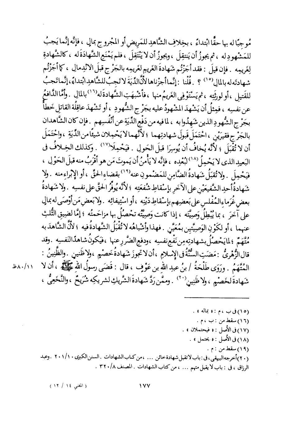 مُوجِبًا له بها حقًّا ابْتداءً، بخِلافِ الشَّاهدِ للمَرِيضِ أو المجْروحِ بمالٍ، فإنَّه إنَّما يَجبُ للمَشْهودِ له، ثم يجوزُ أن يَنتقِلَ، ويجوزُ أن لا يَنْتَقِلَ، فلم يَمْنَعِ الشَّهادَةَ له، كالشَّهادةِ لِغَريمِه. فإن قيلَ: فقد أجَزْتُم شَهادةَ الغَريمِ لغَريمِه بالجَرْحِ قبلَ الانْدِمالِ، كما أجَزْتُم شهادتَه له بالمالِ (١٥)؟ . قُلْنا: إنَّما أجزْناها لأنَّ الدِّيَةَ لا تَجِبُ للشَّاهدِ ابْتداءً، إنَّما تَجبُ للقَتيلِ، أو لورثَتِه، ثم يَسْتَوْفِى الغَريمُ منها، فأشْبهَتِ الشَّهادةَ له (١٦) بالمالِ. وأمَّا الدَّافعُ عن نفسِه، فمِثلُ أن يَشْهدَ المشْهودُ عليه بجَرْحِ الشُّهودِ، أو تَشْهدَ عاقِلُة القاتلِ خَطأ بجَرْحِ الشُّهودِ الذين شَهِدُوا به، لما فيه من دَفْعِ الدِّيَةِ عن أنْفُسِهم. فإن كان الشَّاهدان بالجَرْحِ فقيرَيْنِ، احْتَمَلَ قَبولَ شهادتِهما؛ لأنَّهما لا يَحْمِلان شيئًا من الدِّيَةِ، واحْتَمَلَ أن لا تُقْبَلَ؛ لأَنَّه يُخافُ أن يُوسِرَا قبلَ الحَولِ. فيَحْمِلَا (١٧). وكذلك الخِلافُ فى البَعيدِ الذى لا يَحْمِلُ (١٨) لبُعْدِه، فإنَّه لا يَأْمنُ أن يَموتَ مَن هو أقْرَبُ منه قبلَ الحَوْلِ، فيَحْمِلَ. ولا تُقبَلُ شَهادةُ الضَّامِنِ للمَضْمونِ عنه (١٩) بقضاءِ الحقِّ، أو الإِبْراءِ منه. ولا شَهادةُ أحدِ الشَّفيعَيْنِ على الآخَرِ بإسْقاطِ شُفعَتِه؛ لأَنَّه يُوفِّرُ الحقَّ على نفسِه. ولا شَهادةُ بعض غُرَماءِ المُفْلسِ على بَعضِهم بإسْقاط دَيْنِه، أو اسْتِيفائِه. ولا بَعضِ مَن أوْصَى له بمالٍ على آخَرَ، بما يُبْطِلُ وَصِيَّتَه، إذا كانت وَصِيَّتُه تحْصُلُ بها مزاحَمتُه؛ إمَّا لضِيقِ الثُّلثِ عنهما، أو لكَوْنِ الوَصِيَّتيِن بمُعَيَّنٍ. فهذا وأشْباهُه لا تُقْبَلُ الشَّهادةُ فيه؛ لأنَّ الشَّاهدَ به مُتَّهَمٌ؛ لما يَحْصُلُ بشهادتِه مِن نَفْعِ نفسِه، ودفعِ الضَّررِ عنها، فيَكونُ شاهدًا لنَفسِه. وقد قال الزُّهْرىُّ: مَضَتِ السُّنَّةُ فى الإِسلامِ، أن لا تجوزَ شَهادةُ خَصْمٍ، ولا ظَنينٍ. والظَّنِينُ: المُتَّهَمُ. ورَوَى طَلْحَةُ بنُ عبدِ اللَّهِ بن عَوْفٍ، قال: قَضَى رسولُ اللَّه -صلى اللَّه عليه وسلم-، أن لا شَهادةَ لخَصْمٍ، ولا ظَنِينٍ (٢٠). وممَّن رَدَّ شَهادةَ الشَّريكِ لشريكِه شُرَيحٌ، والنَّخَعِىُّ،