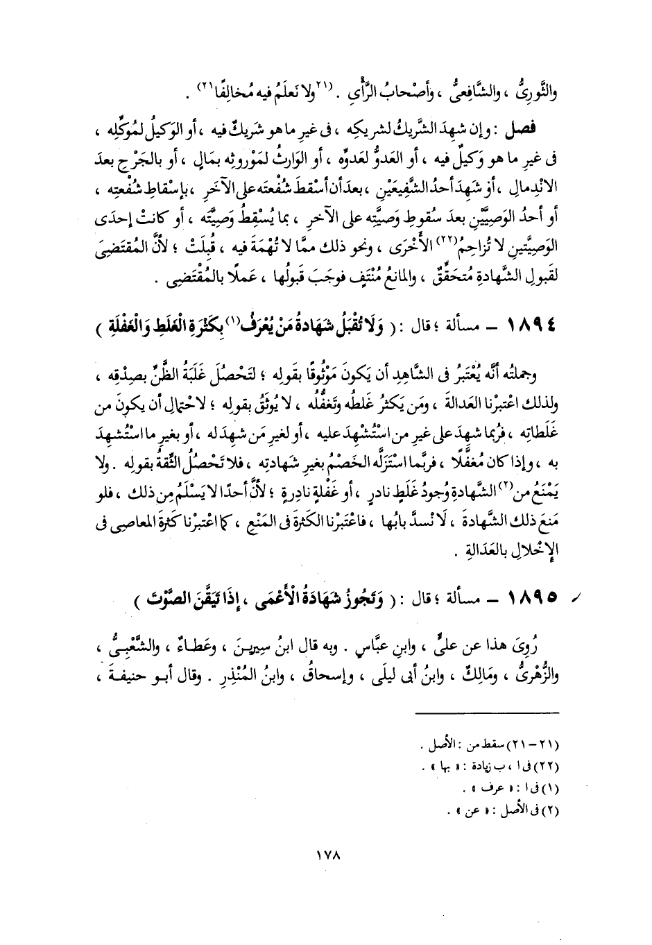وجملتُه أنَّه يُعْتَبرُ فى الشَّاهِدِ أن يَكونَ مَوْثُوقًا بقَولِه؛ لتَحْصُلَ غَلَبَةُ الظَّنِّ بصِدْقِه، ولذلك اعْتبرْنا العَدالةَ، ومَن يَكثرُ غَلطُه وتَغفُّلُه، لا يُوثَقُ بقولِه؛ لاحْتمالِ أن يكونَ من غَلَطاتِه، فرُبما شهِدَ على غيرِ من اسْتُشْهِدَ عليه، أو لغيرِ مَن شهِدَ له، أو بغيرِ ما اسْتُشهِدَ به، وإذا كان مُغفَّلًا، فربَّما اسْتَزَلَّه الخَصْمُ بغيرِ شَهادتِه، فلا تَحْصُلُ الثِّقةُ بقولِه. ولا يَمْنَعُ من (٢) الشَّهادةِ وُجودُ غَلَطٍ نادرٍ، أو غَفْلةٍ نادِرةٍ؛ لأنَّ أحدًا لا يَسْلَمُ مِن ذلك، فلو مَنعَ ذلك الشَّهادةَ، لَا نْسدَّ بابُها، فاعْتَبرْنا الكَثرةَ فى المَنْعِ، كما اعْتبرْنا كَثرةَ المعاصِى فى الإِخْلالَ بالعَدَالةِ.