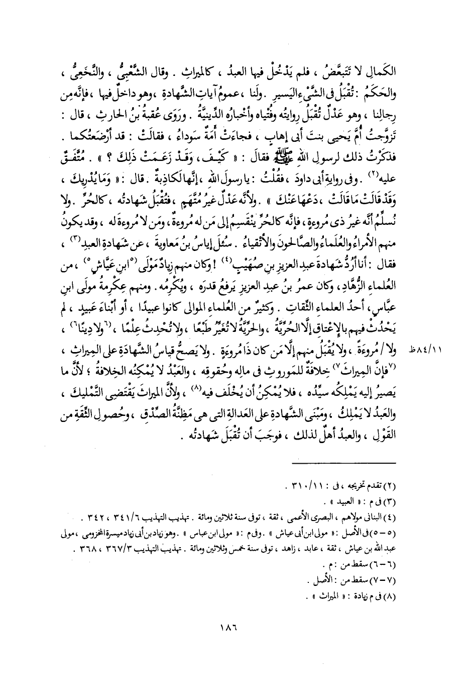 الكَمالِ لا تَتَبعَّضُ، فلم يَدْخُلْ فيها العبدُ، كالميراثِ. وقال الشَّعْبِىُّ، والنَّخَعِىُّ، والحَكَمُ: تُقْبَلُ فى الشَّىْءِ اليَسيرِ. ولَنا، عمومُ آياتِ الشَّهادةِ، وهو داخل فيها، فإنَّه مِن رِجالِنا، وهو عَدْل تُقْبَلُ رِوايتُه وفُتْياه وأخْبارُه الدِّينيَّةُ. ورَوَى عُقبةُ بنُ الحارثِ، قال: تَزوَّجتُ أُمَّ يَحيى بنتَ أبى إهابٍ، فجاءَتْ أُمة سَوداءُ، فقالَتْ: قد أرْضَعتُكما. فذكرْتُ ذلك لرسولِ اللَّهِ -صلى اللَّه عليه وسلم- فقالَ: "كَيْفَ، وَقَدْ زَعَمَتْ ذَلِكَ؟ ". مُتَّفَقٌ عليه (٢). وفى رواية أبى داودَ، فقُلْتُ: يا رسولَ اللَّهِ، إنَّها لَكاذِبة. قال: "وَمَا يُدْرِيكَ، وَقَدْ قَالَتْ مَا قَالَتْ، دَعْهَا عَنْكَ". ولأنَّه عَدْل غيرُ مُتَّهَمٍ، فتُقْبَلُ شَهادتُه، كالحُرِّ. ولا نُسلِّمُ أنَّه غيرُ ذى مُروءةٍ، فإنَّه كالحُرِّ ينْقَسِمُ إلى مَن له مُروءةٌ، ومَن لا مُروءةَ له، وقد يكونُ منهم الأمراءُ والعُلَماءُ والصَّالحونَ والأتْقياءُ. سُئلَ إياسُ بنُ مَعاويةَ، عن شَهادةِ العبدِ (٣)، فقال: أنا أرُدُّ شَهادةَ عبدِ العزيزِ بنِ صُهَيْب (٤)! وكان منهم زِيادٌ مَوْلَى [ابنِ عَيَّاشٍ] (٥)، من العُلماءِ الزُّهَّادِ، وكان عمرُ بنُ عبدِ العزيزِ يَرفعُ قدرَه، ويُكرِمُه. ومنهم عِكْرِمةُ مولَى ابنِ عبَّاسٍ، أحدُ العلماءِ الثِّقاتِ. وكثيرٌ من العُلماءِ الموالى كانوا عبيدًا، أو أبْناءَ عَبيدٍ، لم يَحْدُثْ فيهم بالإِعْتاقِ إِلَّا الحُرِّيَّةُ، والحرِّيَّةُ لا تُغَيِّرُ طَبْعًا، ولا تُحْدِثُ عِلْمًا، [ولا دِينًا] (٦)، ولا مُروءَةً، ولا يُقْبَلُ منهم إلا مَن كان ذَا مُروءَةٍ. ولا يَصحُّ قياسُ الشَّهادَةِ على المِيراثِ، [فإِنَّ المِيراثَ] (٧) خِلافَةٌ للمَوروثِ فى مالِه وحُقوقِه، والعَبْدُ لا يُمْكِنُه الخِلافةُ؛ لأنَّ ما يَصيرُ إليه يَمْلِكُه سيِّدُه، فلا يُمْكِنُ أن يُخْلَف فيه (٨)، ولأنَّ الميراثَ يَقْتَضِى التَّمْليكَ، والعَبدُ لا يَمْلِكُ، ومَبْنَى الشَّهادةِ على العَدالةِ التى هى مَظِنَّةُ الصِّدْقِ، وحُصولِ الثِّقَةِ من القَوْلِ، والعبدُ أهلٌ لذلك، فوجَبَ أن تُقْبَلَ شَهادتُه.