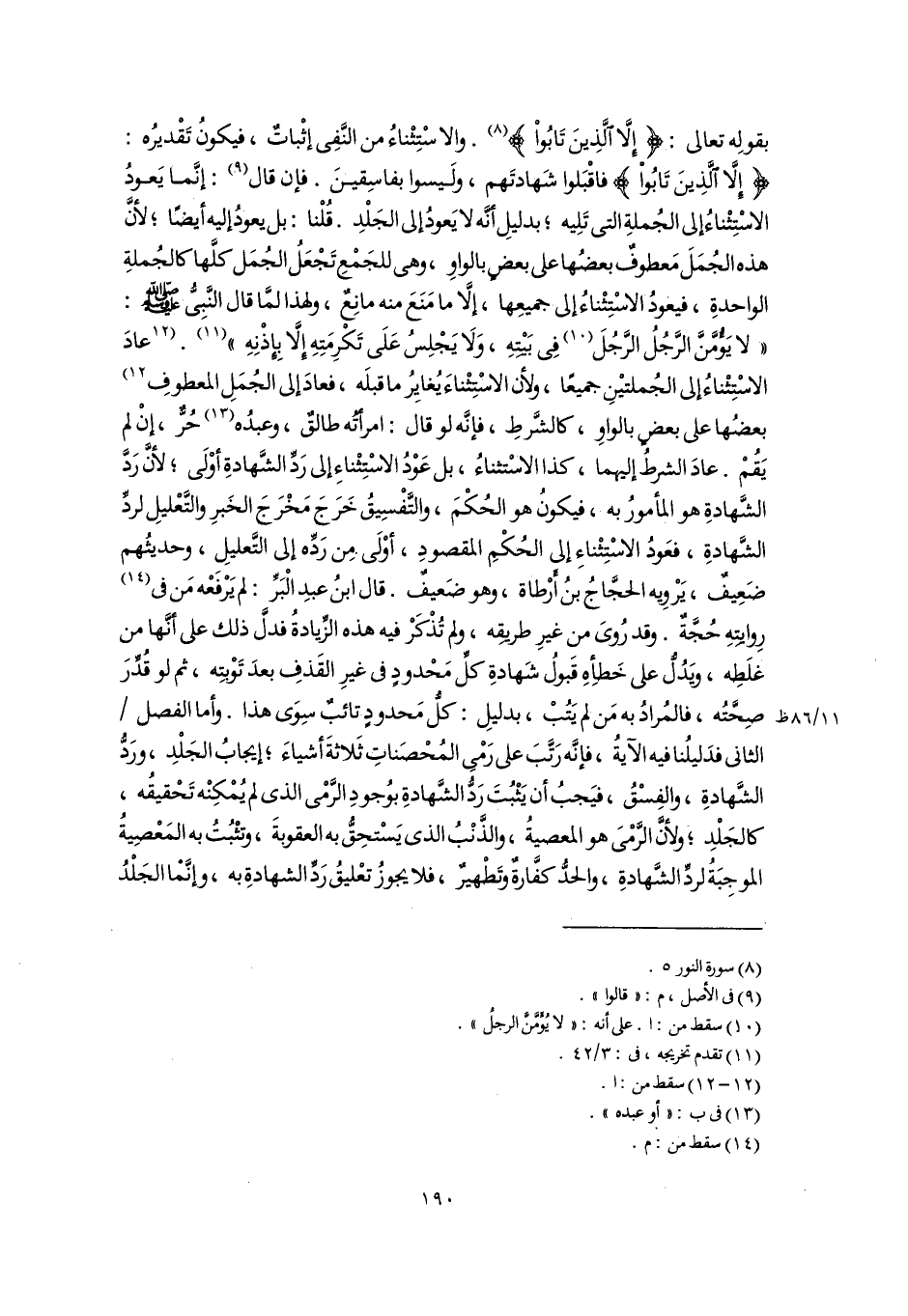 بقولِه تعالى: {إِلَّا الَّذِينَ تَابُوا} (٨). والاسْتِثْناءُ من النَّفِى إثْباتٌ، فيكونُ تَقْديرُه: {إِلَّا الَّذِينَ تَابُوا} فاقْبَلوا شَهادتَهم، ولَيسوا بفاسِقينَ. فإن قال (٩): إنَّما يَعودُ الاسْتِثْناءُ إلى الجُملةِ التى تَلِيه؛ بدليلِ أنَّه لا يَعودُ إلى الجَلْدِ. قُلْنا: بل يعودُ إليه أيضًا؛ لأنَّ هذه الجُمَلَ مَعطوفٌ بعضُها على بعضٍ بالواوِ، وهى للجَمْعِ تَجْعَلُ الجُمَل كلَّها كالجُملةِ الواحدةِ، فيعودُ الاسْتِثْناءُ إلى جميعِها، إِلَّا ما مَنَعَ منه مانِعٌ، ولهذا لمَّا قال النَّبِىُّ -صلى اللَّه عليه وسلم-: "لا يَؤُمَّنَّ الرَّجُلُ الرَّجُلَ (١٠) فِى بَيْتِهِ، وَلَا يَجْلِسُ عَلَى تَكْرِمَتِهِ إلَّا بإِذْنِهِ" (١١). [عادَ الاسْتِثْناءُ إلى الجُملتيْنِ جميعًا، ولأن الاسْتِثْناءَ يُغايِرُ ما قبلَه، فعادَ إلى الجُمَلِ المعطوفِ] (١٢) بعضُها على بعضٍ بالواوِ، كالشَّرطِ، فإنَّه لو قال: امرأتُه طالقٌ، وعبدُه (١٣) حُرٌّ، إِنْ لم يَقُمْ. عادَ الشرطُ إليهما، كذا الاسْتثناءُ، بل عَوْدُ الاسْتِثْناءِ إلى رَدِّ الشَّهادةِ أوْلَى؛ لأنَّ رَدَّ الشَّهادةِ هو المأمورُ به، فيكونُ هو الحُكْمَ، والتَّفْسِيقُ خَرَجَ مَخْرَجَ الخَبرِ والتَّعْليلِ لردِّ الشَّهادةِ، فعَودُ الاسْتِثْناءِ إلى الحُكْمِ المقصودِ، أوْلَى. مِن رَدِّه إلى التَّعليلٍ، وحديثُهم ضَعِيفٌ، يَرْوِيه الحجَّاجُ بنُ أَرْطاة، وهو ضَعيفٌ. قال ابنُ عبدِ الْبَرِّ: لم يَرْفعْه مَن فى (١٤) رِوايتهِ حُجَّةٌ. وقد رُوىَ من غيرِ طريقه، ولم تُذْكَرْ فيه هذه الزِّيادةُ فدلَّ ذلك على أنَّها من غلَطِه، ويَدُلُّ على خَطأِهِ قَبولُ شَهادةِ كلِّ مَحْدودٍ فى غيرِ القَذفِ بعدَ تَوْبتِه، ثم لو قُدِّرَ صِحَّتُه، فالمُرادُ به مَن لم يَتُبْ، بدليلِ: كلُّ مَحدودٍ تائبٌ سِوَى هذا. وأما الفصل الثانى فدَليلُنا فيه الآيةُ، فإنَّه رَتَّبَ على رَمْىِ المُحْصَناتِ ثَلاثةَ أشياءَ؛ إيجابُ الجَلْدِ، ورَدُّ الشَّهادةِ، والفِسْقُ، فيَجبُ أن يَثْبُتَ رَدُّ الشَّهادةِ بوُجودِ الرَّمْى الذى لم يُمْكِنْه تَحْقيقُه، كالجَلْدِ؛ ولأن الرَّمْىَ هو المعصيةُ، والذَّنْبُ الذى يَسْتحِقُّ به العقوبةَ، وتثبُتُ به المَعْصِيةُ الموجِبَةُ لردِّ الشَّهادةِ، والحدُّ كفَّارةٌ وتطْهيرٌ، فلا يجوزُ تعْليقُ رَدِّ الشهادةِ به، وإنَّما الجَلْدُ