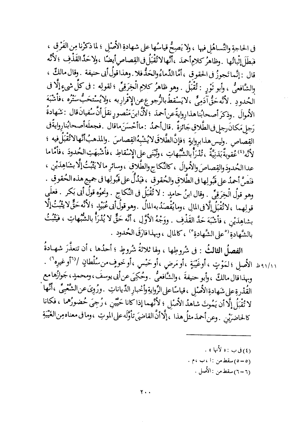 الفصلُ الثالثُ: فى شُروطِها، ولها ثلاثة شُروطٍ؛ أحدُها، أن تتعذَّرَ شهادةُ الأصلِ؛ لمَوْتٍ، أو غَيْبَةٍ، أو مَرضٍ، أو حَبْسٍ، أو خَوفٍ من سُلْطانٍ [أو غيرِه] (٦). وبهذا قال مالكٌ، وأبو حنيفةَ، والشَّافعىُّ. وحُكِىَ عن أبى يوسف، ومحمدٍ، جَوازُها مع القُدْرةِ على شَهادةِ الأصْلِ، قياسًا على الرِّوايةِ وأخْبارِ الدِّياناتِ. ورُوِىَ عن الشَّعْبِىِّ، أنَّها لا تُقْبَلُ إِلَّا أن يَمُوتَ شاهدُ الأَصْلِ؛ لأنَّهما إذا كانا حَيَّيْنِ، رُجِىَ حُضورُهما، فكانا كالحاضرَيْنِ. وعن أحمدَ مثلُ هذا، إِلَّا أَنَّ القاضىَ تأوَّلَه على الموتِ، وما فى معناه مِن الغَيْبَةِ