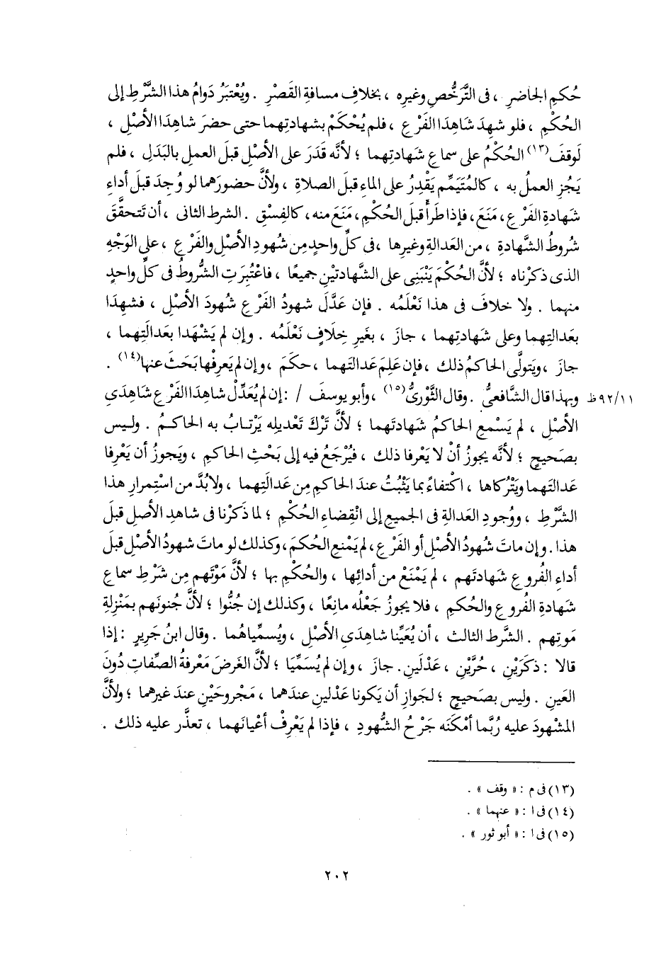 حُكمِ الحاضرِ، فى التَّرَخُّصِ وغيرِه، بخلافِ مسافةِ القَصْرِ. ويُعْتبَرُ دَوامُ هذا الشَّرْطِ إلى الحُكْمِ، فلو شهِدَ شَاهِدَا الفَرْعِ، فلم يُحْكَمْ بشهادتِهما حتى حضرَ شاهِدَا الأَصْلِ، لَوقفَ (١٣) الحُكْمُ على سماعِ شَهادتِهما؛ لأَنَّه قَدَرَ على الأَصْلِ قبلَ العملِ بالبَدَلِ، فلم يَجُزِ العملُ به، كالمُتَيَمِّم يَقْدِرُ على الماءِ قبلَ الصلاةِ، ولأنَّ حضورَهما لو وُجِدَ قبلَ أداءِ شَهادةِ الفَرْعِ، مَنَعَ، فإذا طَرأَ قبلَ الحُكْمِ، مَنَعَ منه، كالفِسْقِ. الشرط الثانى، أن تَتحقَّقَ شُروطُ الشَّهادةِ، من العَدالةِ وغيرِها، فى كلِّ واحدٍ مِن شُهودِ الأَصْلِ والفَرْعِ، على الوَجْهِ الذى ذكرناه؛ لأنَّ الحُكْمَ يَنْبَنِى على الشَّهادتيْنِ جميعًا، فاعْتُبِرَتِ الشُّروطُ فى كلِّ واحدٍ منهما. وخلافَ فى هذا نَعْلَمُه. فإن عَدَّلَ شهودُ الفَرْعِ شُهودَ الأَصْلِ، فشهِدَا بعَدالتِهما وعلى شَهادتِهما، جازَ، بغَيرِ خِلَافٍ نَعْلَمُه. وإن لم يَشْهَدا بعَدالَتِهما، جازَ، ويَتولَّى الحاكمُ ذلك، فإن عَلِمَ عَدالتَهما، حكَمَ، وإن لم يَعرِفْها بَحَثَ عنها (١٤). وبهذا قال الشَّافعىُّ. وقال الثَّوْرىُّ (١٥)، وأبو يوسفَ: إن لم يُعَدِّلْ شاهِدَا الفَرْعِ شَاهِدَىِ الأَصْلِ، لم يَسْمعِ الحاكمُ شَهادتَهما؛ لأنَّ تَرْكَ تَعْديلِه يَرْتابُ به الحاكمُ. وليس بصَحيحٍ؛ لأَنَّه يجوزُ أَنْ لا يَعْرفا ذلك، فيُرْجَعُ فيه إلى بَحْثِ الحاكمِ، ويَجوزُ أن يَعْرِفا عَدالتَهما ويَتْرُكاها، اكْتفاءً بما يَثْبُتُ عندَ الحاكمِ مِن عَدالَتِهما، ولابُدَّ من اسْتِمرارِ هذا الشَّرْطِ، ووُجودِ العَدالةِ فى الجميعِ إلى انْقِضاءِ الحُكْمِ؛ لما ذَكرْنا فى شاهدِ الأصلِ قبلَ هذا. وإن ماتَ شُهودُ الأَصْلِ أو الفَرْعِ، لم يَمْنعِ الحُكمَ، وكذلك لو ماتَ شهودُ الأَصْلِ قبلَ أداءِ الفُروعِ شَهادتَهم، لم يَمْنَعْ من أدائِها، والحُكْمِ بها؛ لأنَّ مَوْتَهم مِن شَرْطِ سماعِ شَهادةِ الفُروعِ والحُكمِ، فلا يجوزُ جَعْلُه مانِعًا، وكذلك إن جُنُّوا؛ لأنَّ جُنونَهم بمَنْزِلةِ مَوتِهم. الشَّرط الثالث، أن يُعَيِّنا شاهِدَىِ الأَصْلِ، ويُسمِّياهُما. وقال ابنُ جَرِيرٍ: إذا قالا: ذكَرَيْنِ، حُرَّيْنِ، عَدْلَينِ. جازَ، وإن لم يُسَمِّيَا؛ لأنَّ الغَرضَ مَعْرفةُ الصِّفاتِ دُونَ العَينِ. وليس بصَحيحٍ؛ لجَوازِ أن يَكونا عَدْلينِ عندَهما، مَجْروحَيْنِ عندَ غيرهما؛ ولأنَّ المشْهودَ عليه رُبَّما أمْكَنَه جَرْحُ الشُّهودِ، فإذا لم يَعْرِفْ أعْيانَهما، تعذَّر عليه ذلك.