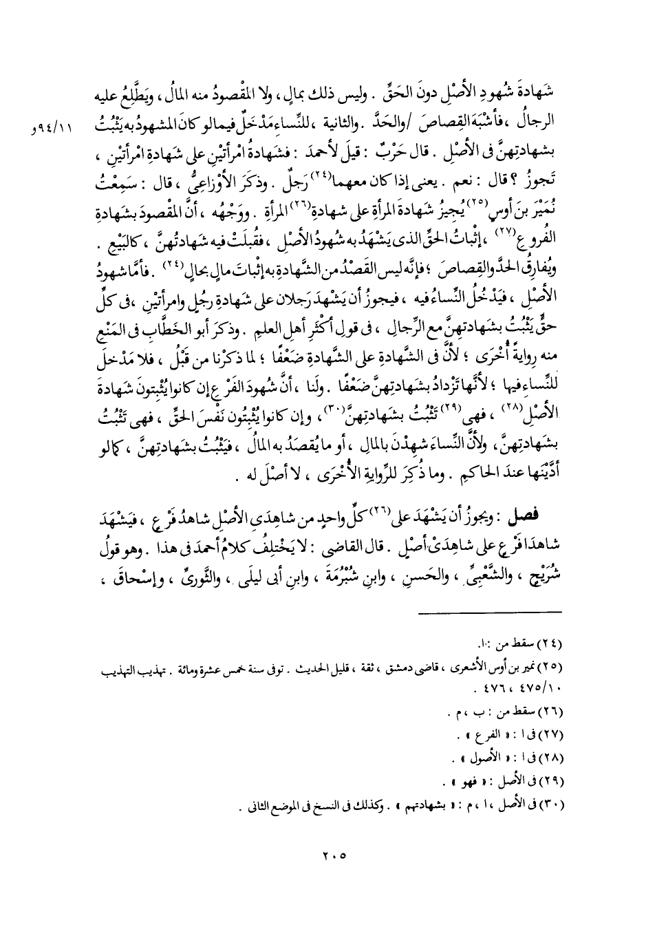 شَهادةَ شُهودِ الأَصْلِ دونَ الحَقِّ. وليس ذلك بمالٍ، ولا المقْصودُ منه المالُ، ويَطَّلِعُ عليه الرجالُ، فأشْبَهَ القِصاصَ والحَدَّ. والثانية، للنِّساءِ مَدْخَلٌ فيما لو كانَ المشهودُ به يَثْبُتُ بشهادتِهنَّ فى الأصْلِ. قال حَرْبٌ: قيلَ لأحمدَ: فشَهادةُ امْرأتيْنِ على شَهادةِ امْرأَتيْنِ، تَجوزُ؟ قال: نعم. يعنى إذا كان معهما (٢٤) رَجلٌ. وذكَرَ الأَوْزاعِىُّ، قال: سَمِعْتُ نُمَيْرَ بنَ أوسٍ (٢٥) يُجِيزُ شَهادةَ المرأةِ على شهادةِ (٢٦) المرأةِ. ووَجْهُه، أَنَّ المقْصودَ بشَهادةِ الفُروعِ (٢٧)، إثْباتُ الحقِّ الذى يَشْهَدُ به شُهودُ الأصْلِ، فقُبلَتْ فيه شَهادتُهنَّ، كالبَيعِ. ويُفارِقُ الحدَّ والقِصاصَ؛ فإنَّه ليس القَصْدُ من الشَّهادةِ به إثْباتَ مالٍ بحالٍ (٢٤). فأمَّا شهودُ الأصْلِ، فيَدْخُلُ النِّساءُ فيه، فيجوزُ أن يَشْهدَ رَجلان على شَهادةِ رجُلٍ وامرأتيْنِ، فى كلِّ حقٍّ يَثْبُتُ بشَهادتهِنَّ مع الرِّجالِ، فى قولِ أكْثَرِ أهلِ العلمِ. وذكرَ أبو الخَطَّابِ فى المَنْعِ منه رِوايةً أُخْرَى؛ لأنَّ فى الشَّهادةِ على الشَّهادةِ ضَعْفًا، لما ذكرْنا من قَبْلُ، فلا مَدْخلَ للنِّساءِ فيها، لأنَّها تَزْدادُ بشَهادتِهنَّ ضَعْفًا. ولَنا، أَنَّ شُهودَ الفَرْعِ إن كانوا يُثْبِتونَ شَهادةَ الأصْلِ (٢٨)، فهى (٢٩) تَثْبُتُ بشَهادتِهنَّ (٣٠)، وإن كانوا يُثْبِتُون نَفْسَ الحقِّ، فهى تَثْبُتُ بشَهادتِهنَّ، ولأنَّ النِّساءَ شهِدْنَ بالمالِ، أو ما يُقصَدُ به المالُ، فيَثْبُتُ بشَهادتِهنَّ، كما لو أدَّيْنَها عندَ الحاكِم. وما ذُكِرَ للرِّوايةِ الأُخْرَى، لا أصْلَ له.