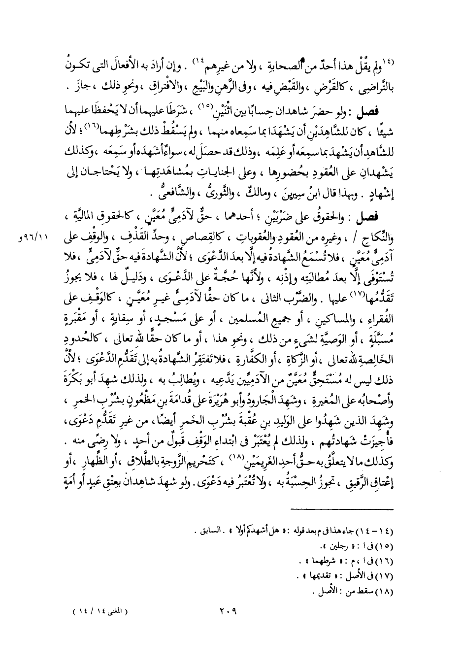 فصل: والحقوقُ على ضَرْبَيْنِ؛ أحدهما، حقٌّ لآدَمِىٍّ مُعَيَّنٍ، كالحقوقِ الماليَّةِ، والنِّكاحِ، وغيرِه من العُقودِ والعُقوباتِ، كالقِصاصِ، وحدِّ القَذْفِ، والوقْفِ على آدَمِىٍّ مُعَيَّنٍ، فلا تُسْمَعُ الشَّهادةُ فيه إِلَّا بعدَ الدَّعْوَى، لأنَّ الشَّهادةَ فيه حقٌّ لآدَمِىٍّ، فلا تُسْتَوْفَى إِلَّا بعدَ مُطالبَتِه وإذْنِه، ولأنَّها حُجَّةٌ على الدَّعْوَى، ودَليلٌ لها، فلا يجوزُ تَقَدُّمُها (١٧) عليها. والضَّرْب الثانى، ما كان حقًّا لآدَمِىٍّ غيرِ مُعَيَّنٍ، كالوَقْفِ على الفُقراءِ، والمساكينِ، أو جميعِ المُسلمين، أو على مَسْجدٍ، أو سِقايةٍ، أو مَقْبَرةٍ مُسَبَّلَةٍ، أو الوَصيَّةِ لشَىءٍ من ذلك، ونحوِ هذا، أو ما كان حقًّا للَّهِ تعالى، كالحُدودِ الخَالِصةِ للَّه تعالى، أو الزَّكاةِ، أو الكفَّارةِ، فلا تَفتَقِرُ الشَّهادةُ به إلى تَقَدُّمِ الدَّعْوَى؛ لأنَّ ذلك ليس له مُسْتَحِقٌّ مُعَيَّنٌ من الآدَمِيِّين يَدَّعِيه، ويُطالِبُ به، ولذلك شهِدَ أبو بَكْرَةَ وأصْحابُه على المُغيرةِ، وشَهِدَ الْجَارودُ وأبو هُرَيْرَةَ على قُدامَةَ بنِ مَظْعُونٍ بشُرْبِ الخمرِ، وشَهِدَ الذين شَهِدُوا على الوَليدِ بنِ عُقْبةَ بشُرْبِ الخَمرِ أيضًا، من غيرِ تَقَدُّمِ دَعْوَى، فأُجِيزَتْ شَهادتُهم، ولذلك لم يُعْتَبَرْ فى ابْتداءِ الوَقْفِ قَبولٌ من أحدٍ، ولا رِضًى منه. وكذلك ما لا يتعلَّقُ به حقُّ أحدِ الغَرِيمَيْنِ (١٨)، كتَحْريِم الزَّوجةِ بالطَّلاقِ، أو الظِّهارِ، أو إعْتاقِ الرَّقيقِ، تجوزُ الحِسْبَةُ به، ولا تُعْتَبرُ فيه دَعْوَى. ولو شهِدَ شاهِدان بعِتْقِ عَبدٍ أو أمَةٍ