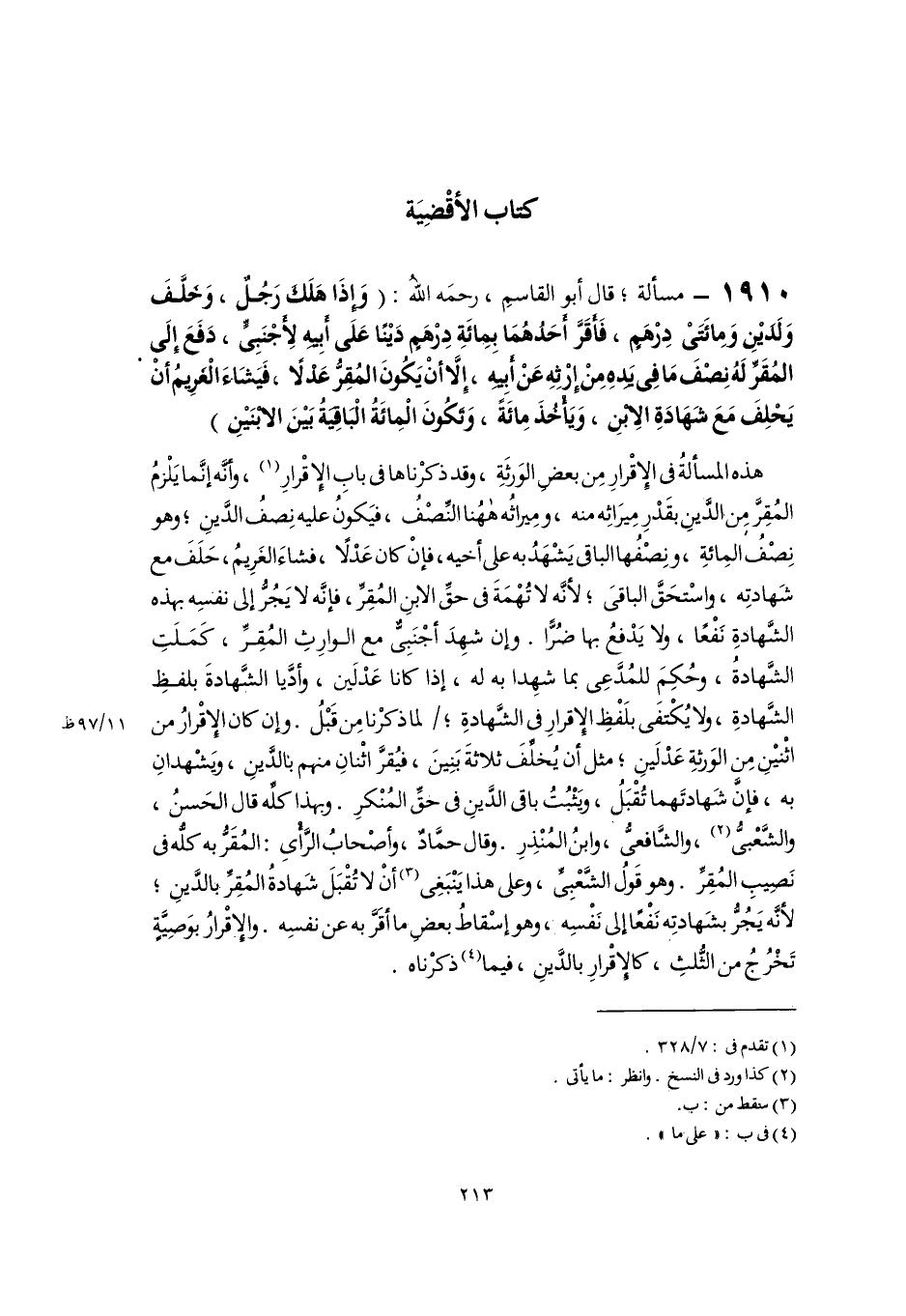 ١٩١٠ - مسألة؛ قال أبو القاسمِ، رحمَه اللَّهُ: (وَإِذَا هَلَك رَجُلٌ، وَخَلَّفَ وَلَدَيْنِ وَمِائَتَىْ دِرْهَمٍ، فَأَقَرَّ أَحَدُهُمَا بِمِائَةِ دِرْهَمٍ دَيْنًا عَلَى أبِيه لِأَجْنَبِىٍّ، دَفَعَ إِلَى المُقَرِّ لَهُ نِصْفَ مَا فِى يَدهِ مِنْ إِرْثِهِ عَنْ أَبِيه، إِلَّا أَنْ يَكُونَ المُقِرُّ عَدْلًا، فَيَشَاءَ الْغَرِيمُ أَنْ يَحْلِفَ مَعَ شَهَادَةِ الِابْنِ، وَيَأْخُذَ مِائَةً، وَتَكُونَ الْمِائَةُ الْبَاقِيةُ بَيْنَ الابْنَيْنِ)