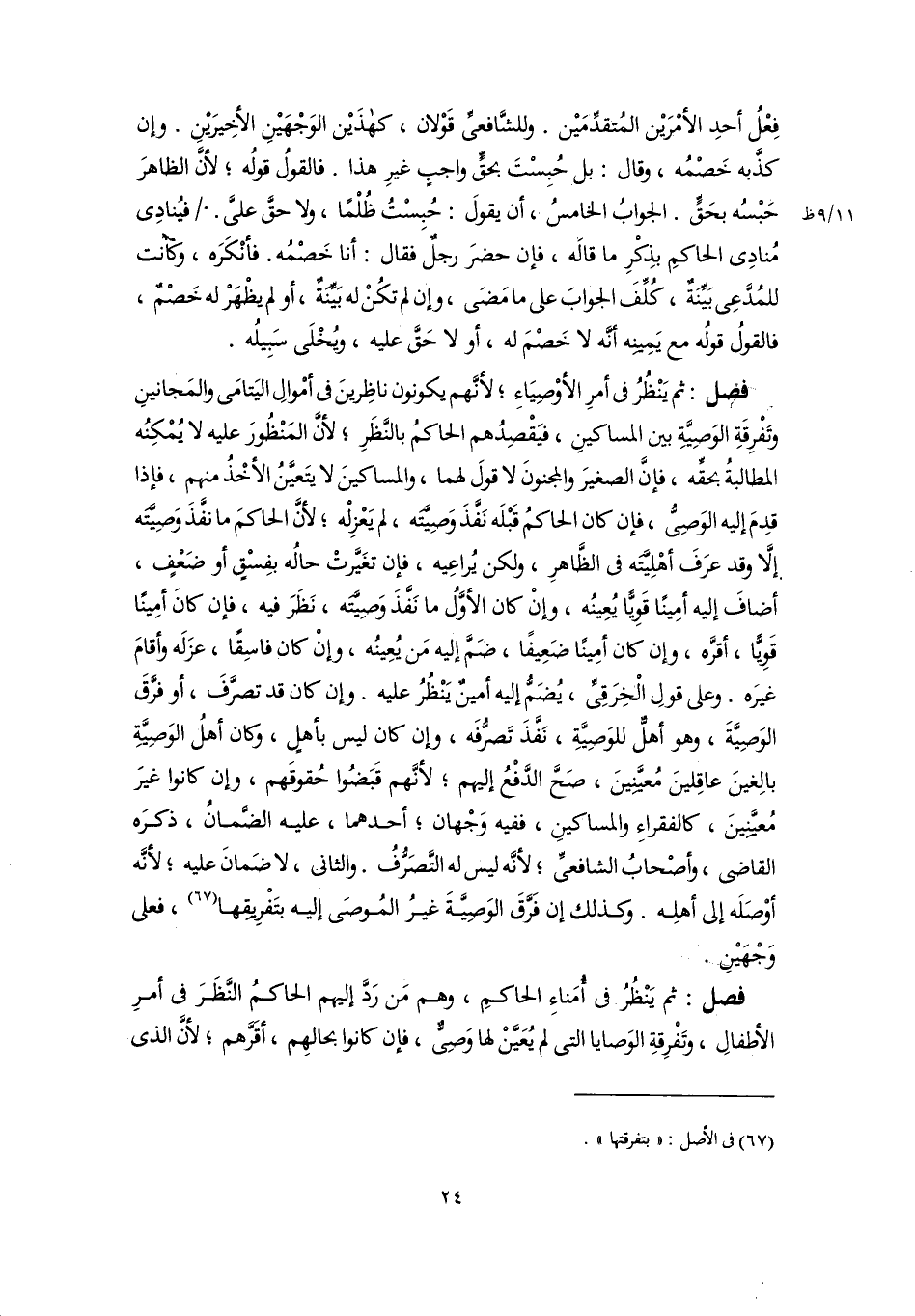 فصل: ثم يَنْظُرُ في أمرِ الأوْصِيَاءِ؛ لأنَّهم يكونون ناظِرينَ في أمْوالِ اليَتامَى والمَجانينِ وتَفْرِقَةِ الوَصِيَّةِ بين المساكينِ، فيَقْصِدُهم الحاكمُ بالنَّظَرِ؛ لأنَّ المَنْظُورَ عليه لا يُمْكِنُه المطالبةُ بحقِّه، فإنَّ الصغيرَ والمجنونَ لا قولَ لهما، والمساكينَ لا يتَعيَّنُ الأخْذُ منهم، فإذا قدِمَ إليه الوَصِيُّ، فإن كان الحاكمُ قَبْلَه نَفَّذَ وَصِيَّتَه، لم يَعْزِلْه؛ لأنَّ الحاكمَ ما نفَّذَ وَصِيَّتَه إلَّا وقد عرَفَ أهْلِيَّتَه في الظَّاهرِ، ولكن يُراعِيه، فإن تغَيَّرتْ حالُه بفِسْقٍ أو ضَعْفٍ، أضافَ إليه أمِينًا قَوِيًّا يُعِينُه، وإنْ كان الأوَّلُ ما نَفَّذَ وَصِيَّتَه، نَظَرَ فيه، فإن كانَ أمِينًا قَويًّا، أقرَّه، وإن كان أمِينًا ضَعِيفًا، ضَمَّ إليه مَن يُعِينُه، وإنْ كان فاسِقًا، عزَلَه وأقامَ غيرَه. وعلى قولِ الْخِرَقِيِّ، يُضَمُّ إليه أمينٌ يَنْظُرُ عليه. وإن كان قد تصرَّفَ، أو فرَّقَ الوَصِيَّةَ، وهو أهلٌ للوَصِيَّةِ، نَفَّذَ تَصرُّفَه، وإن كان ليس بأهلٍ، وكان أهلُ الوَصِيَّةِ بالِغينَ عاقِلينَ مُعيَّنِينَ، صَحَّ الدَّفْعُ إليهم؛ لأنَّهم قَبَضُوا حُقوقَهم، وإن كانوا غيرَ مُعيَّنينَ، كالفقراءِ والمساكينِ، ففيه وَجْهان؛ أحدهما، عليه الضمانُ، ذكرَه القاضي، وأصْحابُ الشافعيِّ؛ لأنَّه ليس له التَّصَرُّفُ. والثاني، لا ضَمانَ عليه؛ لأنَّه أوْصَلَه إلى أهلِه. كذلك إن فَرَّقَ الوَصِيَّةَ غيرُ المُوصَى إليه بتَفْرِيقها (٦٧)، فعلى وَجْهَيْنِ.