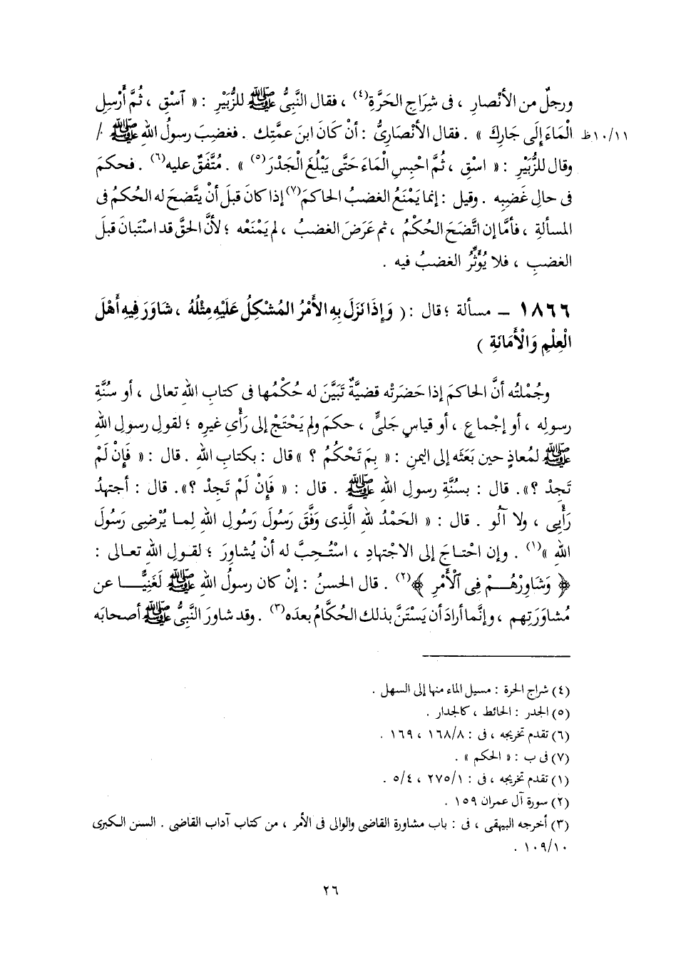 ورجلٌ من الأنصارِ، في شِرَاجِ الحَرَّةِ (٤)، فقال النَّبِيُّ -صَلَّى اللهُ عَلَيْهِ وَسَلَّمَ- للزُّبَيْرِ: "اسْقِ، ثُمَّ أرْسِلِ الْمَاءَ إلَى جَارِكَ". فقال الأنْصَارِيُّ: أنْ كَانَ ابنَ عمَّتِك. فغضِبَ رسولُ اللهِ -صَلَّى اللهُ عَلَيْهِ وَسَلَّمَ- وقال للزُّبَيْرِ: "اسْقِ، ثُمَّ احْبِسِ الْمَاءَ حَتَّى يَبْلُغَ الْجَدْرَ (٥) ". مُتَّفَقٌ عليه (٦). فحكمَ في حالِ غَضَبِهِ. وقيل: إنما يَمْنَعُ الغضبُ الحاكمَ (٧) إذا كانَ قبلَ أنْ يتَّضحَ له الحُكمُ في المسألةِ، فأمَّا إن اتَّضَحَ الحُكْمُ، ثم عَرَضَ الغضبُ، لم يَمْنَعْه؛ لأنَّ الحقَّ قد اسْتَبانَ قبلَ الغضبِ، فلا يُؤَثِّرُ الغضبُ فيه.