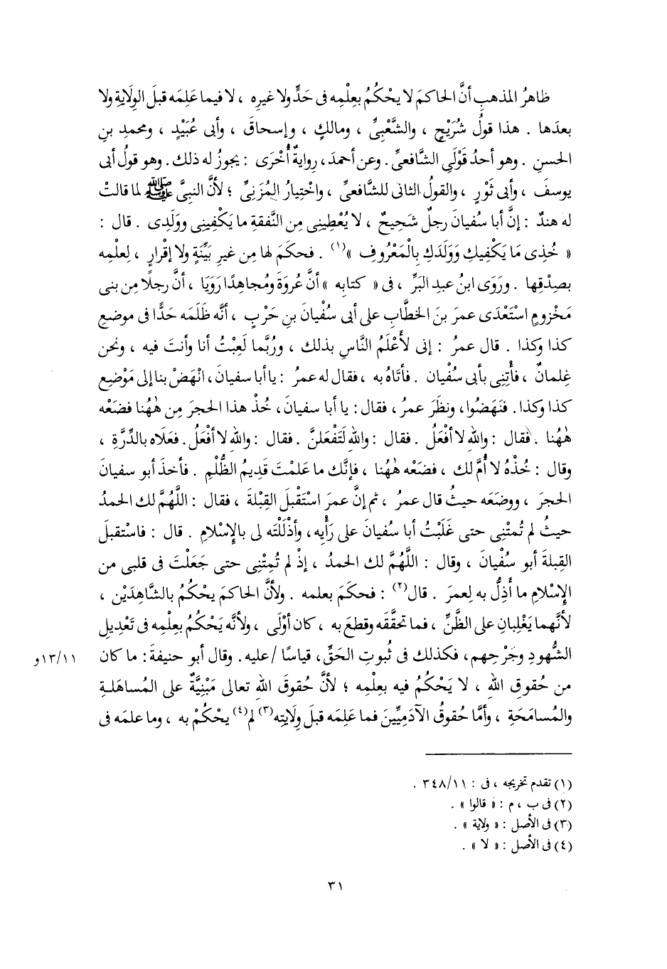 ظاهرُ المذهبِ أنَّ الحاكمَ لا يحْكُمُ بعِلْمِه في حَدٍّ ولا غيرِه، لا فيما عَلِمَه قبلَ الوِلَايةِ ولا بعدَها. هذا قولُ شُرَيْحٍ، والشَّعْبِيِّ، ومالكٍ، وإسحاقَ، وأبي عُبَيْدٍ، ومحمدِ بنِ الحسنِ. وهو أحدُ قَوْلَي الشَّافعيِّ. وعن أحمدَ، رِوايةٌ أُخْرَى: يجوزُ له ذلك. وهو قولُ أبي يوسفَ، وأبي ثَوْرٍ، والقولُ الثاني للشَّافعيِّ، واخْتِيارُ المُزَنِيِّ؛ لأنَّ النبِيَّ -صَلَّى اللهُ عَلَيْهِ وَسَلَّمَ- لما قالتْ له هندٌ: إنَّ أبا سُفيانَ رجلٌ شَحِيحٌ، لا يُعْطِينِي مِن النَّفقةِ ما يَكْفِينِي ووَلَدِي. قال: "خُذِي مَا يَكْفِيكِ وَوَلَدَكِ بالْمَعْرُوفِ" (١). فحكَمَ لها مِن غيرِ بَيِّنَةٍ ولا إقْرارٍ، لِعلْمِه بصِدْقِها. ورَوَى ابنُ عبدِ البَرِّ، في "كتابِه" أنَّ عُروَةَ ومُجاهِدًا رَوَيَا، أنَّ رجلًا مِن بني مَخْزوِمٍ اسْتَعْدَى عمرَ بنَ الخطَّابِ على أبي سُفْيانَ بنِ حَرْبٍ، أنَّه ظَلَمَه حَدًّا في موضعِ كذا وكذا. قال عمرُ: إني لأعْلَمُ النَّاسِ بذلك، ورُبَّما لَعِبْتُ أنا وأنتَ فيه، ونحن غِلمانٌ، فأْتِنِي بأبي سُفْيان. فأتَاهُ به، فقال له عمرُ: يا أبا سفيانَ، انْهَضْ بنا إلى مَوْضِع كذا وكذا. فنَهَضُوا، ونظَرَ عمرُ، فقال: يا أبا سفيانَ، خُذْ هذا الحجرَ مِن هاهُنا فضَعْه هاهُنا. فقال: واللهِ لا أفْعَلُ. فقال: واللهِ لَتَفْعَلنَّ. فقال: واللهِ لا أفْعَلُ. فعَلَاه بالدِّرَّةِ، وقال: خُذْهُ لا أُمَّ لك، فضَعْه هاهُنا، فإنَّك ما عَلمْتَ قَدِيمُ الظُّلْمِ. فأخذَ أبو سفيانَ الحجرَ، ووضَعَه حيثُ قال عمرُ، ثم إنَّ عمرَ اسْتَقْبلَ القِبْلةَ، فقال: اللَّهُمَّ لك الحمدُ حيثُ لم تُمتْنِي حتَّى غَلَبْتُ أبا سُفيانَ على رَأيِه، وأذْلَلْتَه لي بالإسْلامِ قال: فاسْتقبلَ القِبلةَ أبو سُفْيانَ، وقال: اللَّهُمَّ لك الحمدُ، إذْ لم تُمِتْنِي حتى جَعَلْتَ في قلبى من الإسْلامِ ما أُذِلُّ به لِعمرَ. قال (٢): فحكَمَ بعلمه. ولأنَّ الحاكمَ يحْكُمُ بالشَّاهِدَيْن، لأنَّهما يَغْلِبانِ على الظَّنِّ، فما تحقَّقَه وقطعَ به، كان أوْلَى، ولأنَّه يَحْكُمُ بعِلْمِه في تَعْدِيلِ الشُّهودِ وجَرْحِهم، فكذلك في ثُبوتِ الحَقِّ، قياسًا عليه. وقال أبو حنيفةَ: ما كان من حُقوقِ اللهِ، لا يَحْكُمُ فيه بعِلْمِه؛ لأنَّ حُقوقَ اللهِ تعالى مَبْنِيَّةٌ على المُساهَلةِ والمُسامَحَةِ، وأمَّا حُقوقُ الآدَمِيِّينَ فما عَلِمَه قبلَ وِلايتِه (٣) لم (٤) يحْكُمْ به، وما علمَه في