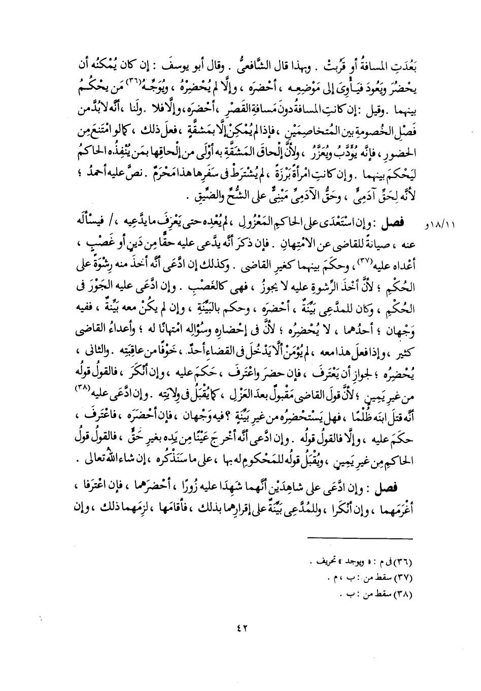بَعُدَتِ المسافةُ أو قرُبتْ. وبهذا قال الشَّافعىُّ. وقال أبو يوسفَ: إن كان يُمْكنُه أن يحْضُرَ ويَعُودَ فيَأْوِىَ إلى مَوْضِعِه، أحْضرَه، وإلَّا لم يُحْضِرْهُ، ويُوَجِّهُ (٣٦) مَن يحْكُم بينهما. وقيل: إن كانتِ المسافةُ دونَ مَسافةِ القَصْرِ، أحْضرَه، وإلَّا فلا. ولَنا، أنَّه لابُدَّ من فَصْلِ الخُصومةِ بين المُتخاصِمَيْنِ، فإذا لم يُمْكِنْ إلَّا بمَشقَّةٍ، فعلَ ذلك، كما لو امْتَنعَ مِن الحضورِ، فإنَّه يُؤَدَّبُ ويُعَزَّرُ، ولأنَّ إلْحاقَ المَشَقَّةِ به أولَى من إلْحاقِها بمَن يُنفِذُه الحاكمُ ليَحْكمَ بينهما. وإن كانتِ امْرأةً بَرْزَةً، لم يُشْترَطْ فى سَفرِها هذا مَحْرَمٌ. نصَّ عليه أحمدُ؛ لأنَّه لِحَقِّ آدَمِىٍّ، وحَقُّ الآدَمِىِّ مَبْنِىٌّ على الشُّحِّ والضِّيقِ.