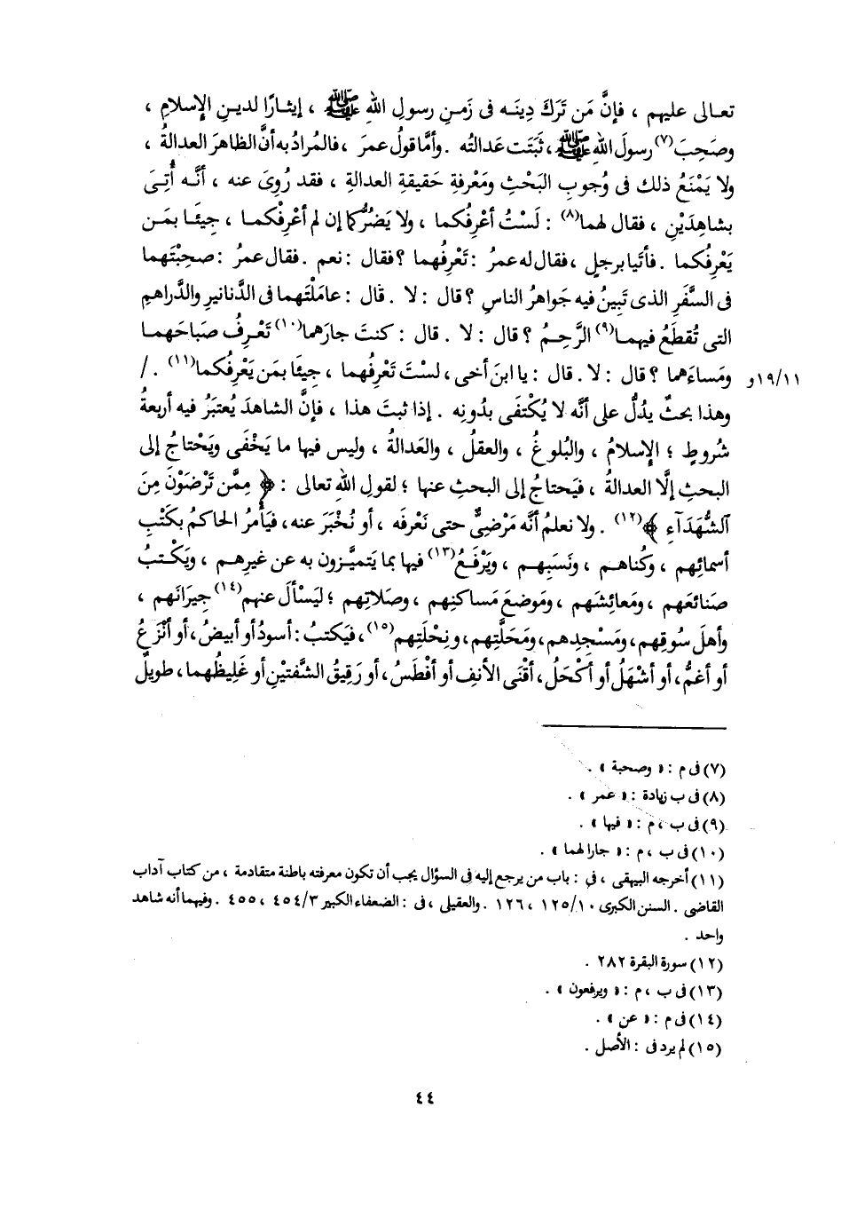 (١١) أخرجه البيهقى، في: باب من يرجع إليه فى السؤال يجب أن تكون معرفته باطنة متقادمة، من كتاب آداب القاضي. السنن الكبرى ١٠/ ١٢٥، ١٢٦. والعقيلى، فى: الضعفاء الكبير ٣/ ٤٥٤، ٤٥٥. وفيهما أنه شاهد واحد.