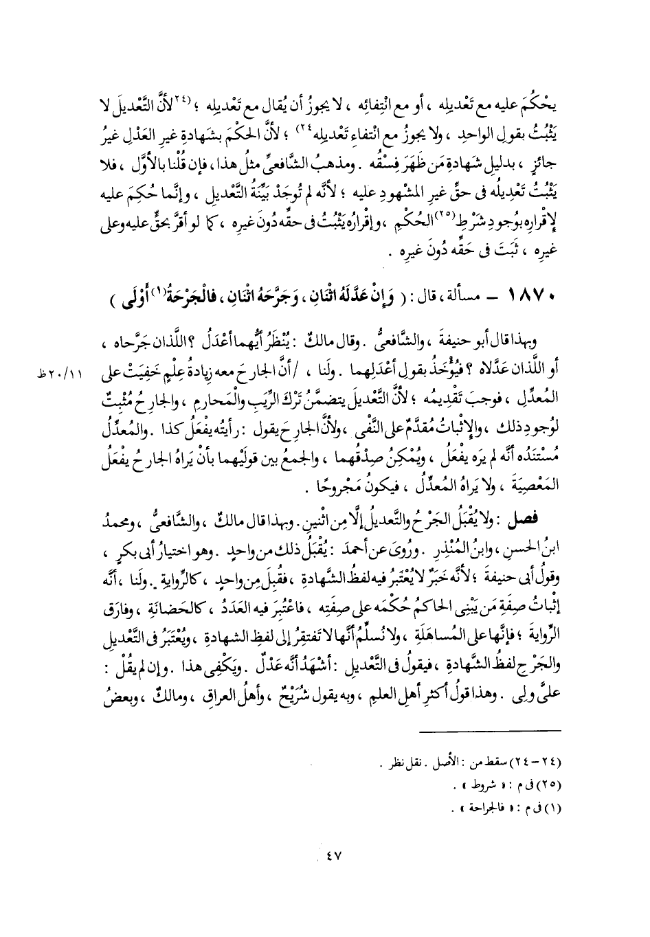 وبهذا قال أبو حنيفةَ، والشَّافعىُّ. وقال مالكٌ: يُنْظَرُ أيُّهما أعْدَلُ؟ اللَّذان جَرَّحاه، أو اللَّذان عَدَّلاه؟ فيُؤْخَذُ بقولِ أعْدَلِهما. ولَنا، أنَّ الجارحَ معه زيادةُ عِلْمٍ خَفِيَتْ على المُعدِّلِ، فوجبَ تَقْدِيمُه؛ لأنَّ التَّعْديلَ يتضمَّنُ تَرْكَ الرِّيَبِ والْمَحارمِ، والجارِحُ مُثْبتٌ لوُجودِ ذلك، والإثْباتُ مُقدَّمٌ على النَّفْى، ولأنَّ الجارِحَ يقول: رأيتُه يفْعَلُ كذا. والمُعَدِّلُ مُسْتنَدُه أنَّه لم يرَه يفْعَلُ، ويُمْكِنُ صِدْقُهما، والجمعُ بين قولَيْهما بأنْ يَراهُ الجارحُ يفْعَلُ المَعْصِيَةَ، ولا يَراهُ المُعدِّلُ، فيكونُ مَجْروحًا.