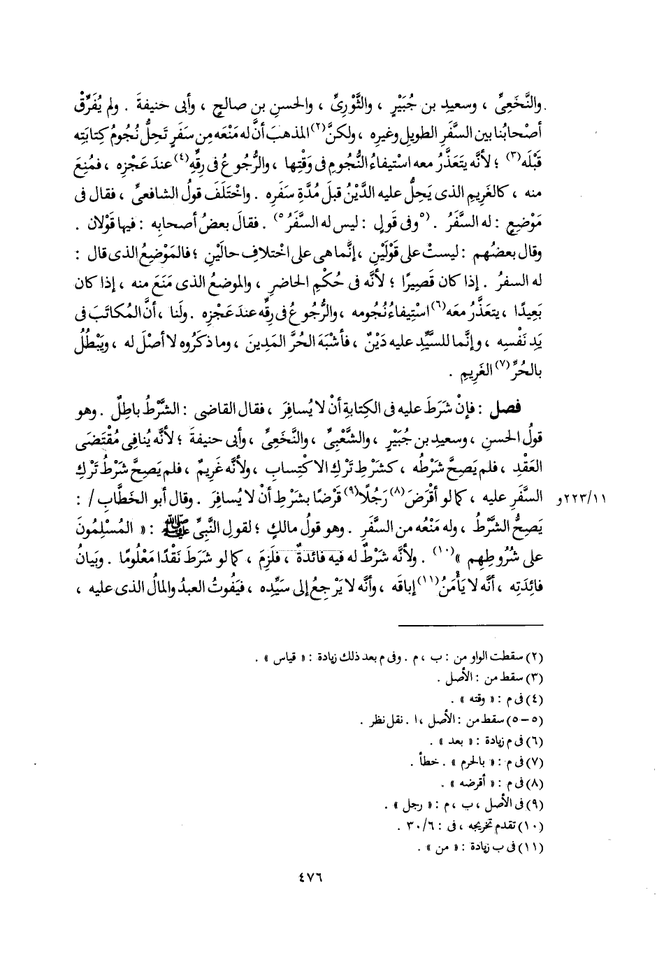فصل: فإنْ شَرَطَ عليه فى الكِتابةِ أَنْ لا يُسافِرَ، فقال القاضى: الشَّرْطُ باطِلٌ. وهو قولُ الحسنِ، وسعيدِ بن جُبَيْرٍ، والشَّعْبِىِّ، والنَّخَعِىِّ، وأبى حنيفةَ؛ لأَنَّه يُنافِى مُقتَضَى العَقْدِ، فلم يَصِحَّ شَرْطُه، كشَرْطِ تَرْكِ الاكْتِسابِ، ولأنَّه غَرِيمٌ، فلم يَصِحَّ شَرْطُ تَرْكِ السَّفَرِ عليه، كما لو أقْرَضَ (٨) رَجُلًا (٩) قَرْضًا بشَرْطِ أَنْ لا يُسافِرَ. وقال أبو الخَطابِ: يَصِحُّ الشَّرْطُ، وله مَنْعُه من السَّفَر. وهو قولُ مالكٍ؛ لقولِ النَّبِىِّ -صلى اللَّه عليه وسلم-: "المُسْلِمُونَ على شُرُوطِهِم" (١٠). ولأنَّه شَرْطٌ له فيه فائدةٌ، فلَزِمَ، كما لو شَرَطَ نَقْدًا مَعْلُومًا. وبَيانُ فائِدَتِه، أنَّه لا يَأْمَنُ (١١) إباقَه، وأنَّه لا يَرْجِعُ إلى سَيِّده، فيَفُوتُ العبدُ والمالُ الذى عليه،