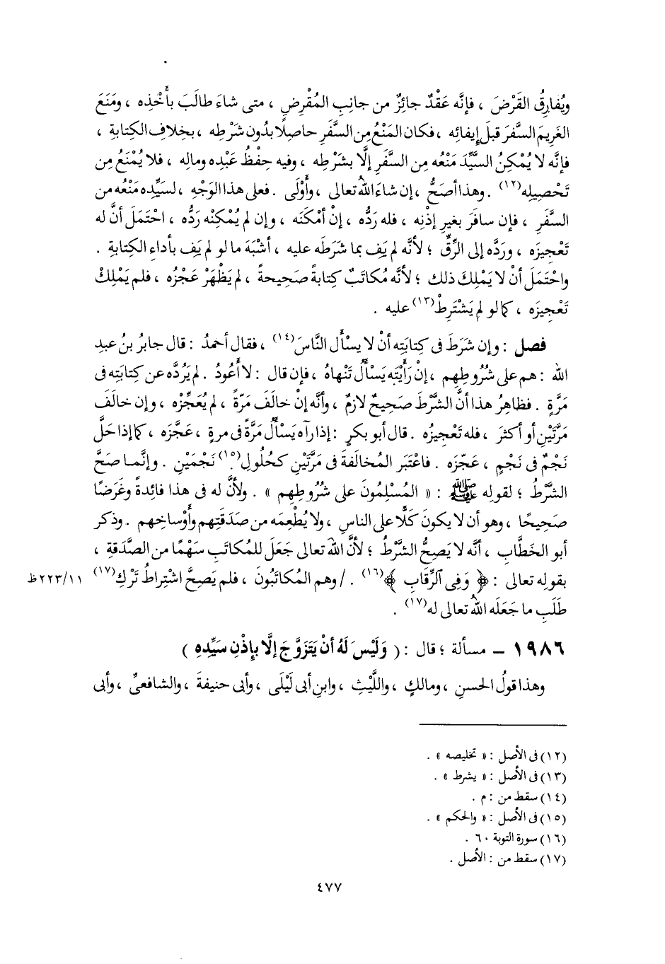 فصل: وإن شَرَطَ فى كِتابَتِه أَنْ لا يسْأَل النَّاسَ (١٤)، فقال أحمدُ: قال جابرُ بنُ عبدِ اللَّه: هم على شُرُوطِهِما، إِنْ رَأيْتَه يَسْأَلُ تَنْهاهُ، فإن قال: لا أَعُودُ. لم يَرُدَّه عن كِتابَتِه فى مَرَّةٍ. فظاهِرُ هذا أَنَّ الشَّرْطَ صَحِيحٌ لازمٌ، وأنَّه إِنْ خالفَ مَرّةً، لم يُعَجِّزْه، وإن خالَفَ مَرَّتَيْنِ أو أكثرَ، فله تَعْجِيزُه. قال أبو بكرٍ: إذا رآه يَسْأَلُ مَرَّة فى مرةٍ، عَجَّزَه، كما إذا حَلَّ نَجْمٌ فى نَجْمٍ، عَجّزَه. فاعْتَبَر المُخالَفةَ فى مَرَّتَيْنِ كحُلُولِ (١٥) نجْمَيْنِ. وإنَّما صَحَّ الشَّرْطُ؛ لقولِه -صلى اللَّه عليه وسلم-: "المُسْلِمُونَ على شُرُطِهِم". ولأنَّ له فى هذا فائِدةً وغَرَضًا صَحِيحًا، وهو أن لا يكونَ كَلًّا على الناسِ، ولا يُطْعِمَه من صَدَقَتِهم وأَوْساخِهم. وذكر أبو الخَطَّابِ، أنَّه لا يَصِحُّ الشَّرْط؛ لأنَّ اللَّه تعالى جَعَلَ للمُكاتَبِ سَهْمًا من الصَّدَقةِ، بقولِه تعالى: {وَفِى الرِّقَابِ} (١٦). وهم المُكاتَبُونَ، فلم يَصِحَّ اشْتِراطُ تَرْكِ (١٧) طَلَبِ ما جَعَلَه اللَّه تعالى له (١٧).