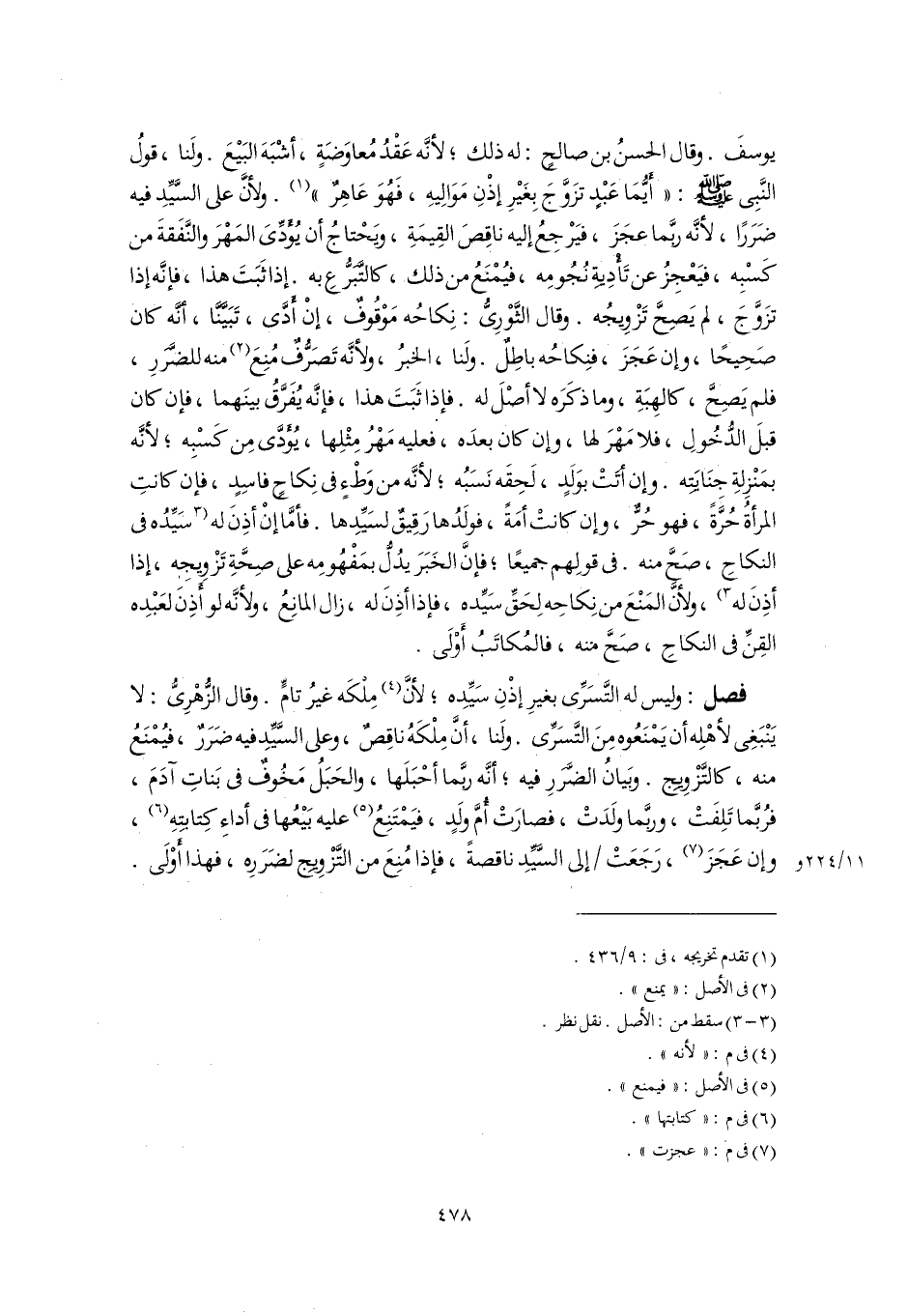 فصل: وليس له التَّسَرِّى بغيرِ إذْنِ سَيِّدِه؛ لأنَّ (٤) مِلْكَه غيرُ تامٍّ. وقال الزُّهْرِىُّ: لا يَنْبَغِى لأهْلِه أن يَمْنَعُوه مِنَ التَّسَرِّى. ولَنا، أَنَّ مِلْكَهُ ناقِصٌ، وعلى السَّيِّدِ فيه ضَرَرٌ، فيُمْنَعُ منه، كالتَّزْوِيج. وبَيانُ الضَّرَرِ فيه؛ أنَّه ربَّما أحْبَلَها، والحَبَلُ مَخُوفٌ فى بَناتِ آدَمَ، فرُبَّما تَلِفَتْ، وربَّما ولَدَتْ، فصارَتْ أُمَّ ولَدٍ، فيَمْتَنِعُ (٥) عليه بَيْعُها فى أداءِ كِتابتِهِ (٦)، وإن عَجَزَ (٧)، رَجَعَتْ إلى السَّيِّدِ ناقصةً، فإذا مُنِعَ من التَّزْوِيج لضَرَرِه، فهذا أَوْلَى.