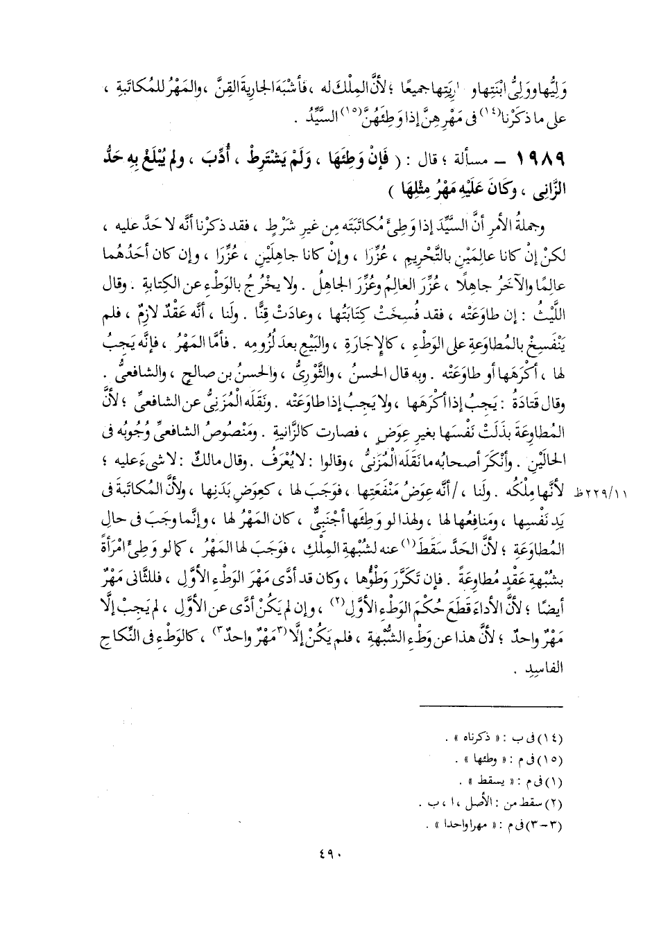 وجملةُ الأمرِ أَنَّ السَّيِّدَ إذا وَطِئَ مُكاتَبَتَه مِن غيرِ شَرْطٍ، فقد ذكرْنا أنَّه لا حَدَّ عليه، لكنْ إن كانا عالِمَيْنِ بالتَّحْرِيِم، عُزِّرَا، وإِنْ كانا جاهِلَيْنِ، عُزِّرَا، وإن كان أحَدُهُما عالِمًا والآخَرُ جاهِلًا، عُزِّرَ العالِمُ عُزِّرَ الجاهِلُ. ولا يخْرُجُ بالوَطْءِ عن الكِتابةِ. وقال اللَّيْثُ: إن طاوَعَتْه، فقد فُسِخَتْ كِتَابَتُها، وعادَتْ قِنًّا. ولَنا، أنَّه عَقْدٌ لازِمٌ، فلم يَنْفَسِخْ بالمُطاوَعةِ على الوَطْءِ، كالإِجَارَةِ، والبَيْعِ بعدَ لُزُومِه. فأمَّا المَهْرُ، فإنَّه يَجِبُ لها، أكْرَهَها أو طاوَعَتْه. وبه قال الحسنُ، والثَّوْرِىُّ، والحسنُ بن صالحٍ، والشافعىُّ. وقال قَتادَةُ: يَجِبُ إذا أكْرَهَها، ولا يَجِبُ إذا طاوَعَتْه. ونَقَلَه الْمُزَنِىُّ عن الشافعىِّ؛ لأنَّ المُطاوِعَةَ بذَلَتْ نَفْسَها بغيرِ عِوَضٍ، فصارت كالزَّانيةِ. ومَنْصُوصُ الشافعىِّ وُجُوبُه فى الحالَيْنِ. وأنْكَرَ أصحابُه ما نَقَلَه الْمزَنىُّ، وقالوا: لا يُعْرَفُ. وقال مالكٌ: لا شئَ عليه؛ لأنَّها مِلْكُه. ولَنا، أنَّه عِوَضُ مَنْفَعَتِها، فوَجَبَ لها، كعِوَضِ بَدَنِها، ولأنَّ المُكاتَبةَ فى يَدِ نَفْسِها، ومَنافِعُها لها، ولهذا لو وَطِئَها أجْنَبِىٌّ، كان المَهْرُ لها، وإنَّما وجَبَ فى حالِ المُطاوَعَةِ؛ لأنَّ الحَدَّ سَقَطَ (١) عنه لشُبْهةِ المِلْكِ، فوَجَبَ لها المَهْرُ، كما لو وَطِئَ امْرَأةً بشُبْهةِ عَقْدٍ مُطاوِعَةً. فإِنَّ تَكَرَّرَ وَطْؤُها، وكان قد أدَّى مَهْرَ الوَطْءِ الأوَّلِ، فللثَّانى مَهْرٌ أيضًا؛ لأنَّ الأداءَ قَطَعَ حُكْمَ الوَطْءِ الأوَّلِ (٢)، وإن لم يَكُنْ أدَّى عن الأوَّلِ، لم يَجِبْ إِلَّا مَهْرٌ واحدٌ؛ لأنَّ هذا عن وَطْءِ الشُّبْهةِ، فلم يَكُنْ إِلَّا [مَهْرٌ واحدٌ] (٣)، كالوَطْءِ فى النِّكاحِ الفاسِدِ.