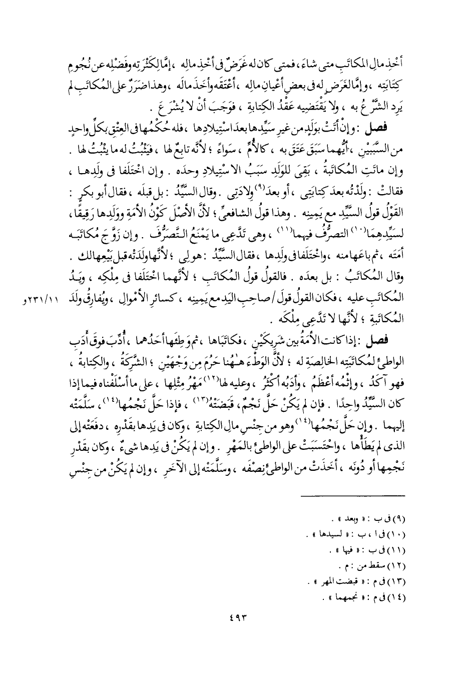فصل: إذا كانت الأمَةُ بين شَرِيكَيْنِ، فكاتَبَاها، ثم وَطِئَها أحَدُهما، أُدِّبَ فوقَ أَدَبِ الواطئِ لمُكاتَبَتِه الخالِصَةِ له؛ لأنَّ الوَطْءَ ههُنا حَرُمَ مِن وَجْهَيْنِ؛ الشَّرِكِةُ، والكِتابةُ، فهو آكَدُ، وإثْمُه أعْظَمُ، وأدَبُه أكْثَرُ، وعليه لها (١٢) مَهْرُ مِثْلِها، على ما أسْلَفْناه فيما إذا كان السَّيِّدُ واحِدًا. فإِن لم يَكُنْ حَل نَجْمٌ، قَبَضَتْهُ (١٣)، فإذا حَلَّ نَجْمُها (١٤)، سَلَّمَتْه إليهما. وإن حَلَّ نَجْمُها (١٤) وهو من جِنْسِ مالِ الكِتابةِ، وكان فى يَدها بقَدْرِه، دفَعَتْه إلى الذى لم يَطَأْها، واحْتَسَبَتْ على الواطئِ بالمَهْرِ. وإن لم يَكُنْ فى يَدِها شىءٌ، وكان بقَدْرِ نَجْمِها أو دُونَه، أخَذَتْ من الواطئِ نِصْفَه، وسَلَّمَتْه إلى الآخَرِ، وإن لم يَكُنْ من جِنْسِ