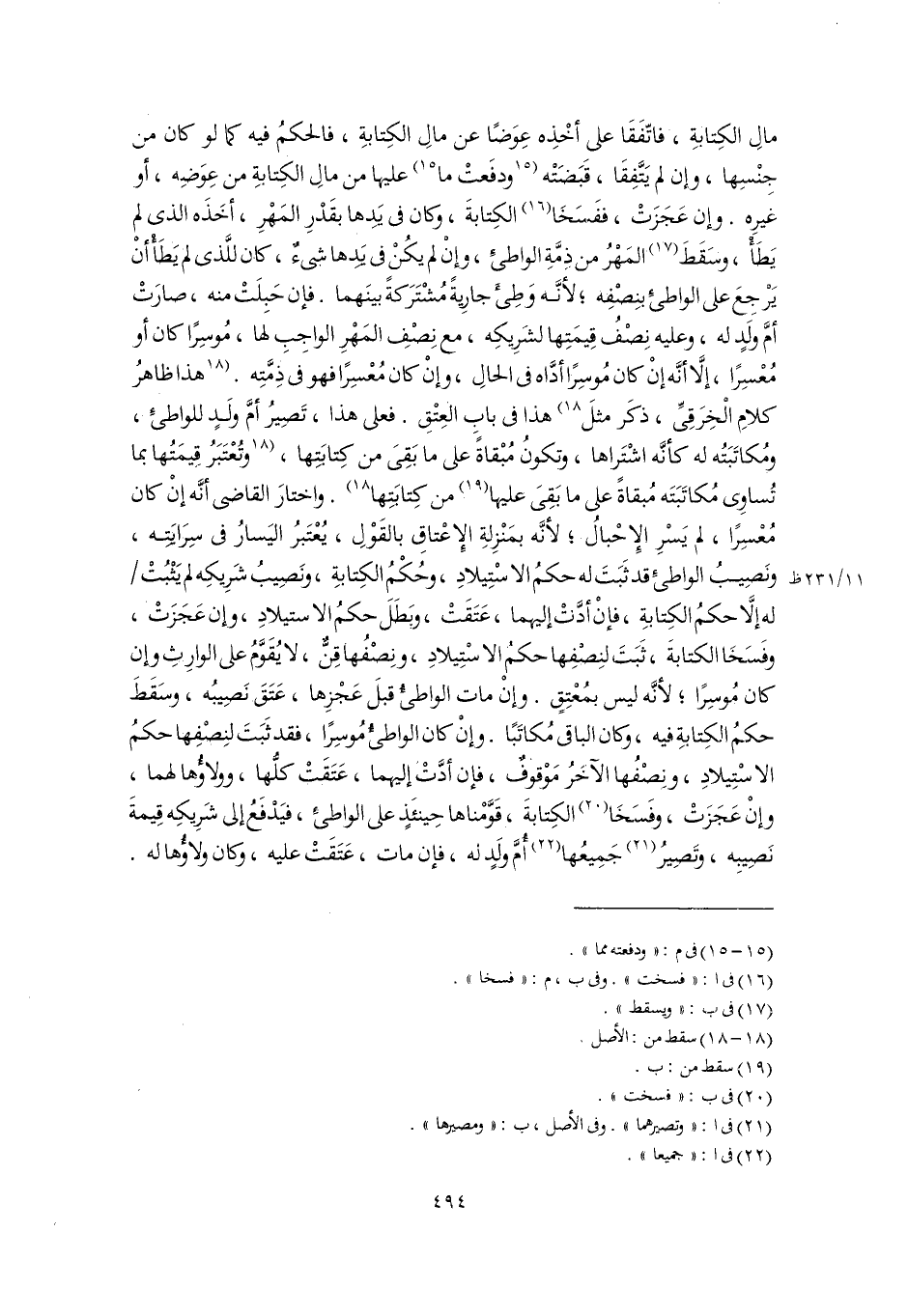 مالِ الكِتابةِ، فاتّفَقَا على أخْذِه عِوَضًا عن مالِ الكِتابةِ، فالحكمُ فيه كما لو كان من جِنْسِها، وإن لم يَتَّفِقَا، قَبَضَتْه [ودفَعتْ ما] (١٥) عليها من مالِ الكِتابةِ من عِوَضِه، أو غيرِه. وإن عَجَزَتْ، ففَسَخَا (١٦) الكِتابةَ، وكان فى يَدِها بقَدْرِ المَهْرِ، أخَذَه الذى لم يَطَأْ، وسَقَطَ (١٧) المَهْرُ من ذمَّةِ الواطئِ، وإِنْ لم يكُنْ فى يَدِها شىءٌ، كان للَّذى لم يَطَأْ أَنَّ يَرْجِعَ على الواطئِ بنِصْفِه؛ لأَنَّه وَطِئَ جارِيةً مُشْتَرَكةً بينَهما. فإِن حَبِلَتْ منه، صارَتْ أمَّ ولَدٍ له، وعليه نِصْفُ قِيمَتِها لشَرِيكِه، مع نِصْفِ المَهْرِ الواجِبِ لها، مُوسِرًا كان أو مُعْسِرًا، إِلَّا أنَّه إِنْ كان مُوسِرًا أدَّاه فى الحالِ، وإِنْ كان مُعْسِرًا فهو فى ذِمَّتِه. [هذا ظاهرُ كلامِ الْخِرَقِىِّ، ذكَر مثلَ] (١٨) هذا فى بابِ العِتْقِ. فعلى هذا، تَصِيرُ أمَّ ولَدٍ للواطئِ، ومُكاتَبَتُه له كأنَّه اشْتَراها، وتكونُ مُبْقاةً على ما بَقِىَ من كِتابَتِها، [أو تُعْتَبَرُ قِيمَتُها بما تُساوِى مُكاتَبَتَه مُبقاةً على ما بَقِىَ عليها (١٩) من كِتابَتِها] (١٨). واختارَ القاضى أنَّه إِنْ كان مُعْسِرًا، لم يَسْرِ الإِحْبالُ؛ لأَنَّه بمَنْزِلةِ الإِعْتاقِ بالقَوْلِ، يُعْتَبرُ اليَسارُ فى سِرَايَتِه، ونَصِيبُ الواطئِ قدثَبَتَ له حكمُ الاسْتِيلادِ، وحُكْمُ الكِتابةِ، ونَصِيبُ شَرِيكِه لم يَثْبُتْ له إِلَّا حكمُ الكِتابةِ، فإنْ أدَّتْ إليهما، عَتَقَتْ، وبَطَلَ حكمُ الاستيلادِ، وإن عَجَزَتْ، وفَسَخَا الكتابةَ، ثَبَتَ لنِصْفِها حكمُ الاسْتِيلادِ، ونِصْفُها قِنٌّ، لا يُقَوَّمُ على الوارِثِ وإن كان مُوسِرًا؛ لأَنَّه ليس بمُعْتِقٍ. وإِنْ مات الواطئِ قبلَ عَجْزِها، عَتَقَ نَصِيبُه، وسَقَطَ حكمُ الكِتابةِ فيه، وكان الباقى مُكاتَبًا. وإِنْ كان الواطئِ مُوسِرًا، فقد ثَبَتَ لنِصْفِها حكمُ الاسْتِيلادِ، ونِصْفُها الآخَرُ مَوْقوفٌ، فإِنَّ أدَّتْ إليهما، عَتَقَتْ كلُّها، وولاؤُها لهما، وإِنْ عَجَزَتْ، وفَسَخَا (٢٠) الكِتابةَ، قَوَّمْناها حِينئَذٍ على الواطئِ، فيَدْفَعُ إلى شَرِيكِه قِيمةَ نَصِيبِه، وتَصِيرُ (٢١) جَمِيعُها (٢٢) أُمَّ ولَدٍ له، فإِنَّ مات، عَتَقَتْ عليه، وكان ولاؤُها له.