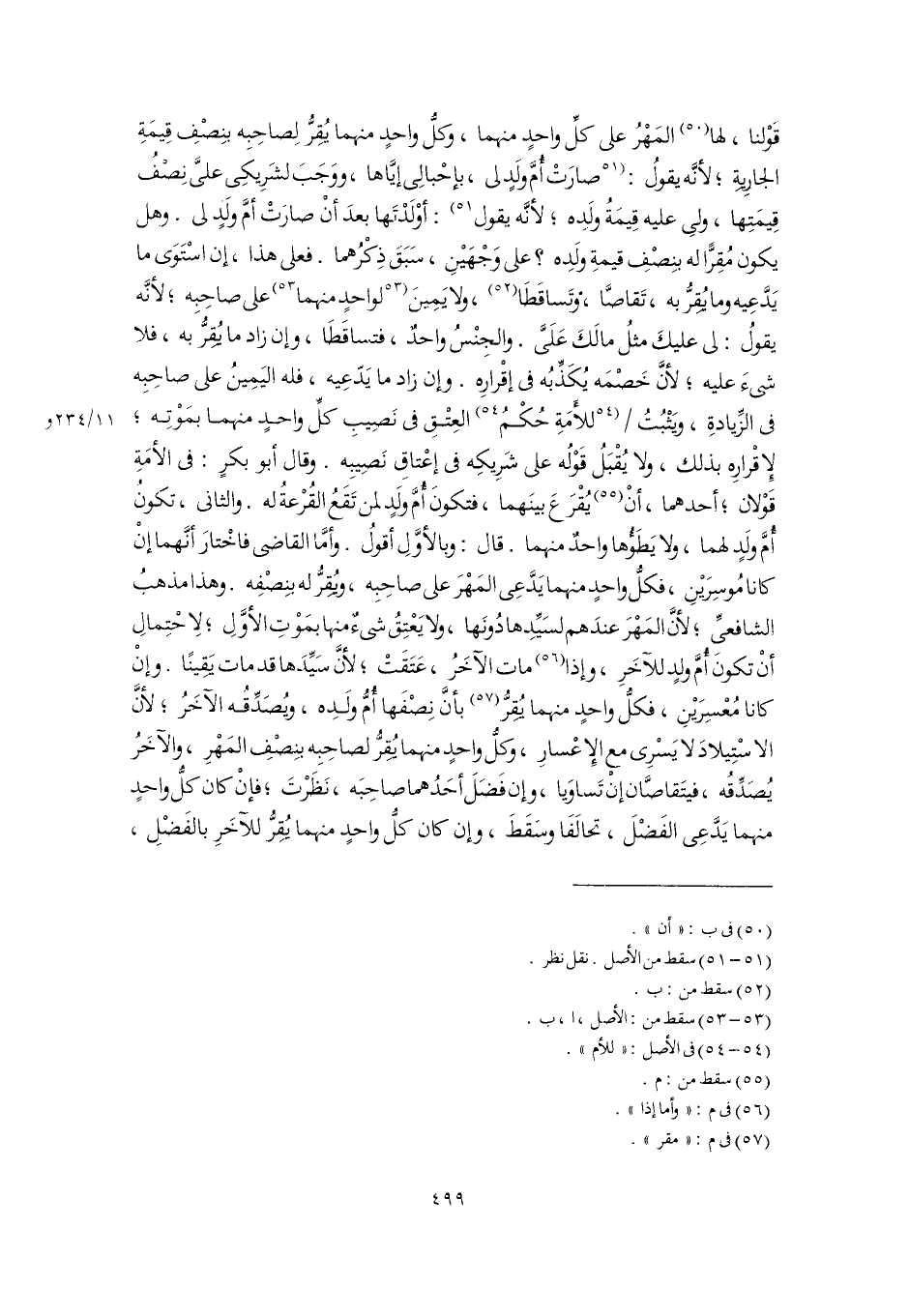 قَوْلنا، لها (٥٠) المَهْرُ على كلِّ واحدٍ منهما، كلُّ واحدٍ منهما يُقِرُّ لِصاحِبِه بنِصْفِ قِيمَةِ الجارِيةِ؛ لأَنَّه يقولُ: [صارَتْ أُمَّ ولَدٍ لى، بإحْبالِى إيَّاها، ووَجَبَ لشَرِيكِى علىَّ نِصْفُ قِيمَتِها، ولىِ عليه قِيمَةُ ولَدِه؛ لأَنَّه يقول] (٥١): أوْلَدْتَها بعدَ أَنْ صارَتْ أمَّ ولَدٍ لى. وهل يكون مُقِرًّا له بنِصْفِ قيصةِ ولَدِه؟ على وَجْهَيْن، سَبَقَ ذِكْرُهما. فعلى هذا، إن اسْتَوَى ما يَدَّعِيه وما يُقِرُّ به، تَقاصَّا، وتَساقَطَا (٥٢)، ولا يَمِينَ [لواحدٍ منهما] (٥٣) على صاحِبِه؛ لأَنَّه يقولُ: لى عليكَ مثلُ مالَكَ عَلَىَّ. والجِنْسُ واحدٌ، فتساقَطَا، وإن زاد ما يُقِرُّ به، فلا شىءَ عليه؛ لأنَّ خَصْمَه يُكَذِّبُه فى إقْرارِه. وإن زاد ما يَدّعِيه، فله اليَمِينُ على صاحِبِه فى الزِّيادةِ، ويَثْبُتُ [للأَمَةِ حُكْمُ] (٥٤) العِتْقِ فى نَصِيبِ كلِّ واحدٍ منهما بمَوْتِه؛ لإِقْرارِه بذلك، ولا يقْبَلُ قَوْلُه على شرِيكِه فى إعْتاقِ نَصِيبِه. وقال أبو بكرٍ: فى الأَمَةِ قَوْلان؛ أحدهما، أَنْ (٥٥) يُقْرَعَ بينَهما، فتكونَ أُمَّ ولَدٍ لمن تَقعُ القُرْعةُ له. والثانى، تكونُ أُمَّ ولَدٍ لهما، ولا يَطَؤُها واحدٌ منهما. قال: وبالأوَّلِ أقولُ. وأمَّا القاضى فاخْتارَ أنَّهما إِنْ كانا مُوسِرَيْنِ، فكلُّ واحدٍ منهما يَدَّعِى المَهْرَ على صاحِبِه، ويُقِرُّ له بنِصْفِه. وهذا مذهبُ الشافعىِّ؛ لأنَّ المَهْرَ عندَهم لسَيِّدِها دُونَها، ولا يَعْتِقُ شىءٌ منها بمَوْتِ الأوَّلِ؛ لِاحْتِمال أَنْ تكونَ أُمَّ ولدٍ للآخَرِ، وإذا (٥٦) مات الآخر، عَتَقَتْ؛ لأنَّ سَيِّدَها قد مات يَقِينًا، وإِنْ كانا مُعْسِرينِ، فكلُّ واحدٍ منهما يُقِرُّ (٥٧) بأنَّ نِصْفَها أُمُّ ولَدِه، ويُصَدِّقُه الآخَرُ؛ لأنَّ الاسْتِيلادَ لا يَسْرِى مع الإِعْسارِ، وكلُّ واحدٍ منهما يُقِرُّ لصاحِبِهِ بنِصْفِ المَهْرِ، والآخَرُ يُصَدِّقُه، فيتَقاصَّان إِنْ تَساوَيا، وإن فَضَلَ أحدُهما صاحِبَه، نَظَرْتَ؛ فإنْ كان كلُّ واحدٍ منهما يَدَّعِى الفَضْلَ، تحالَفَا وسَقَطَ، وإن كان كلُّ واحدٍ منهما يُقِرُّ للآخَرِ بالفَضْلِ،