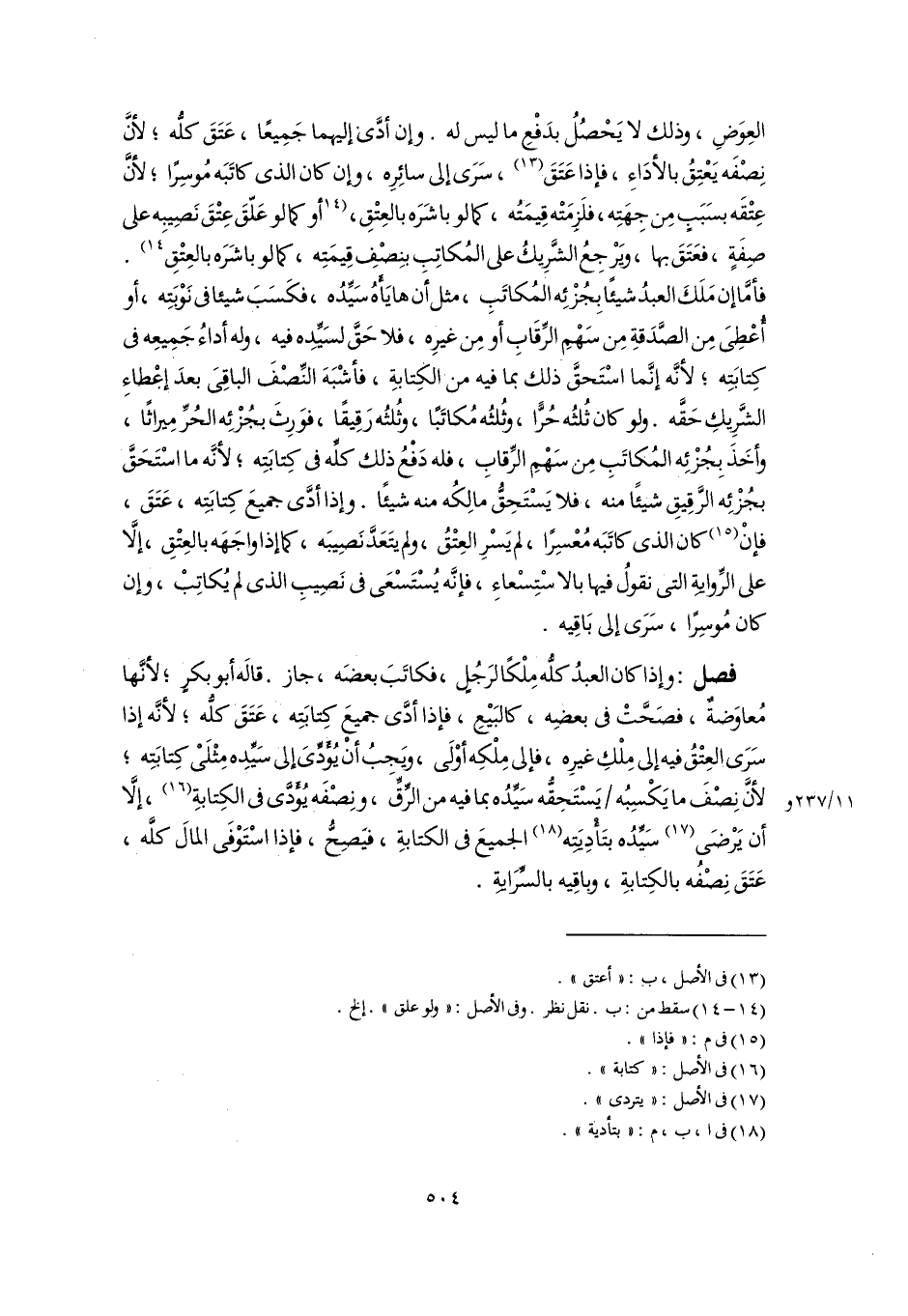 فصل: وإذا كان العبدُ كلُّه مِلْكًا لرَجُلٍ، فكاتَبَ بعضَه، جاز. قالَه أبو بكرٍ؛ لأنَّها مُعاوَضةٌ، فصَحَّتْ فى بعضِه، كالبَيْعِ، فإذا أدَّى جميعَ كِتابَتِه، عَتَقَ كلُّه؛ لأَنَّه إذا سَرَى العِتْقُ فيه إلى مِلْكِ غيرِه، فإلى مِلْكِه أوْلَى، ويَجِبُ أَنْ يُؤدِّىَ إلى سَيِّدِه مِثْلَىْ كِتابَتِه؛ لأنَّ نِصْفَ ما يَكْسِبُه يَسْتَحِقُه سَيِّدُه بما فيه من الرِّقِّ، ونِصْفَه يُؤَدَّى فى الكِتابةِ (١٦)، إِلَّا أن يَرْضَى (١٧) سَيِّدُه بتَأدِيَتِه (١٨) الجميعَ فى الكتابةِ، فيَصِحُّ، فإذا اسْتَوْفَى المالَ كلَّه، عَتَقَ نِصْفُه بالكِتابةِ، وباقِيه بالسِّرَايةِ.