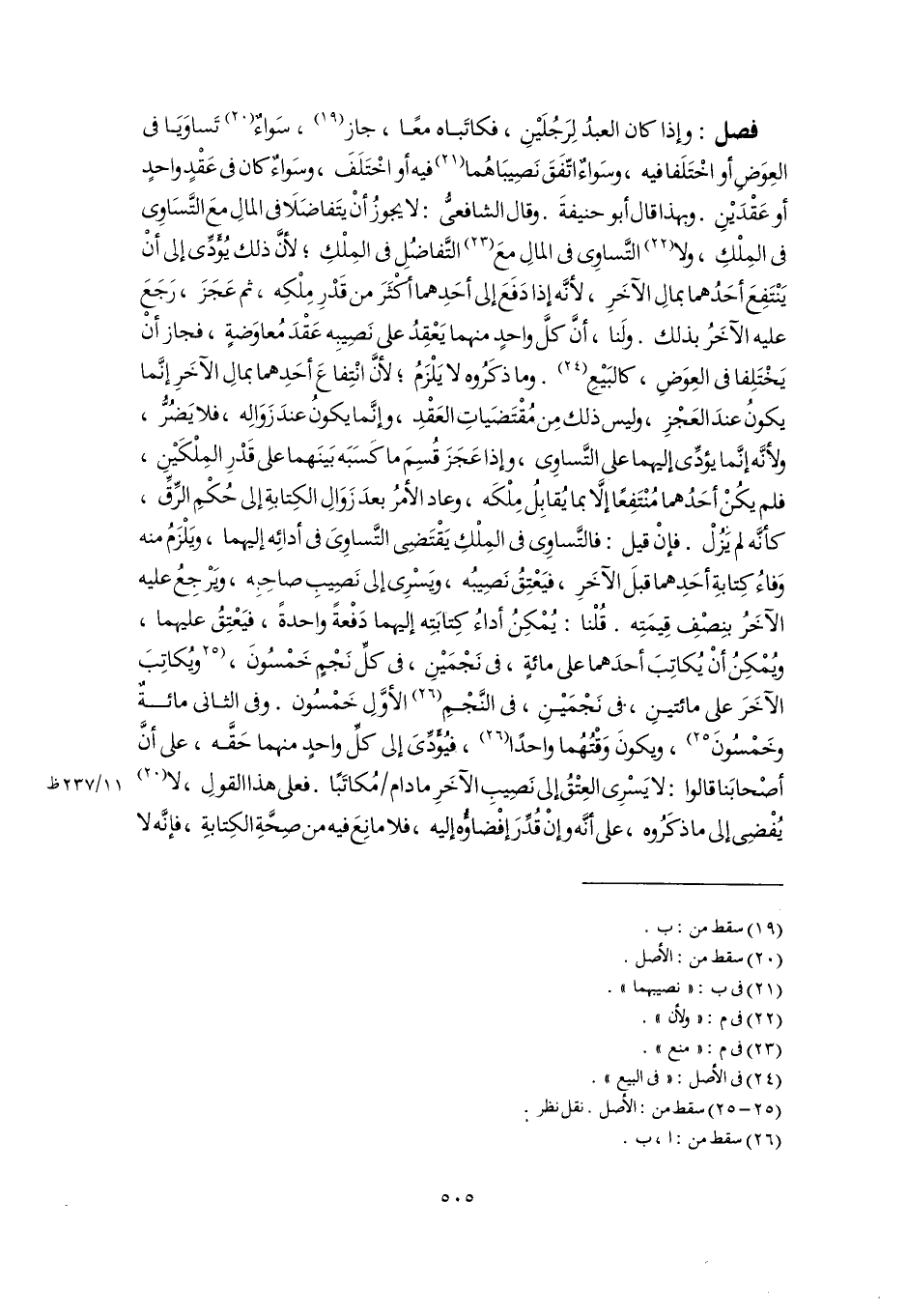 فصل: وإذا كان العبدُ لِرَجُلَيْنِ، فكاتَباه معًا، جاز (١٩)، سَواءٌ (٢٠) تَساوَيَا فى العِوَض أو اخْتَلَفا فيه، وسَواءٌ اتّفَقَ نَصِيبَاهُما (٢١) فيه أو اخْتَلَفَ، وسَواءٌ كان فى عَقْدٍ واحدٍ أو عَقْدَيْنِ. وبهذا قال أبو حنيفةَ. وقال الشافعىُّ: لا يجوزُ أَنْ يتَفاضَلَا فى المالِ معَ التَّسَاوِى فى المِلْكِ، ولا (٢٢) التَّساوِى فى المالِ معَ (٢٣) التَّفاضُلِ فى المِلْكِ؛ لأنَّ ذلك يُؤَدِّى إلى أَنْ يَنْتَفِعَ أحَدُهما بمالِ الآخَرِ؛ لأَنَّه إذا دَفَعَ إلى أحَدِهما أكْثَرَ من قَدْرِ مِلْكِه، ثم عَجَزَ، رَجَعَ عليه الآخَرُ بذلك. ولَنا، أَنَّ كلَّ واحدٍ منهما يَعْقِدُ على نَصِيبِه عَقْدَ مُعاوَضةٍ، فجاز أَنْ يَخْتَلِفا فى العِوَضِ، كالبَيْعِ (٢٤). وما ذكَرُوه لا يَلْزَمُ؛ لأنَّ انْتِفاعَ أحَدِهما بمالِ الآخَرِ إنَّما يكونُ عندَ العَجْزِ، وليس ذلك مِن مُقْتَضَياتِ العَقْدِ، وإنَّما يكونُ عندَ زَوَالِه، فلا يَضُرُّ، ولأنَّه إنَّما يؤدِّى إليهما على التَّساوِى، وإذا عَجَزَ قُسِمَ ما كَسَبَه بَينَهما على قَدْرِ المِلْكَيْنِ، فلم يكُنْ أحَدُهما مُنْتَفِعًا إِلَّا بما يُقابِلُ مِلْكَه، وعاد الأمرُ بعدَ زَوَالِ الكِتابةِ إلى حُكْمِ الرِّقِّ، كأنَّه لم يَزُلْ. فإنْ قيل: فالتَّساوِى فى المِلْكِ يَقْتَضِى التَّساوِىَ فى أدائِه إليهما، ويَلْزَمُ منه وَفاءُ كِتابةِ أحَدِهما قبلَ الآخَرِ، فيَعْتِقُ نَصِيبُه، ويَسْرى إلى نَصِيبِ صاحِبِه، ويَرْجعُ عليه الآخَرُ بنِصْفِ قِيمَتِه. قُلْنا: يُمْكِنُ أداءُ كِتابَتِه إليهما دَفْعةً واحدةً، فيَعْتِقُ عليهما، ويُمْكِنُ أَنْ يُكاتِبَ أحدَهما على مائةٍ، فى نَجْمَيْنِ، فى كلِّ نَجْمٍ خَمْسُونَ، [ويُكاتِبَ الآخَرَ على مائتينِ، فى نَجْمَيْنِ، فى النَّجْمِ (٢٦) الأوَّلِ خَمْسُون. وفى الثانى مائةٌ وخَمْسُونَ] (٢٥)، ويكونَ وَقْتُهُما واحدًا (٢٦)، فيُؤَدِّىَ إلى كلِّ واحدٍ منهما حَقَّه، على أَنَّ أصْحابَنا قالوا: لا يَسْرِى العِتْقُ إلى نَصِيبِ الآخَرِ ما دام مُكاتَبًا. فعلى هذا القولِ، لا (٢٠) يُفْضِى إلى ما ذكَرُوه، على أنَّه وإِنْ قُدِّرَ إفْضاؤُه إليه، فلا مانِعَ فيه من صِحَّةِ الكِتابةِ، فإنَّه لا