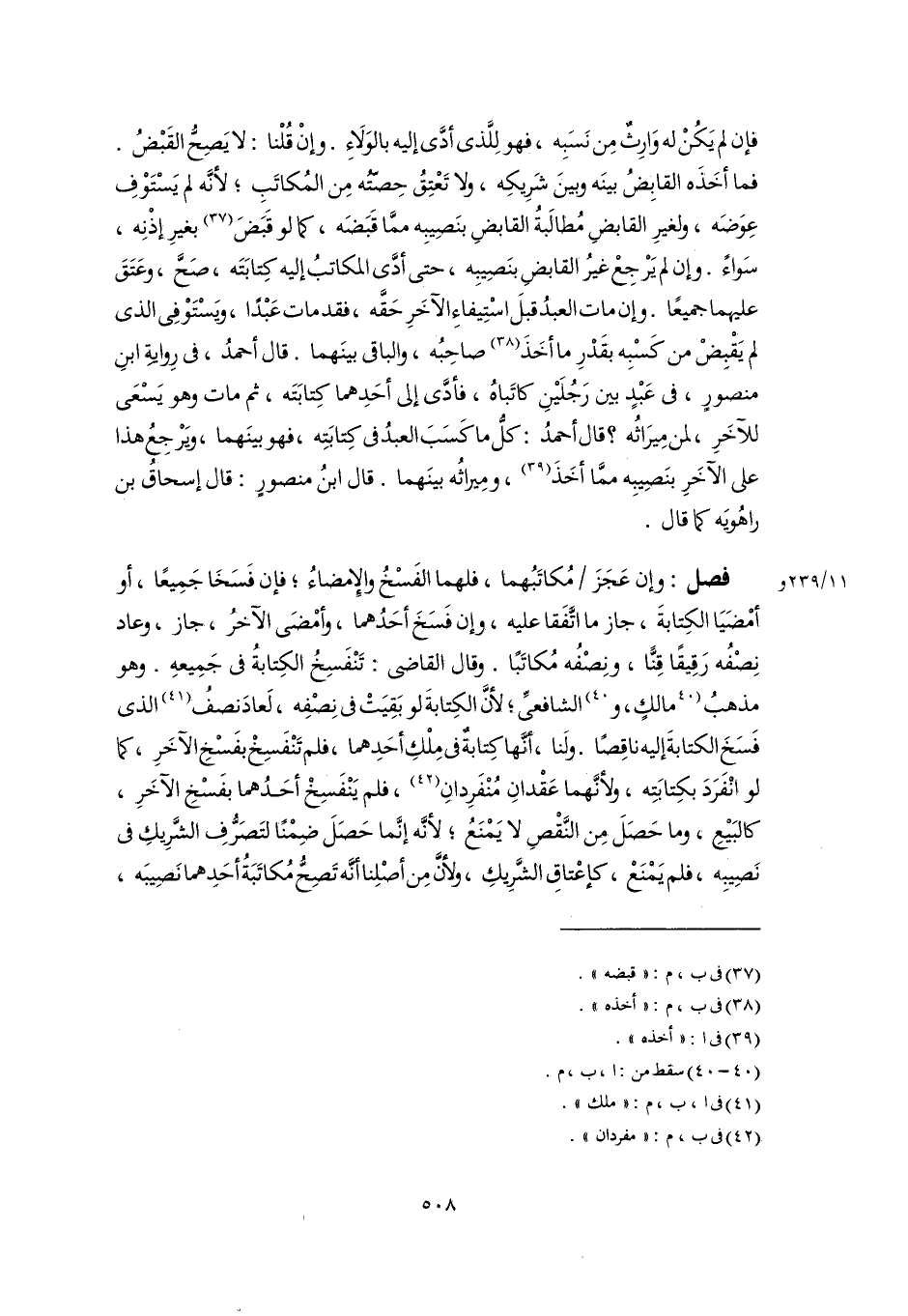 فإن لم يَكُنْ له وَارِثٌ مِن نَسَبِه، فهو لِلَّذى أدَّى إليه بالوَلَاءِ. وإِنْ قُلْنا: لا يَصِحُّ القَبْضُ. فما أخَذَه القابِضُ بينَه وبينَ شَرِيكِه، ولا تَعْتِقُ حِصّته مِن المُكاتَبِ؛ لأَنَّه لم يَسْتَوْفِ عِوَضَه، ولغيرِ القابضِ مُطالَبةُ القابضِ بنَصِيبِه ممَّا قَبَضَه، كما لو قَبَضَ (٣٧) بغيرِ إذْنِه، سَواءً. وإن لم يَرْجِعْ غيرُ القابض بنَصِيبِه، حتى أدَّى المكاتبُ إليه كِتابَتَه، صَحَّ، وعَتَقَ عليهما جميعًا. وإن مات العبدُ قبلَ اسْتِيفاءِ الآخَرِ حَقَه، فقد مات عَبْدًا، ويَسْتَوْفِى الذى لم يَقْيضْ من كَسْبِه بقَدْرِ ما أخَذَ (٣٨) صاحِبُه، والباقى بينَهما. قال أحمدُ، فى رِوايةِ ابنِ منصورٍ، فى عَبْدٍ بين رَجُلَيْنِ كاتَباهُ، فأدَّى إلى أحَدِهما كِتابَتَه، ثم مات وهو يَسْعَى للآخَرِ، لمن مِيرَاثُه؟ قال أحمدُ: كلُّ ما كَسَبَ العبدُ فى كِتابَتِه، فهو بينَهما، ويَرْجِعُ هذا على الآخَرِ بنَصِيبِه ممَّا أخَذَ (٣٩)، ومِيراثُه بينَهما. قال ابنُ منصورٍ: قال إسحاقُ بن راهُويَه كما قال.