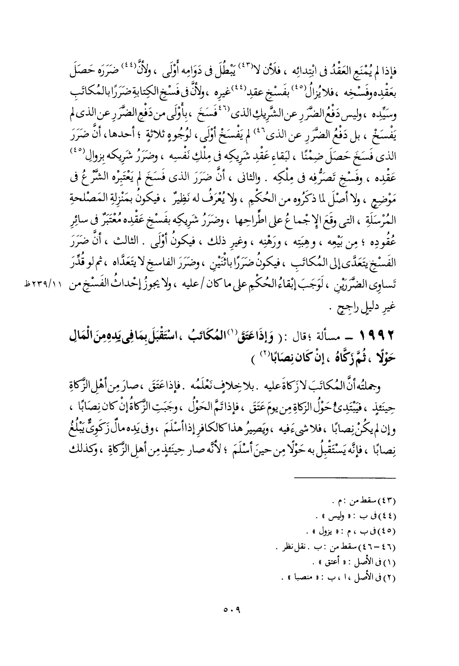 فإذا لم يُمْنَعِ العَقْدُ فى ابْتِدائِه، فلَأن لا (٤٣) يَبْطُلَ فى دَوَامِه أوْلَى، ولأنَّ (٤٤) ضَرَرَه حَصَلَ بعَقْدِه وفَسْخِه، فلا يُزالُ (٤٥) بفَسْخِ عقدِ (٤٤) غيرِه، ولأنَّ فى فَسْخِ الكِتابةِ ضَرَرًا بالمُكاتَبِ وسَيِّدِه، وليس دَفْعُ الضَّرَرِ عن الشَّرِيكِ الذى [فَسَخَ، بِأَوْلَى من دَفْعِ الضَّرَر عن الذى لم يَفْسَخْ، بل دَفْعُ الضَّرَر عن الذى] (٤٦) لم يَفْسَخْ أوْلَى، لوُجُوهٍ ثلاثةٍ؛ أحدها، أَنَّ ضَرَرَ الذى فسَخَ حَصَلَ ضِمْنًا، لبَقاءِ عَقْدِ شَرِيكِه فى مِلْكِ نَفْسِه، وضَرَرُ شَرِيكه بِزوالِ (٤٥) عَقْدِه، وفسْخِ تَصَرُّفِه فى مِلْكِه. والثانى، أَنَّ ضَرَرَ الذى فَسَخَ لم يَعْتَبِرْه الشَّرْعُ فى مَوْضِع، ولا أصْلَ لما ذكَرُوه من الحُكْمِ، ولا يُعْرَفُ له نَظِيرٌ، فيكون بمَنْزِلةِ المَصْلحةِ المُرْسَلَةِ، التى وقَعَ الإِجْماعُ على اطِّراحِها، وضَرَرُ شَرِيكِه بفَسْخِ عَقْدِه مُعْتَبَرٌ فى سائِرِ عُقُودِه؛ مِن بَيْعِه، وهِبَتِه، ورَهْنِه، وغيرِ ذلك، فيكونُ أوْلَى. الثالث، أَنَّ ضَرَرَ الفَسْخِ يتَعَدَّى إلى المُكاتَبِ، فيكونُ ضَرَرًا باثْنَيْنِ، وضَرَرَ الفاسخِ لا يتَعَدَّاه، ثم لو قُدِّرَ تَساوِى الضَّرَرَيْنِ، لَوَجَبَ إبْقاءُ الحُكْمِ على ما كان لم عليه، ولا يجوزُ إحْداثُ الفَسْخِ من غيرِ دليلٍ راجِحٍ.