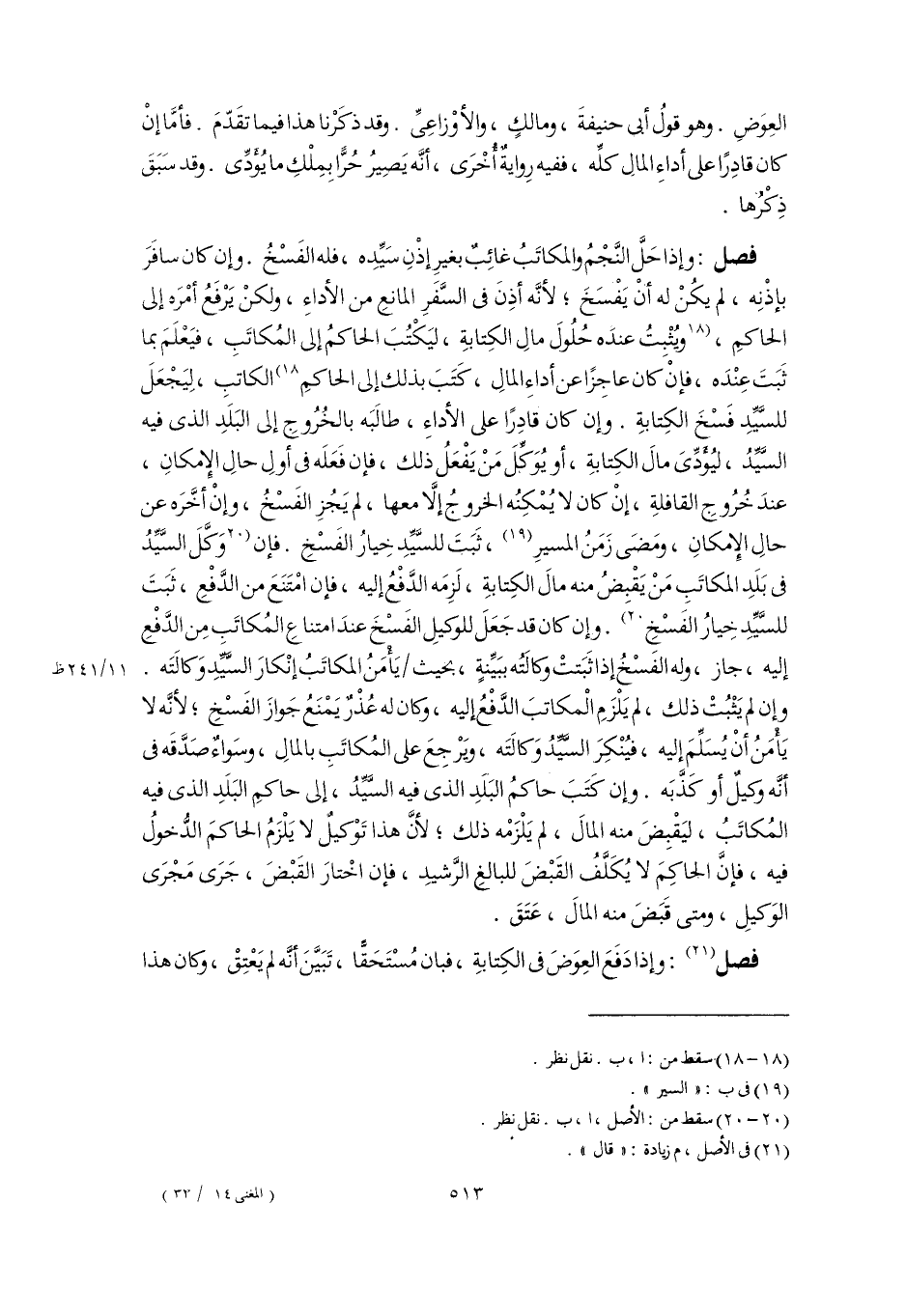 فصل: وإذا حَلَّ النَّجْمُ والمكاتَبُ غائِبٌ بغيرِ إذْنِ سَيِّدِه، فله الفَسْخُ. وإن كان سافَرَ بإذْنِه، لم يكُنْ له أَنْ يَفْسَخَ؛ لأَنَّه أذِنَ فى السَّفَرِ المانعِ من الأداءِ، ولكنْ يَرْفَعُ أمْرَه إلى الحاكِم، [ويُثْبِتُ عندَه حُلُولَ مالِ الكِتابةِ، ليَكْتُبَ الحاكمُ إلى المُكاتَبِ، فيَعْلَمَ بما ثَبَتَ عِنْدَه، فإنْ كان عاجِزًا عن أداءِ المالِ، كَتَبَ بذلك إلى الحاكمِ] (١٨) الكاتبِ، لِيَجْعَلَ للسَّيِّدِ فَسْخَ الكِتابةِ. وإن كان قادِرًا على الأداءِ، طالَبَه بالخُرُوجِ إلى البَلَدِ الذى فيه السَّيِّدُ، ليُؤَدِّىَ مالَ الكِتابةِ، أو يُوَكِّلَ مَنْ يَفْعَلُ ذلك، فإن فَعَلَه فى أولِ حالِ الإِمكانِ، عندَ خُرُوجِ القافلةِ، إِنْ كان لا يُمْكِنُه الخروجُ إِلَّا معها، لم يَجُزِ الفَسْخُ، وإِنْ أخَّرَه عن حالِ الإِمكانِ، ومَضَى زَمَنُ المسيرِ (١٩)، ثَبَت للسَّيِّدِ خِيارُ الفَسْخِ. فإن [وَكَّلَ السَّيِّدُ فى بَلَدِ المكاتَبِ مَنْ يَقْبضُ منه مالَ الكِتابةِ، لَزِمَه الدَّفْعُ إليه، فإن امْتَنَعَ من الدَّفْعِ، ثَبَتَ للسَّيِّدِ خِيارُ الفَسْخِ] (٢٠). وإن كان قد جَعَلَ للوكيلِ الفَسْخَ عندَ امتناعِ المُكاتَب مِن الدَّفْعِ إليه، جاز، وله الفَسْخُ إذا ثَبَتتْ وكالَتُه ببَيِّنةٍ، بحيث يَأْمَنُ المكاتَبُ إنْكارَ السَّيِّدِ وَكالَتَه. وإن لم يَثْبُتْ ذلك، لم يَلْزَمِ الْمكاتبَ الدَّفْعُ إليه، وكان له عُذْرٌ يَمْنَعُ جَوازَ الفَسْخِ؛ لأَنَّه لا يَأْمَنُ أَنْ يُسَلِّمَ إليه، فيُنْكِرَ السَّيِّدَ وَكالَتَه، ويَرْجعَ على المُكاتَبِ بالمالِ، وسَواءٌ صَدَّقَه فى أنَّه وكيلٌ أو كَذَّبَه. وإن كَتَبَ حاكمُ البَلَدِ الذى فيه السَّيِّدُ، إلى حاكمِ البَلَدِ الذى فيه المُكاتَبُ، ليَقْبِضَ منه المالَ، لم يَلْزَمْه ذلك؛ لأنَّ هذا تَوْكيل لا يَلْزَمُ الحاكمَ الدُّخولُ فيه، فإِنَّ الحاكِمَ لا يُكَلَّفُ القَبْض للبالغِ الرَّشيدِ، فإن اخْتارَ القَبْضَ، جَرَى مَجْرَى الوَكيلِ، ومتى قَبَضَ منه المالَ، عَتَقَ.