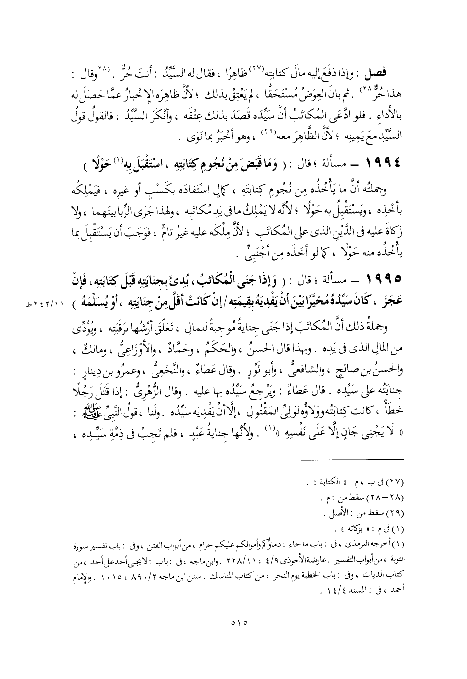 ١٩٩٤ - مسألة؛ قال: (وَمَا قَبَضَ مِنْ نُجُومِ كِتَابَتِهِ، اسْتَقْبَلَ بِهِ (١) حَوْلًا)