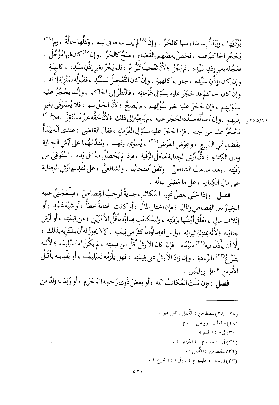 فصل: وإذا جَنَى بعضُ عَبِيدِ المُكاتَبِ جِنايةً تُوجِبُ القِصاصٍ، فلِلْمَجْنِىِّ عليه الخِيارُ بين القِصاصِ والمالِ؛ فإن اختارَ المالَ، أو كانت الجنايةُ خطأً، أو شِبْهَ عَمْدٍ، أو إتْلافَ مالٍ، تعَلَّقَ أرْشُها برَقَبَتِه، وللمُكاتَبِ فِداؤُه بأقَلِّ الأمْرينِ؛ من قِيمَتِه، أو أرْشِ جِنايَتِه؛ لأَنَّه بمنزلةِ شِرائِه، وليس له فِداؤُه بأكثرَ من قِيمَتِه، كما لا يجوزُ له أن يَشْتَرِيَه بذلك، إِلَّا أن يَأْذَنَ فيه (٣٢) سَيِّدُه. فإن كان الأرْشُ أقَلَّ من قِيمتِه، لم يكُنْ له تَسْلِيمُه؛ لأَنَّه يتَبَرَّعُ (٣٣) بالزِّيادةِ. وإن زادَ الأرْشُ على قِيمَتِه، فهل يَلْزَمُه تَسْلِيمُه، أو يَفْديه بأقَلِّ الأمرينِ؟ على رِوَايتَيْن.
