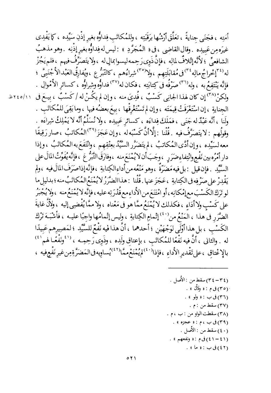 أمَتِه، فجَنَى جِنايةً، تعَلَّقَ أرْشُها برَقَبَتِه، وللمُكاتَبِ فِداؤُه بغيرِ إذْنِ سَيِّدِه، كما يَفْدِى غيرَه مِن عَبِيدِه. وقال القاضى، فى "المُجَرَّدِ": ليس له فِداؤُه بغيرِ إذْنِه. وهو مذهبُ الشافعىِّ؛ لأَنَّه إتْلافٌ لمالِه، فإِنَّ ذَوِى رَحِمه ليسوا بمالٍ له، ولا يتَصَرَّفُ فيهم، فلم يَجُزْ له [إخْراجُ مالِه] (٣٤) فى مُقابَلَتِهِم، ولا (٣٥) شِراءُهم، كالتّبَرُّعِ، ويُفارِقُ العَبْد الأجْنَبِىَّ؛ فإنَّه يَنْتَفِعُ به، وله (٣٦) صَرْفُه فى كِتابَتِه، فكان له (٣٧) فداؤُه وشِراؤُه، كسائرِ الأمْوالِ. ولكنْ (٣٨) إن كان لهذا الجانى كَسْبٌ، فُدىَ منه، وإن لم يكُنْ له كَسْبٌ، بِيعَ فى الجِنايةِ، إن اسْتَغْرَقَتْ قِيمَتَه، وإن لم تَسْتَغْرِقْها، بِيعَ بعضُه فيها، وما بَقِىَ للمُكاتَبِ. ولَنا، أنَّه عَبْدٌ له جَنَى، فمَلَكَ فِداءَه، كسائرِ عَبِيدِه، ولا نُسَلِّمُ أنَّه لا يَمْلِكُ شِراءَه. وقولُهم: لا يتَصَرَّفُ فيه. قُلْنا: إِلَّا أَنَّ كَسْبَه له، وإن عَجزَ (٣٩) المُكاتبُ، صار رَقِيقًا معه لسَيِّدِه، وإن أدَّى المُكاتبُ، لم يتَضَرَّر السَّيِّدُ بعِتْقِهِم، وانْتَفَعَ به المُكاتَبُ، وإذا دار أمْرُه بين نَفْعِ وانْتِفاءِ ضَرَرٍ، وجَبَ أن لا يُمْنَعَ منه، وفارَقَ التَّبَرُّعَ، فإنَّه يُفَوِّتُ المالَ على السَّيِّدِ. فإن قيل: بل فيه مَضَرّةٌ، وهو مَنْعُه من أداءِ الكِتابةِ، فإنَّه إذا صَرَفَ المالَ فيه، ولم يَقْدِرْ على صَرْفِه فى الكِتابةِ، عَجَزَ عنها. قُلْنا: هذا الضَّرَرُ لا يُمْنَعُ المُكاتَبُ منه؛ بدليلِ ما لو تَرَكَ الكَسْبَ مع إمْكانِه، أو امْتَنَعَ من الأداءِ مع قُدْرَتِه عليه، فإنَّه لا يُمْنَعُ منه، ولا يُجْبَرُ على كَسْب ولا أدَاءٍ، فكذلك لا يُمْنَعُ ممَّا هو فى مَعْناه، ولا ممَّا يُفْضِى إليه، ولأنَّ غايةَ الضَّرَرِ فى هذا، المَنْعُ من (٤٠) إتْمامِ الكِتابةِ، وليس إتْمامُها واجِبًا عليه، فأشْبَهَ تَرْكَ الكَسْبِ، بل هذا أوْلَى لوَجْهَيْنِ؛ أحدهما، أَنَّ هذا فيه نَفْعٌ للسَّيِّدِ؛ لمَصِيرِهم عَبِيدًا له. والثانى، أَنَّ فيه نَفْعًا للمُكاتَبِ، بإعتاقِ ولَدِه، وذَوِى رَحِمِه، [ونَفْعًا لهم] (٤١) بالإِعْتاقِ، على تَقْديرِ الأداءِ، فإذا (٤٠) لم يُمْنَعْ ممَّا (٤٢) يُساوِيه فى المَضَرَّةِ مِن غيرِ نَفْعٍ فيه،